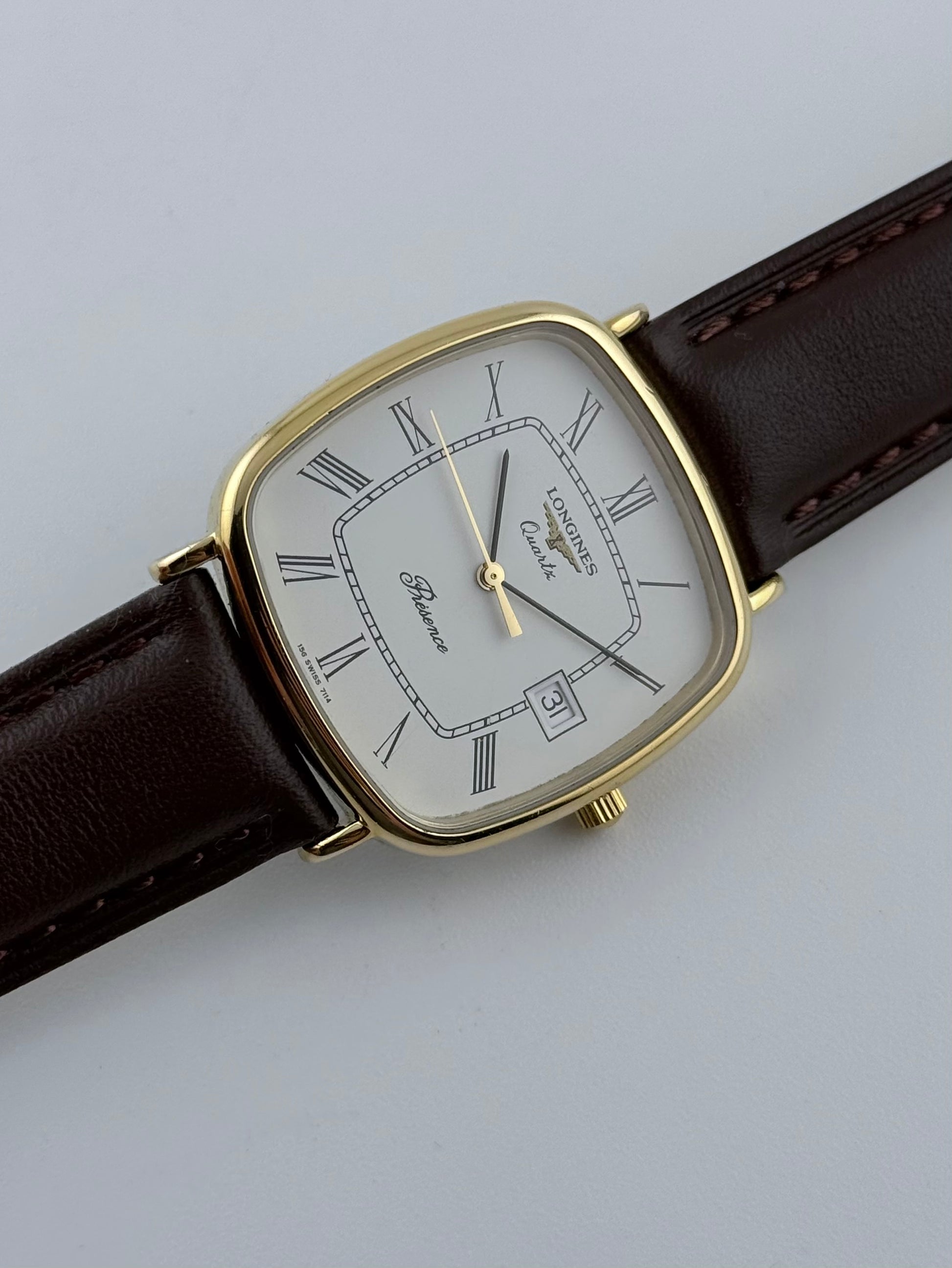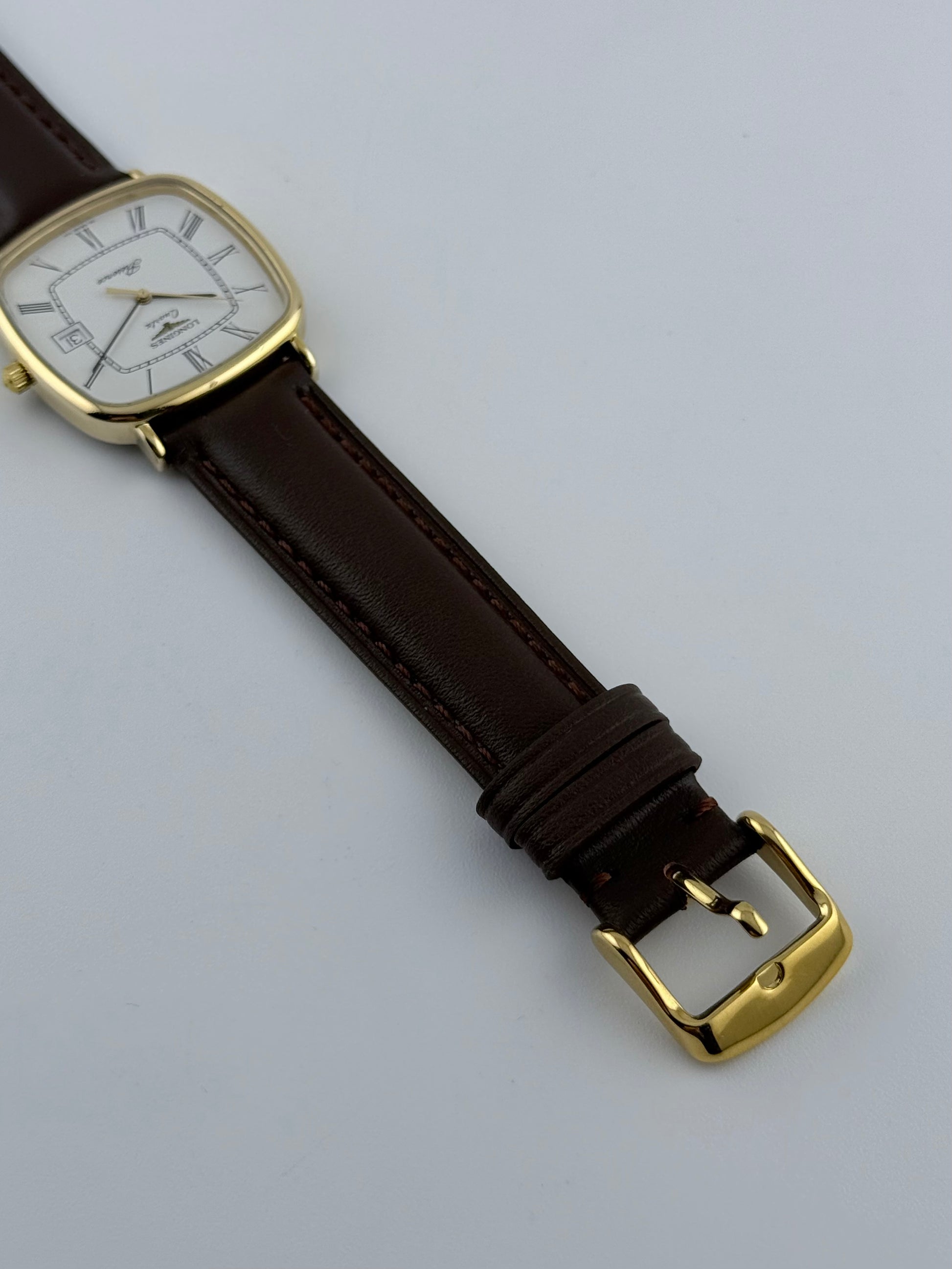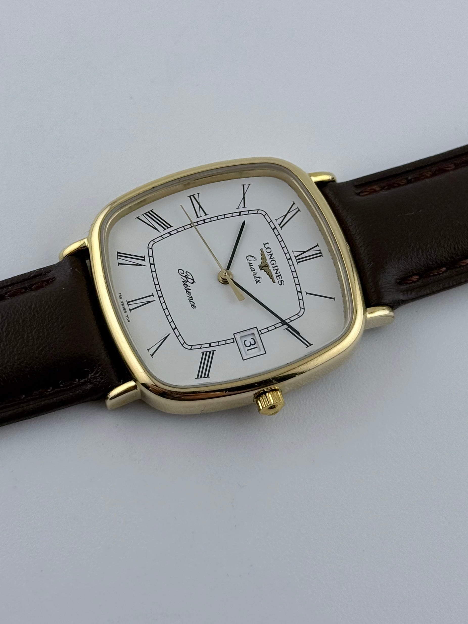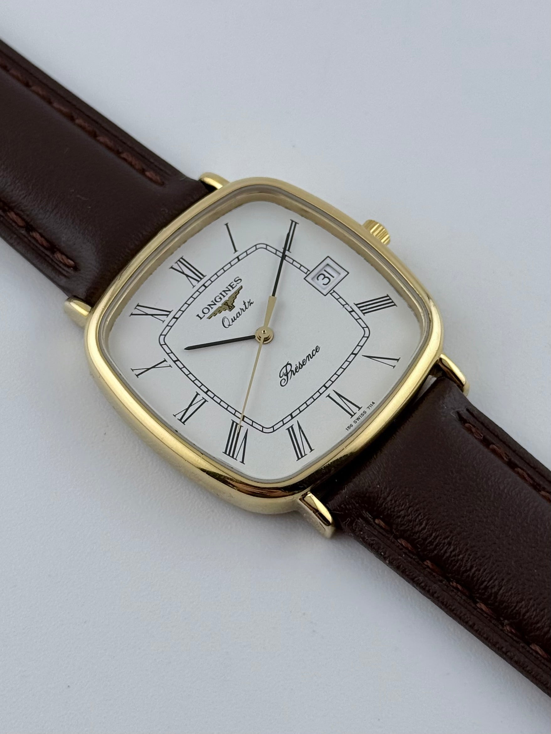This is a wonderful vintage gold plated Longines Quartz featuring a stylish square 1960s TV case with crisp white dial, minutes rail track and Roman numerals as well as a fully working date complication. This piece is in fantastic condition for its age, working perfectly and keeping great time.