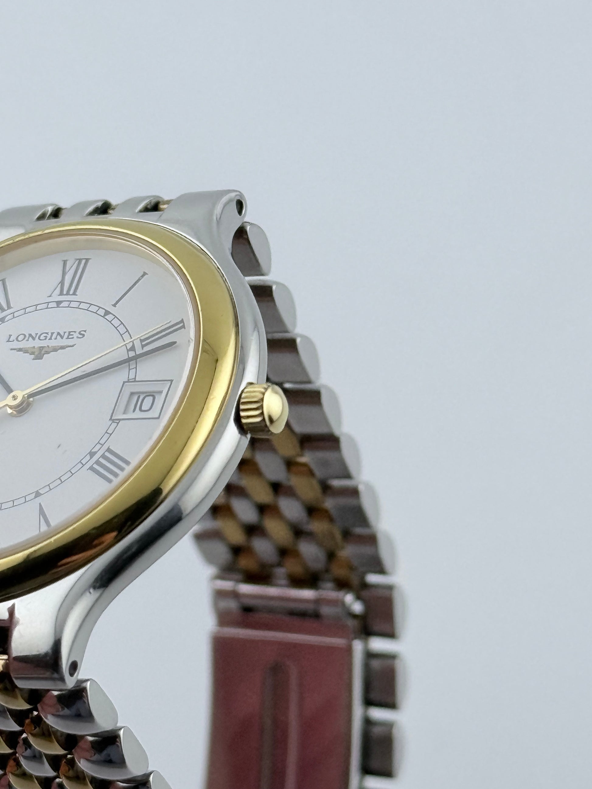 This is a stunning vintage Longines Quartz which is in absolutely excellent condition for its age, showing minor signs of wear. The beautiful white dial includes Roman numerals with a fully functioning date complication. The watch also has its original bracelet which complements the watch beautifully. The watch is keeping excellent time.