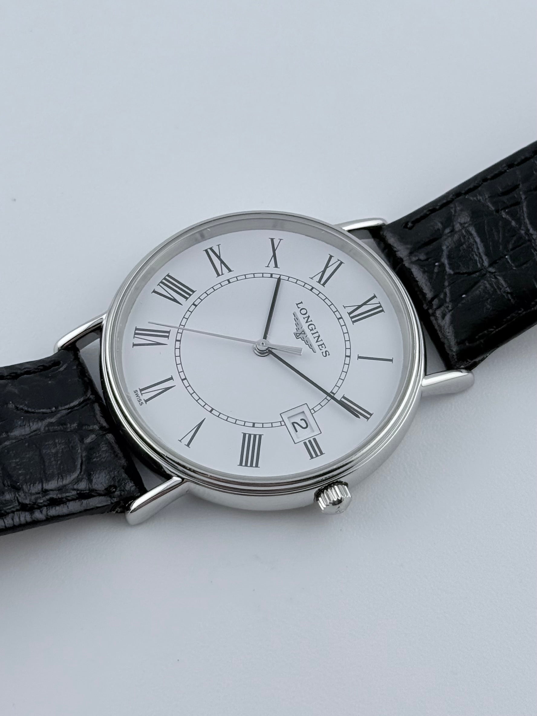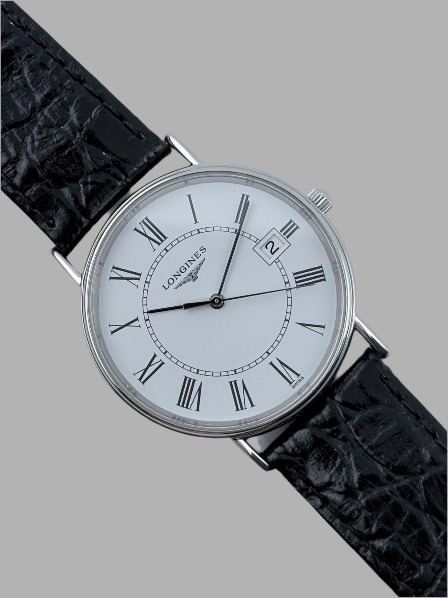 This is a wonderful vintage Longines Quartz which is in superb condition showing just light wear throughout. It comes in its original inner presentation box and outerbox along with the booklet. The watch features a stunning white dial with black Roman Numerals and a fully functional date complication. This elegant watch works perfectly and is keeping great time.