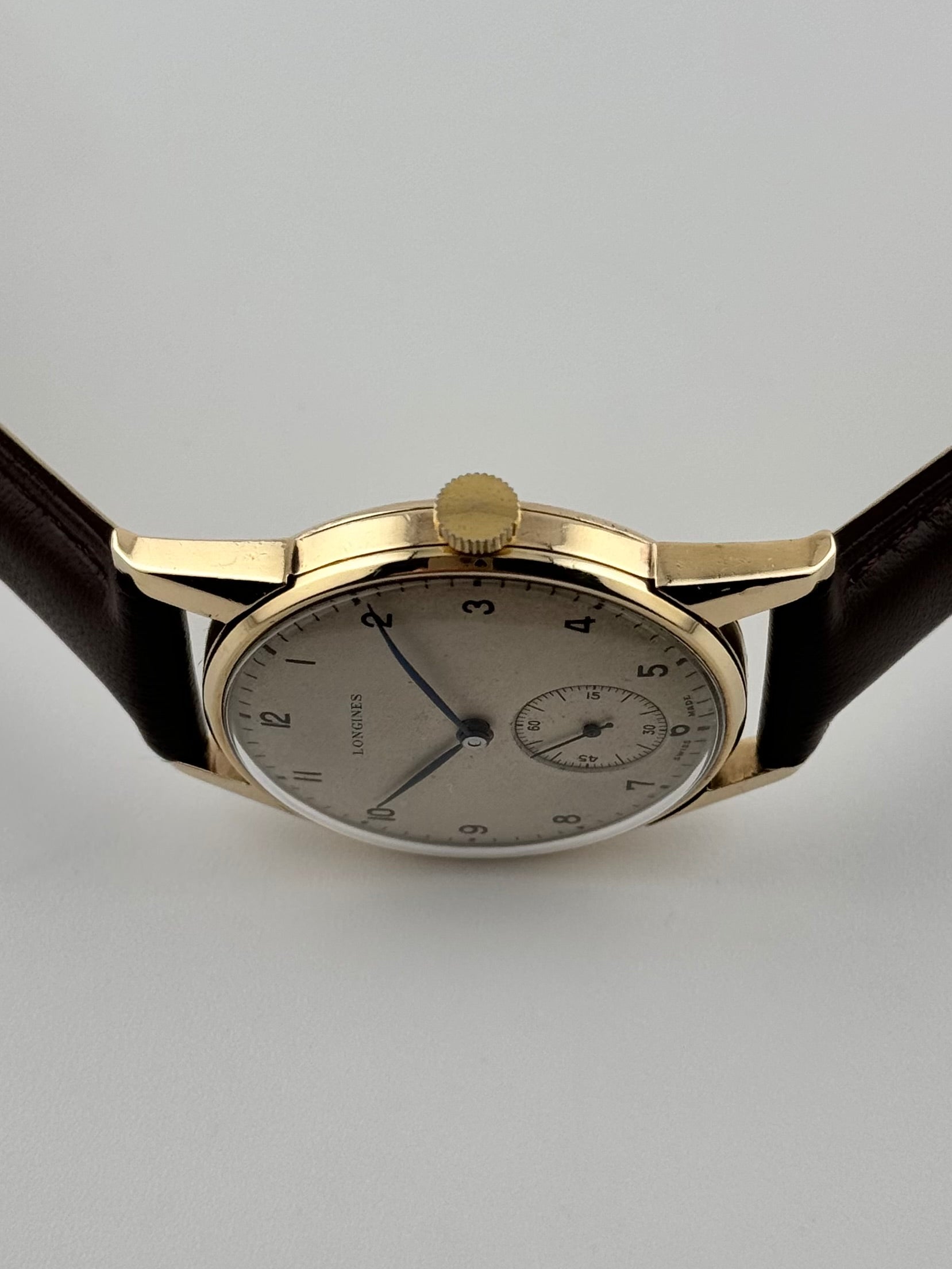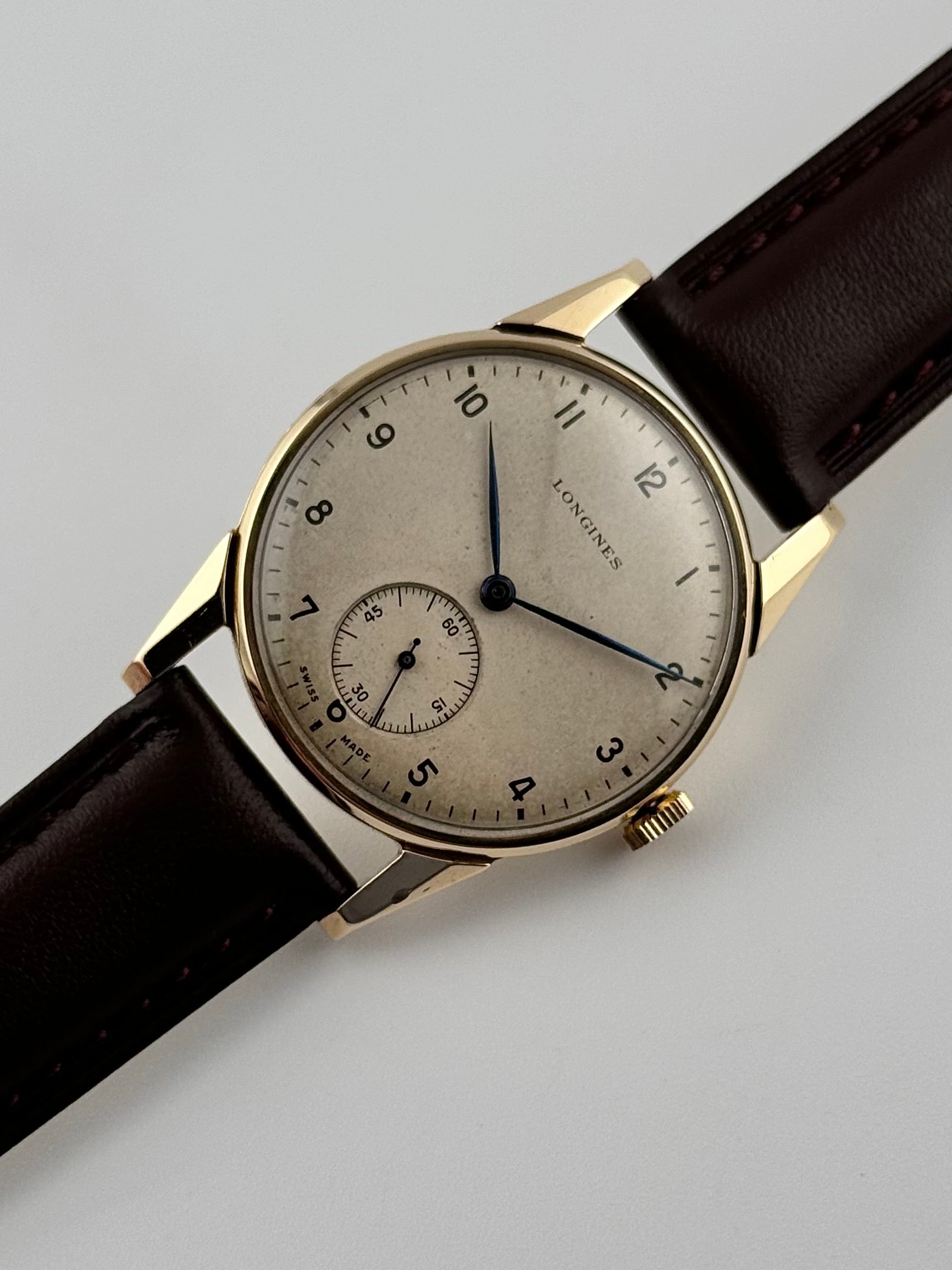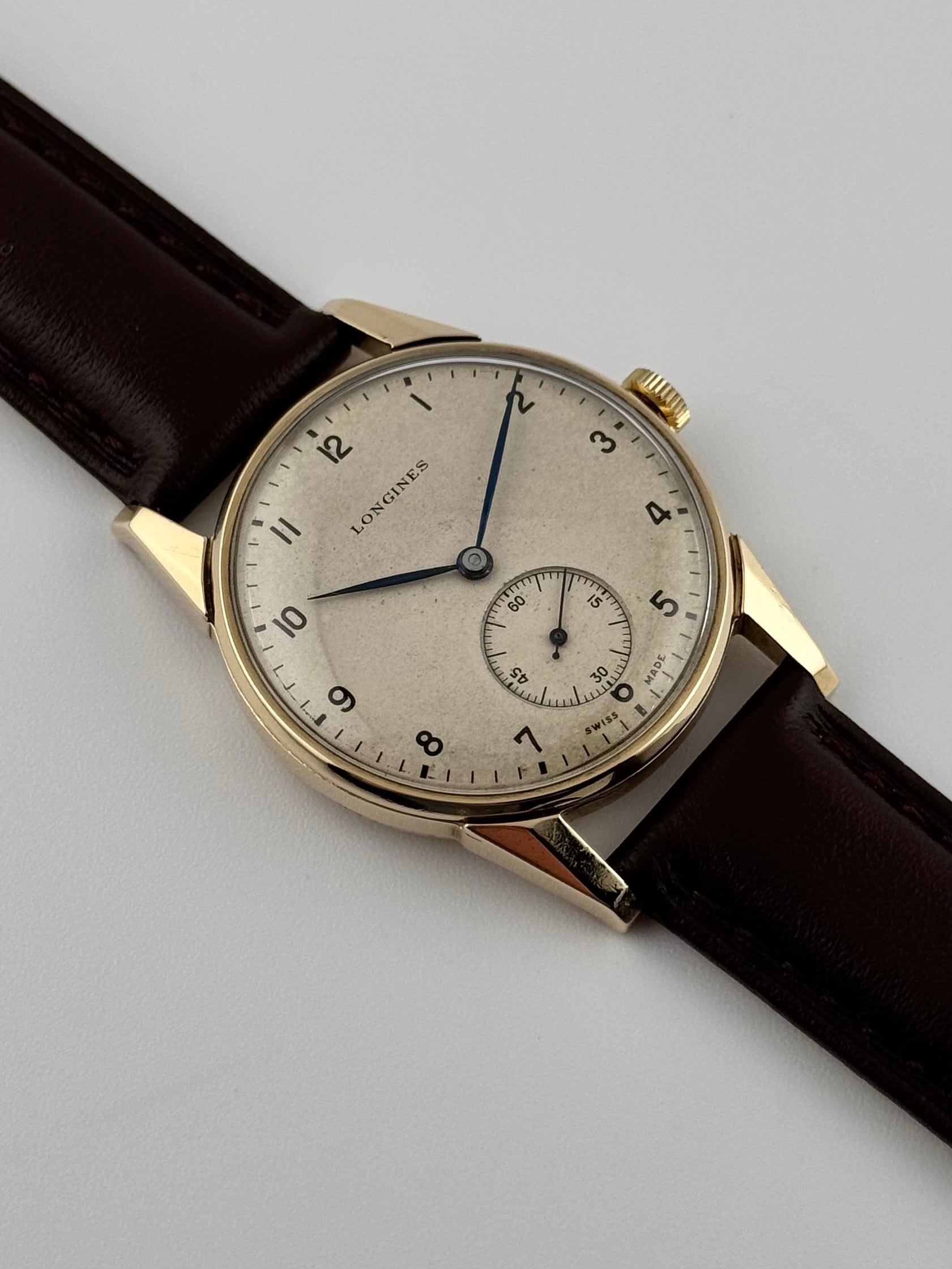 This is an absolutely incredible vintage Longines from the 1940s! This particular example is rather rare, featuring a beautifully aged vintage dial with blued hands and sub seconds encased in 9K gold case. The watch itself is in excellent condition for its age and shows limited signs of wear. This fabulous and classy time piece has just been serviced and is working perfectly, keeping great time within specification.