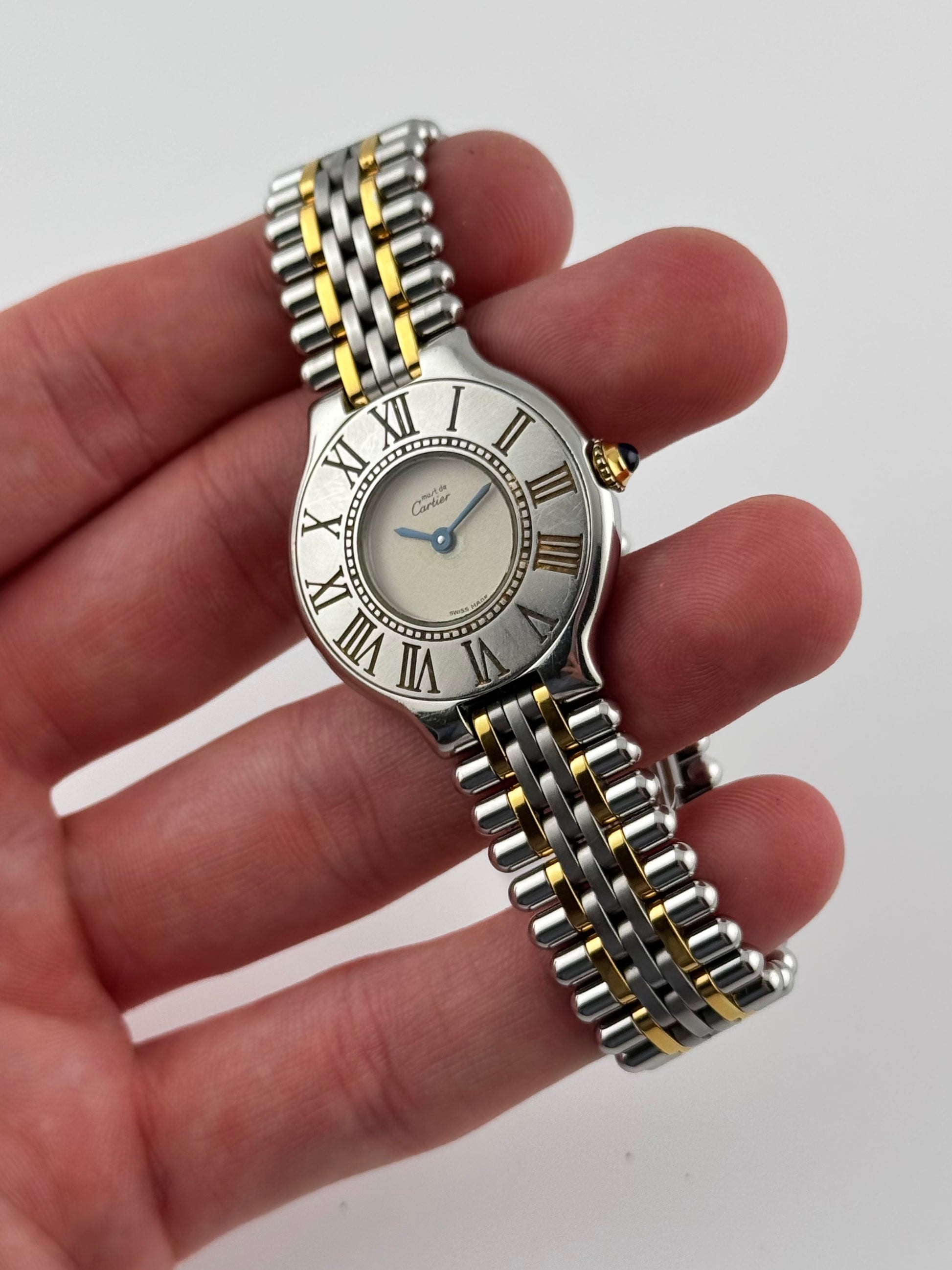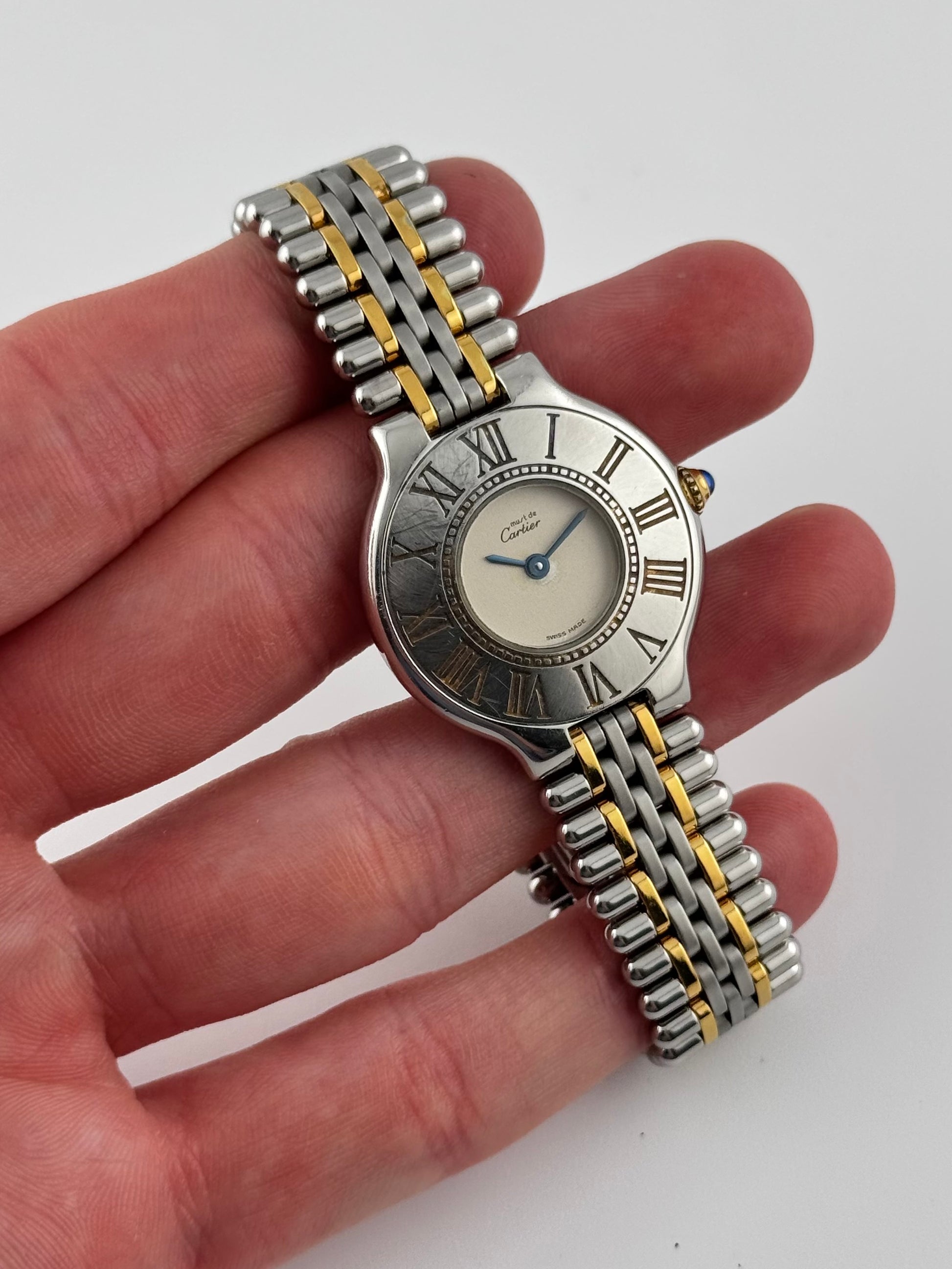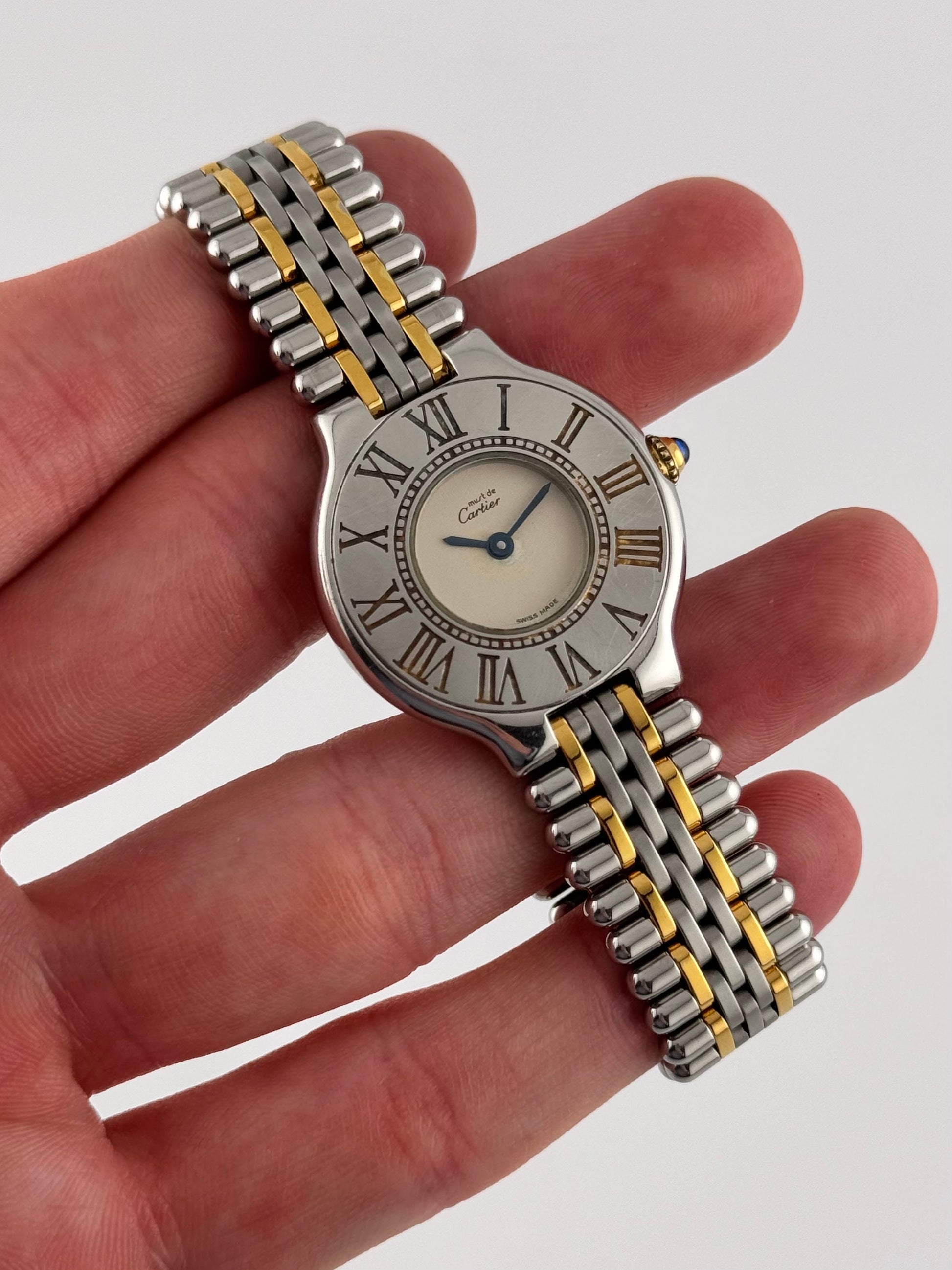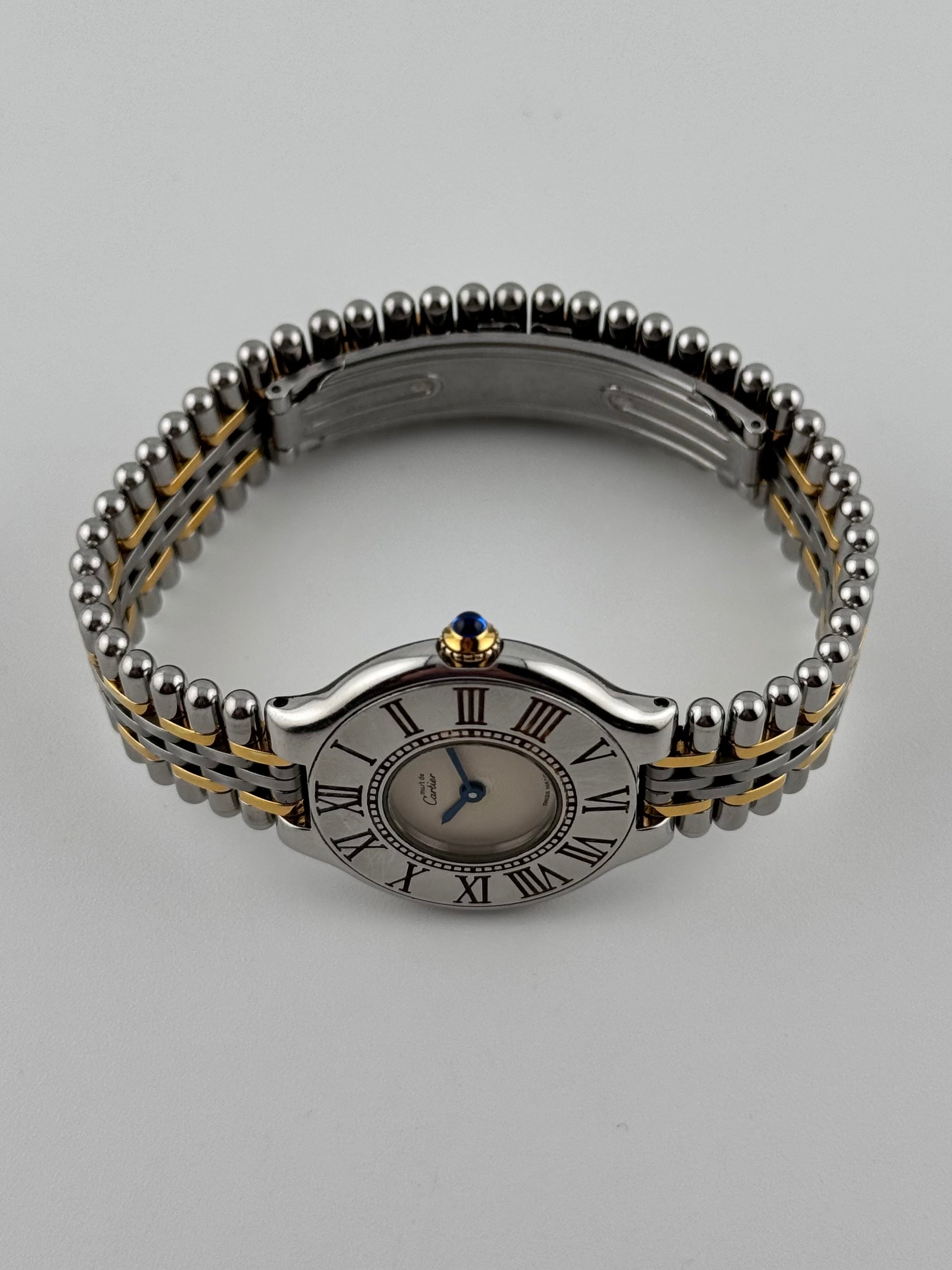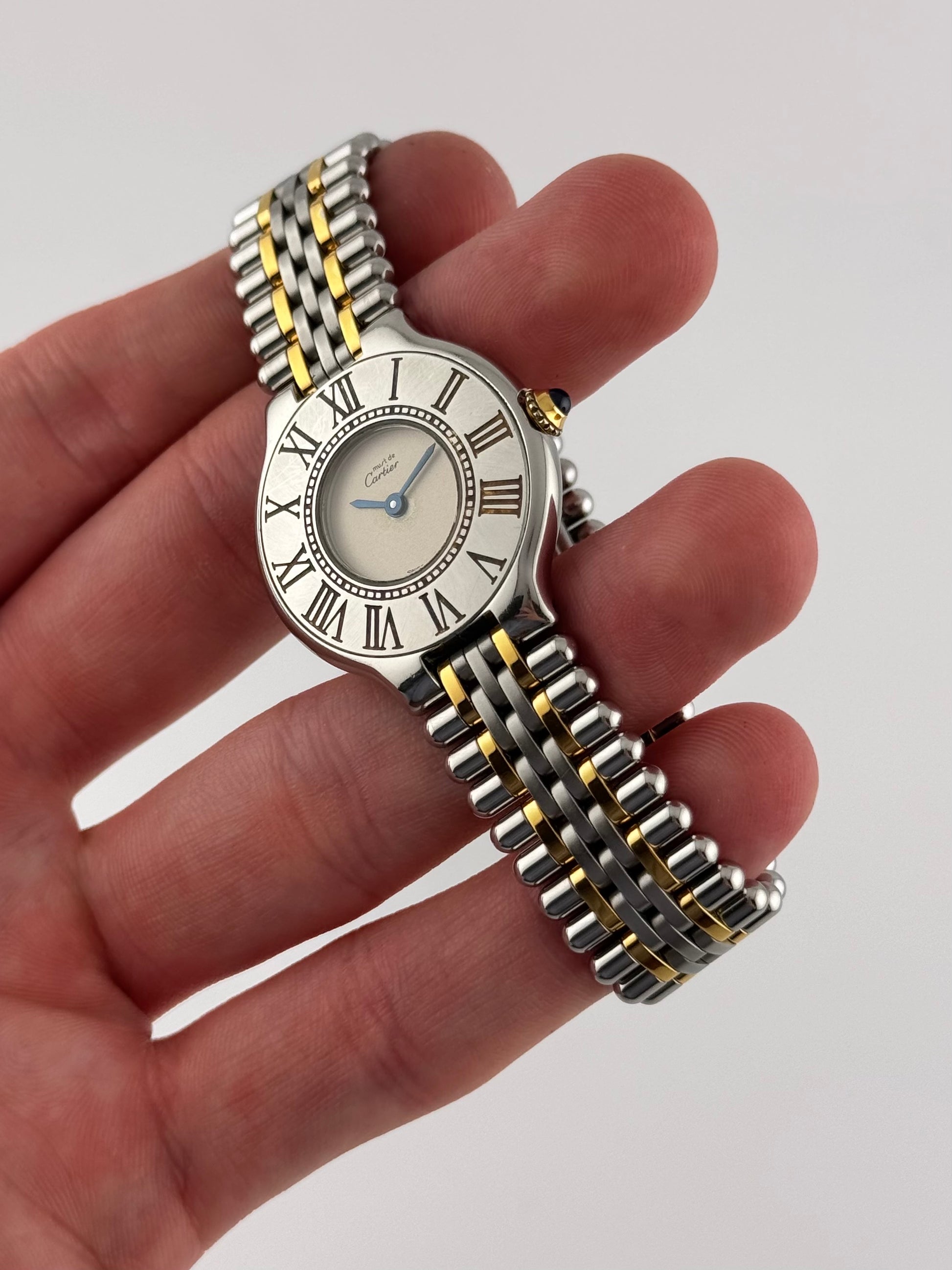 This is an absolutely stunning and classy vintage Must De Cartier 21 which boasts a classy and elegant look featuring Cartier signature sword blued hands with a fascinating story of production, crown jewel and a rail track on a bezel with large Roman numerals. This piece also features a two tone, original bracelet all of which is in good vintage condition. This stylish timepiece is a unisex watch suited to both a lady and a gentleman and is in perfect working order!