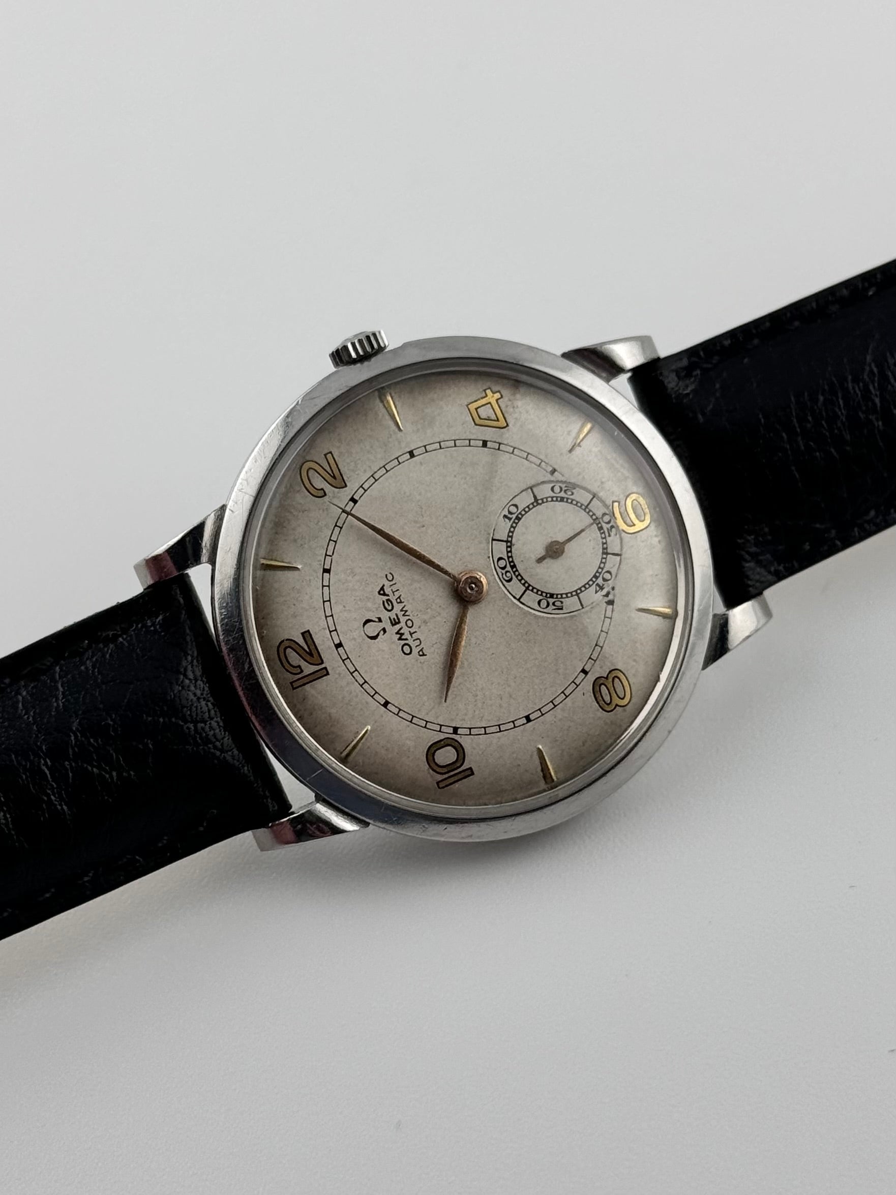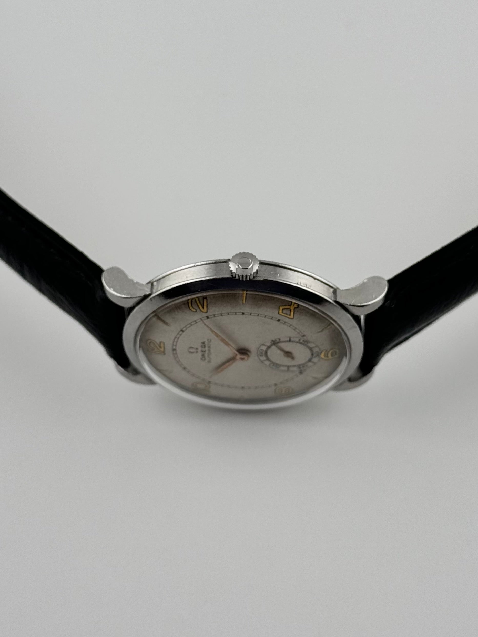 This is a stunning vintage Omega dating back to 1947. This watch might be 78 years old, but it still carries great presence and looks fabulous on the wrist. The combination of a large case size with the patinated off white dial which carries gold arabic numerals along with a sub seconds dial makes it a real find. It really is a beautiful watch and to make sure everything is as it should be we have just given it a full service. The movement is running perfectly and keeping great time, well within specification. Please study the pictures as they form part of the description.