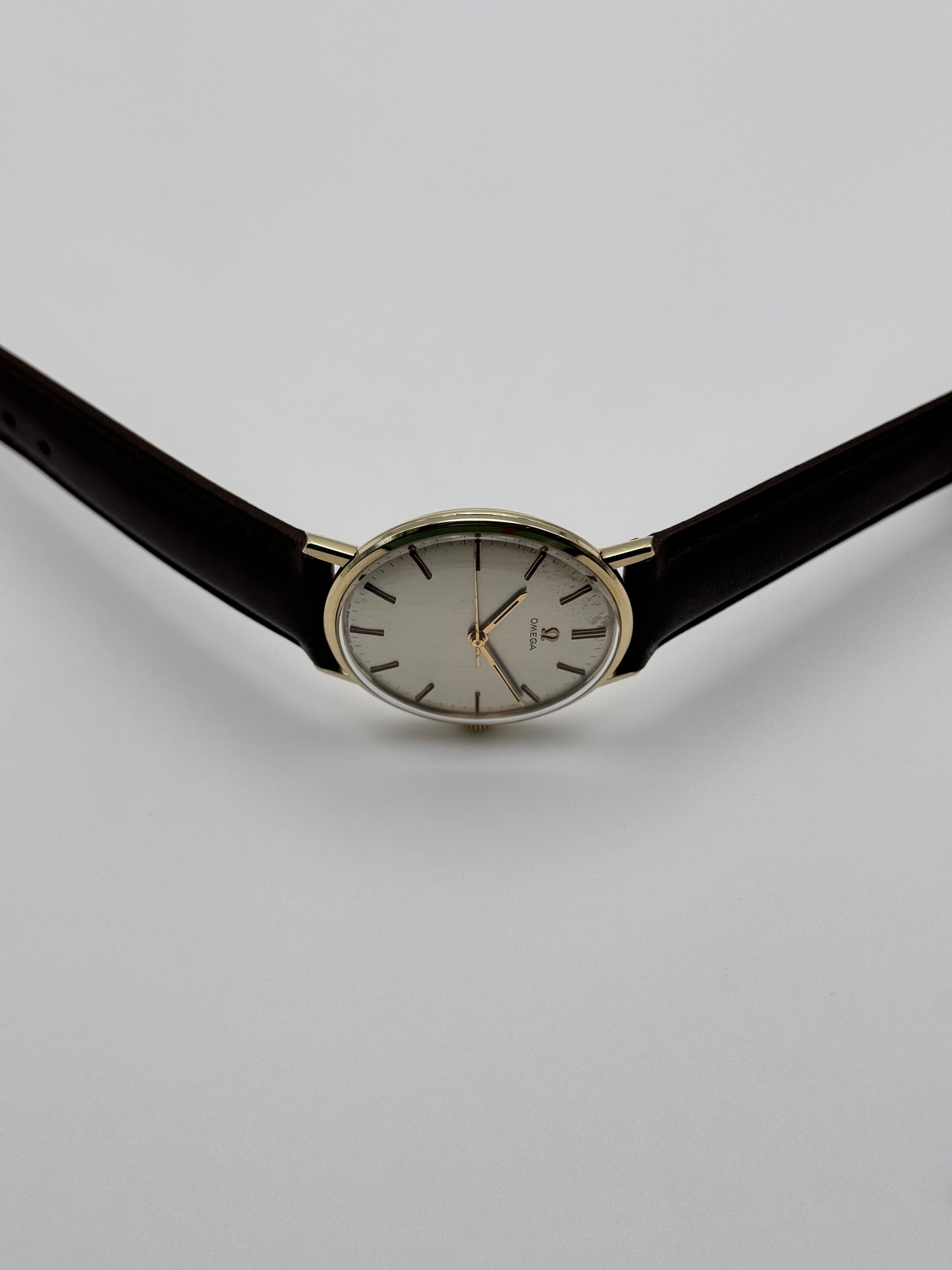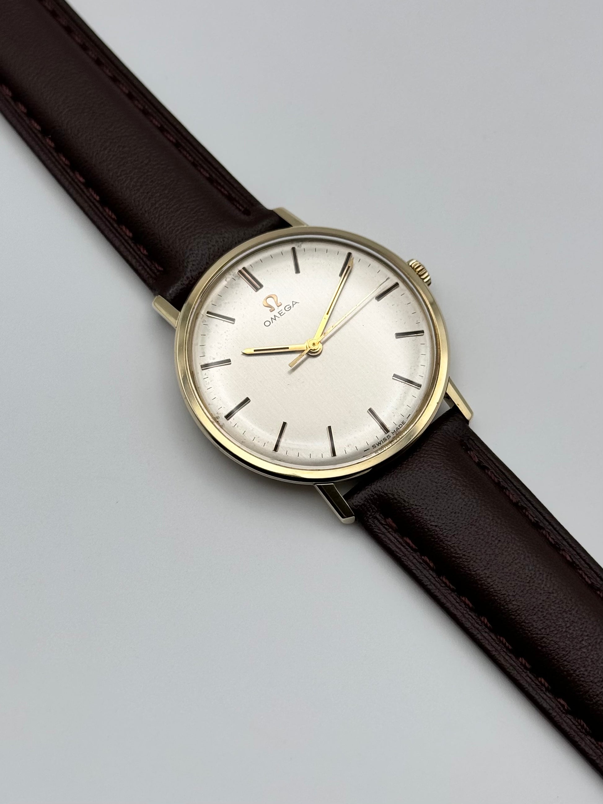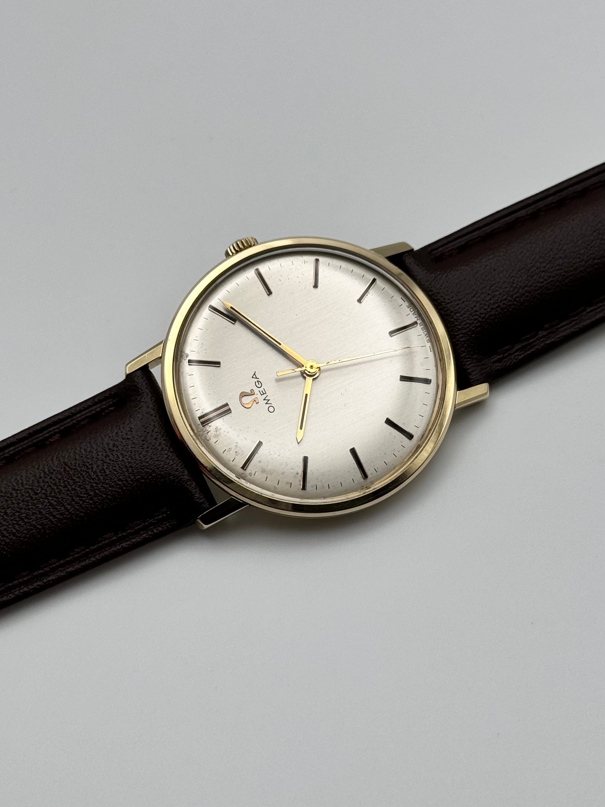 This is a stunning solid 9ct gold Omega Geneve Automatic from the 1960s. The watch is in overall spectacular condition for a watch of this age. This piece features a 9ct yellow gold case which holds a stunning silver brushed dial. Mechanically this watch is in excellent condition and keeping good time within specification.