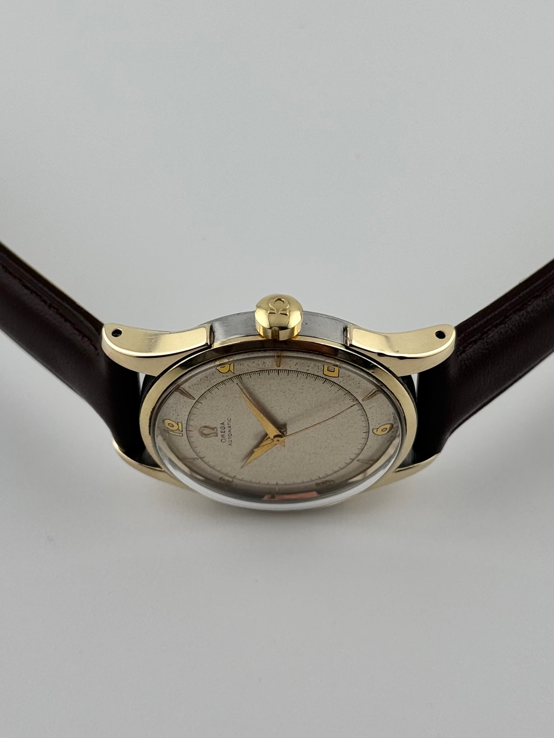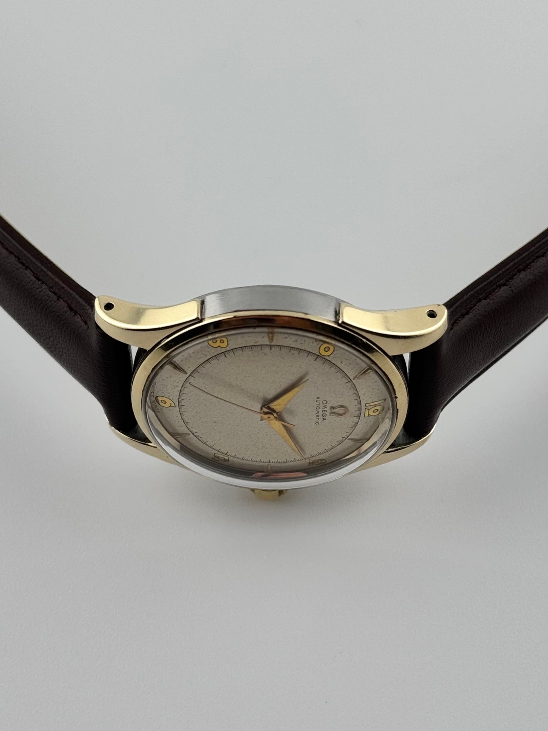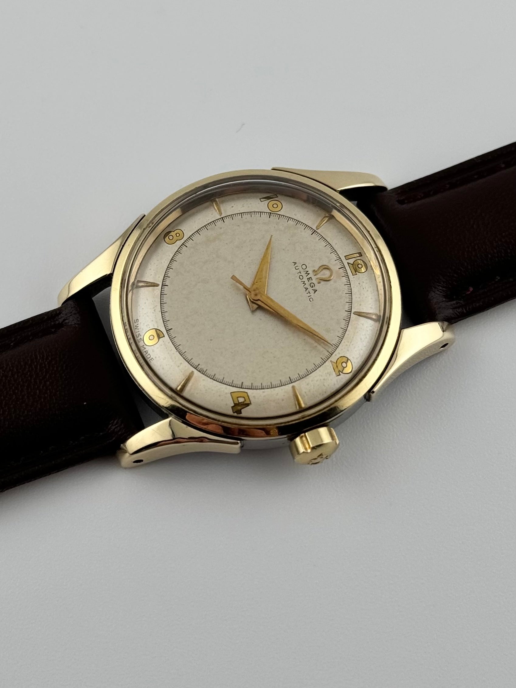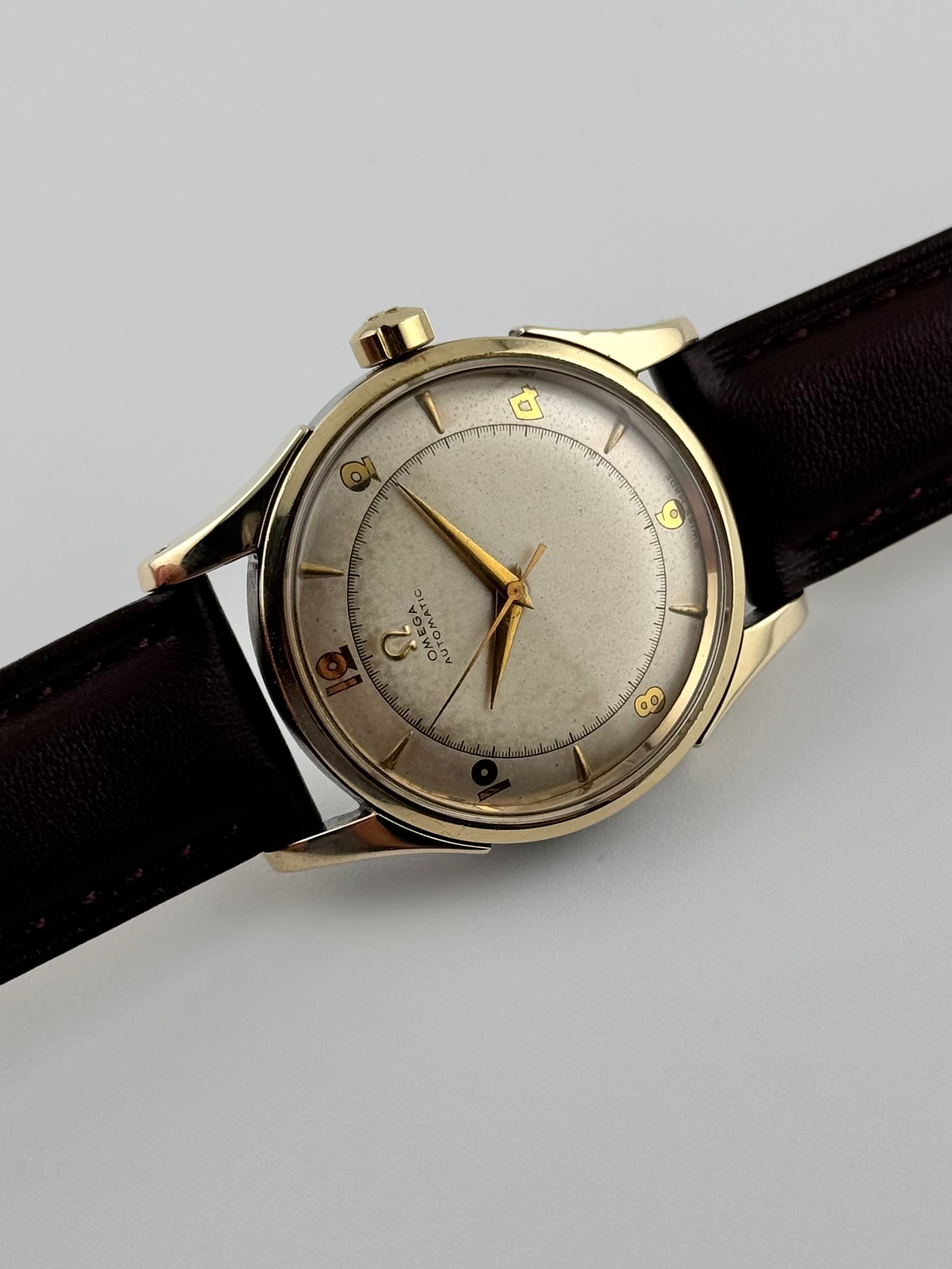 This is a spectacular vintage Omega Automatic Bumper from 1950 which features a stunning two tone dial. It really looks fabulous with the gold Arabic numerals and Dauphine hands. The modest patination just adds to the aesthetic appeal of this watch. This watch is in excellent condition for its age showing just minor wear and is keeping excellent time.