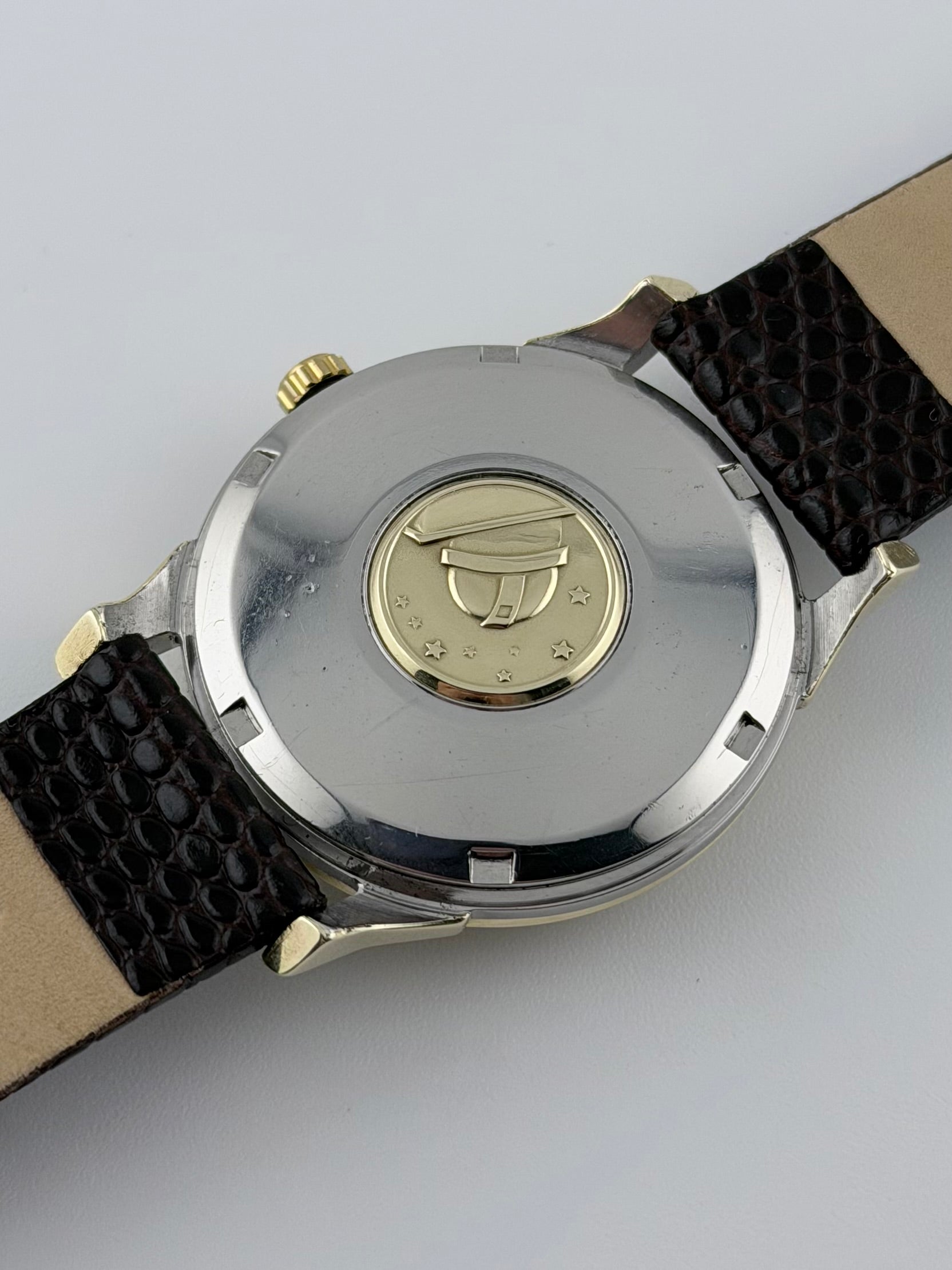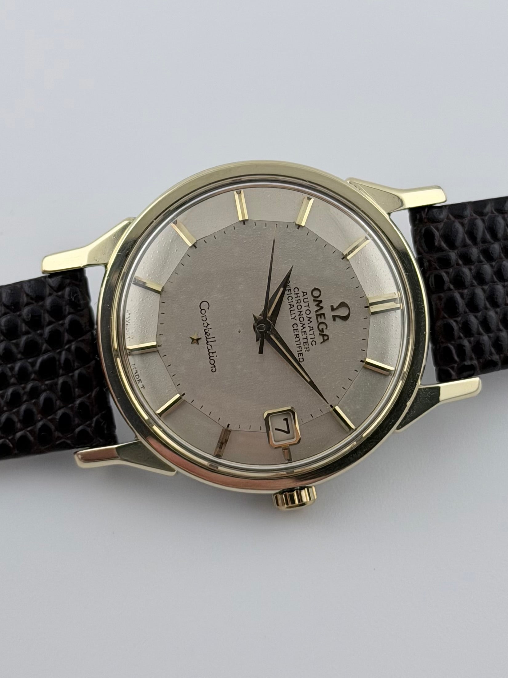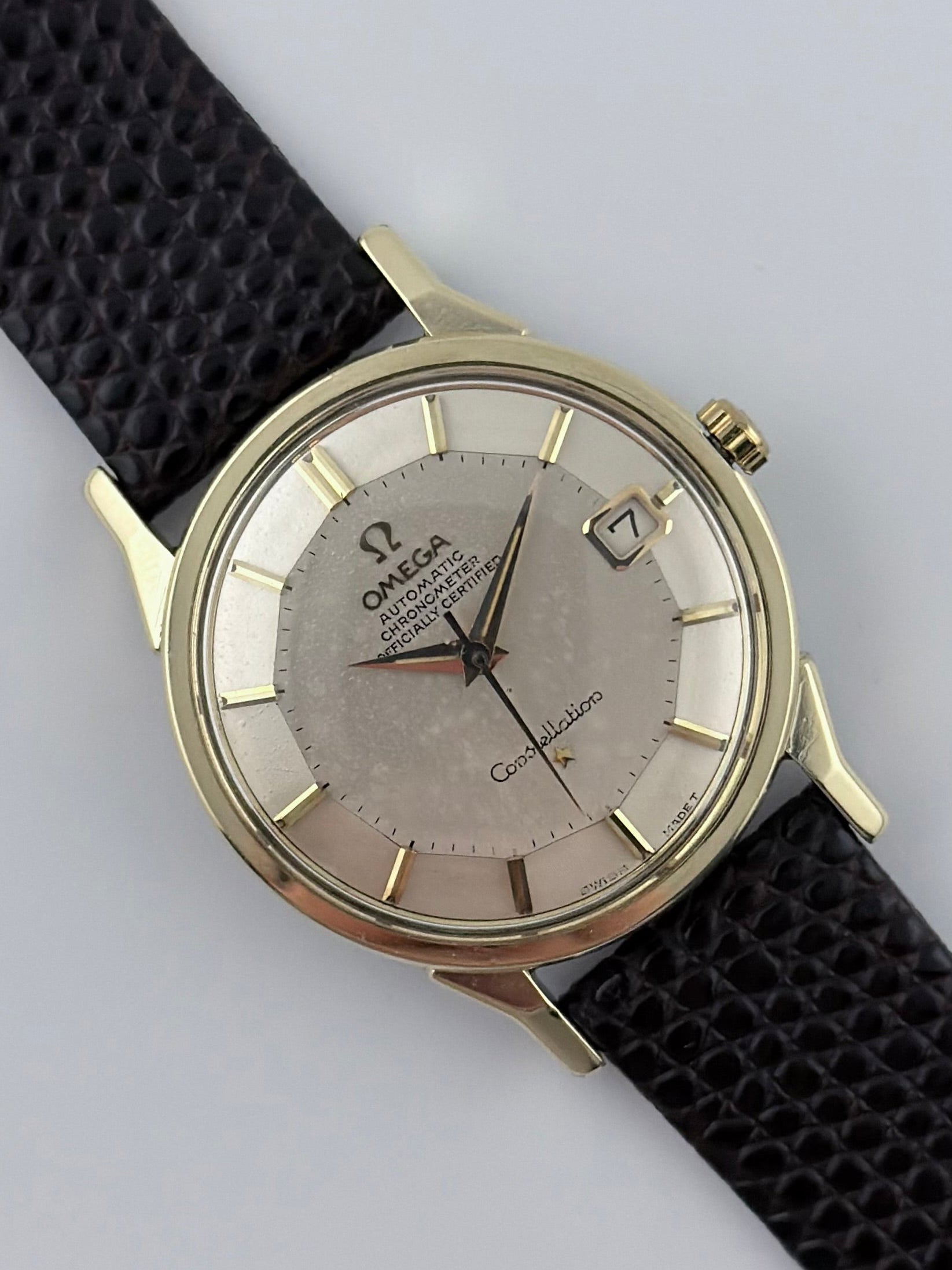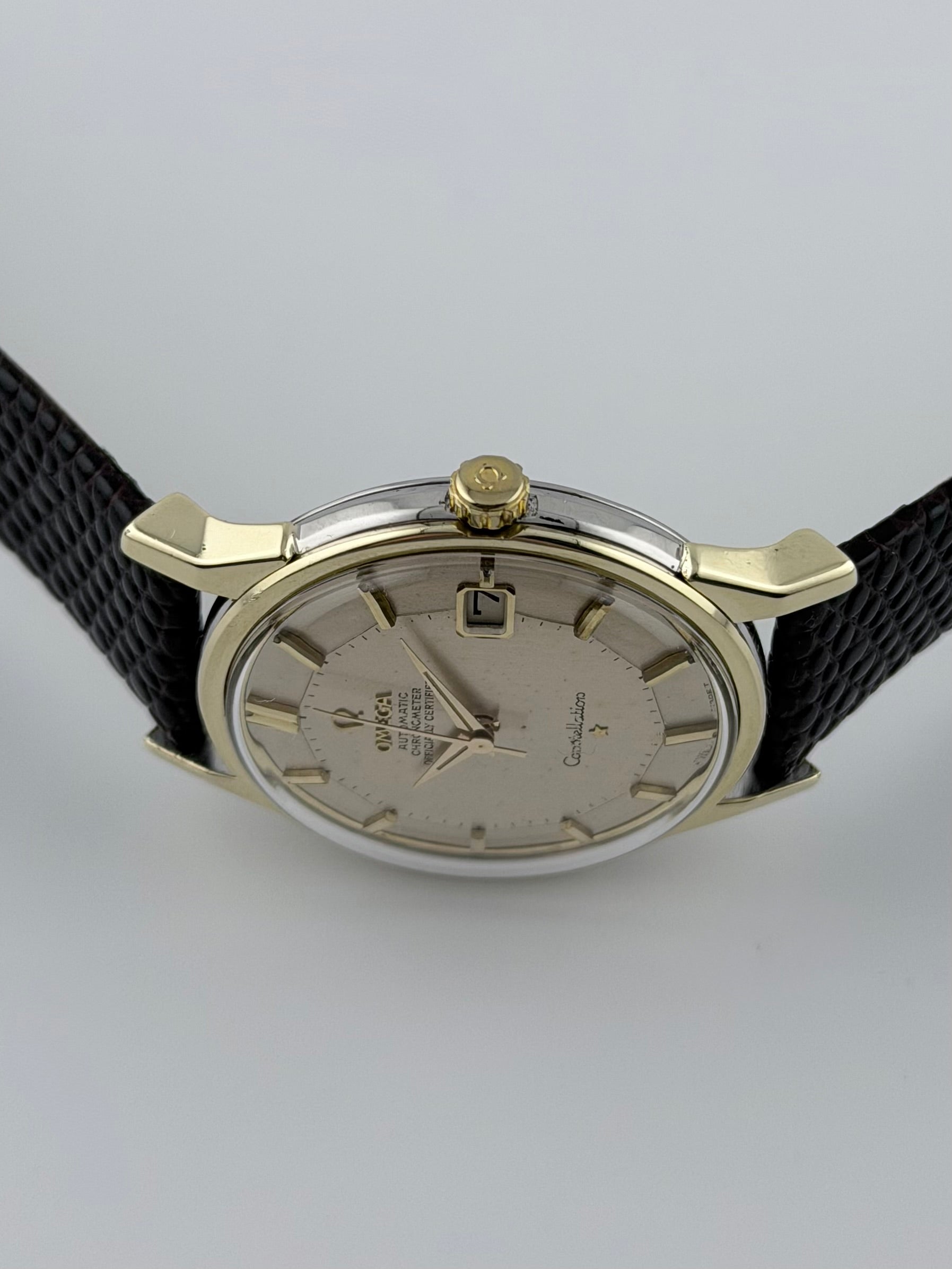 This Omega Constellation Pie Pan Chronometer features an extremely desirable silver Pie Pan dial encased in a rare dog leg lugs case with a gold plated front and a stainless steel back. It is one of the most sought after variants of the Pie Pan dial.