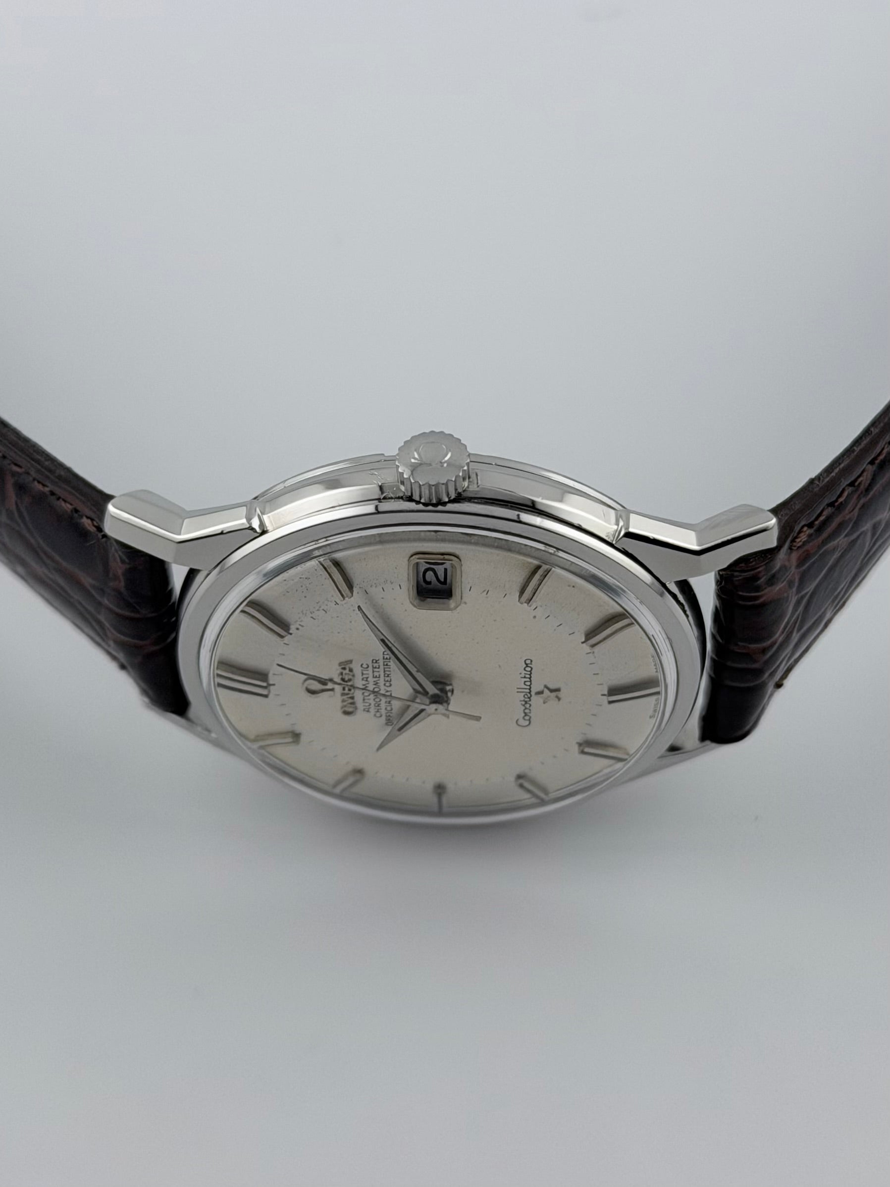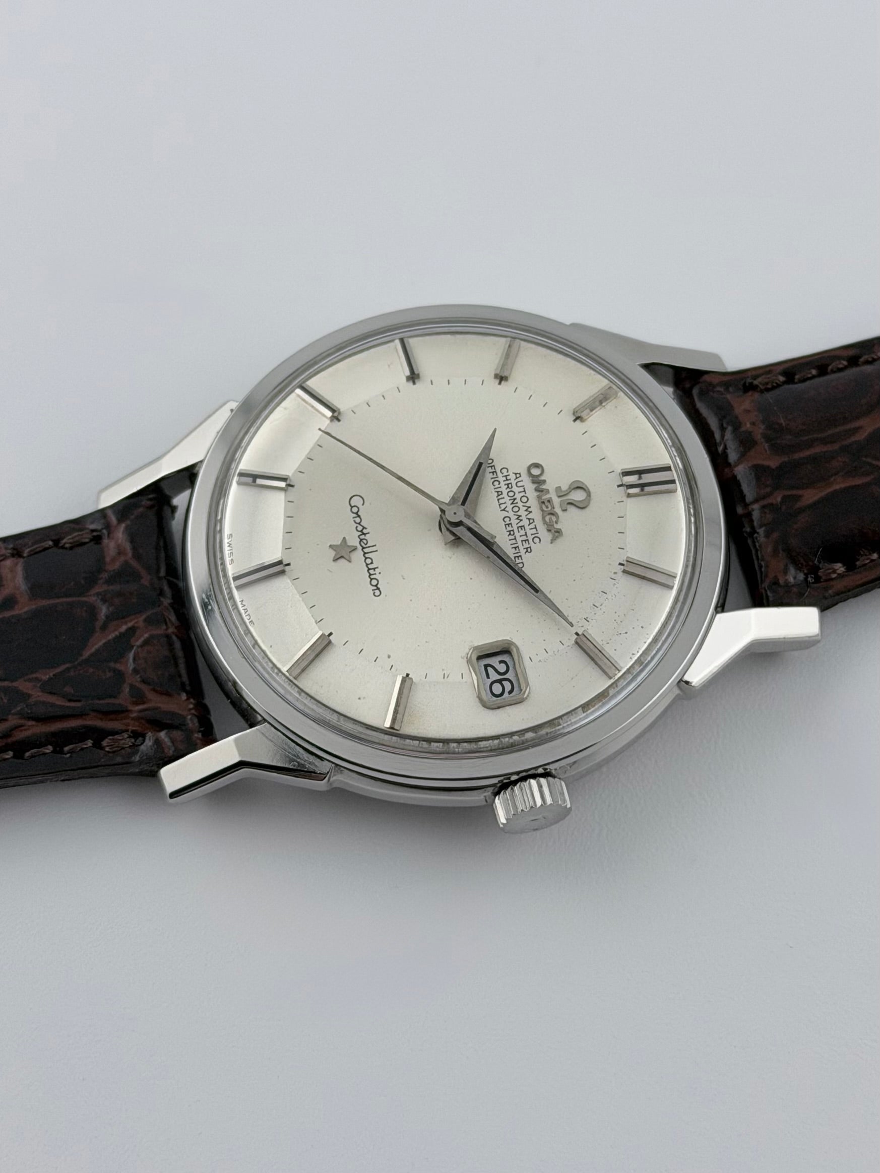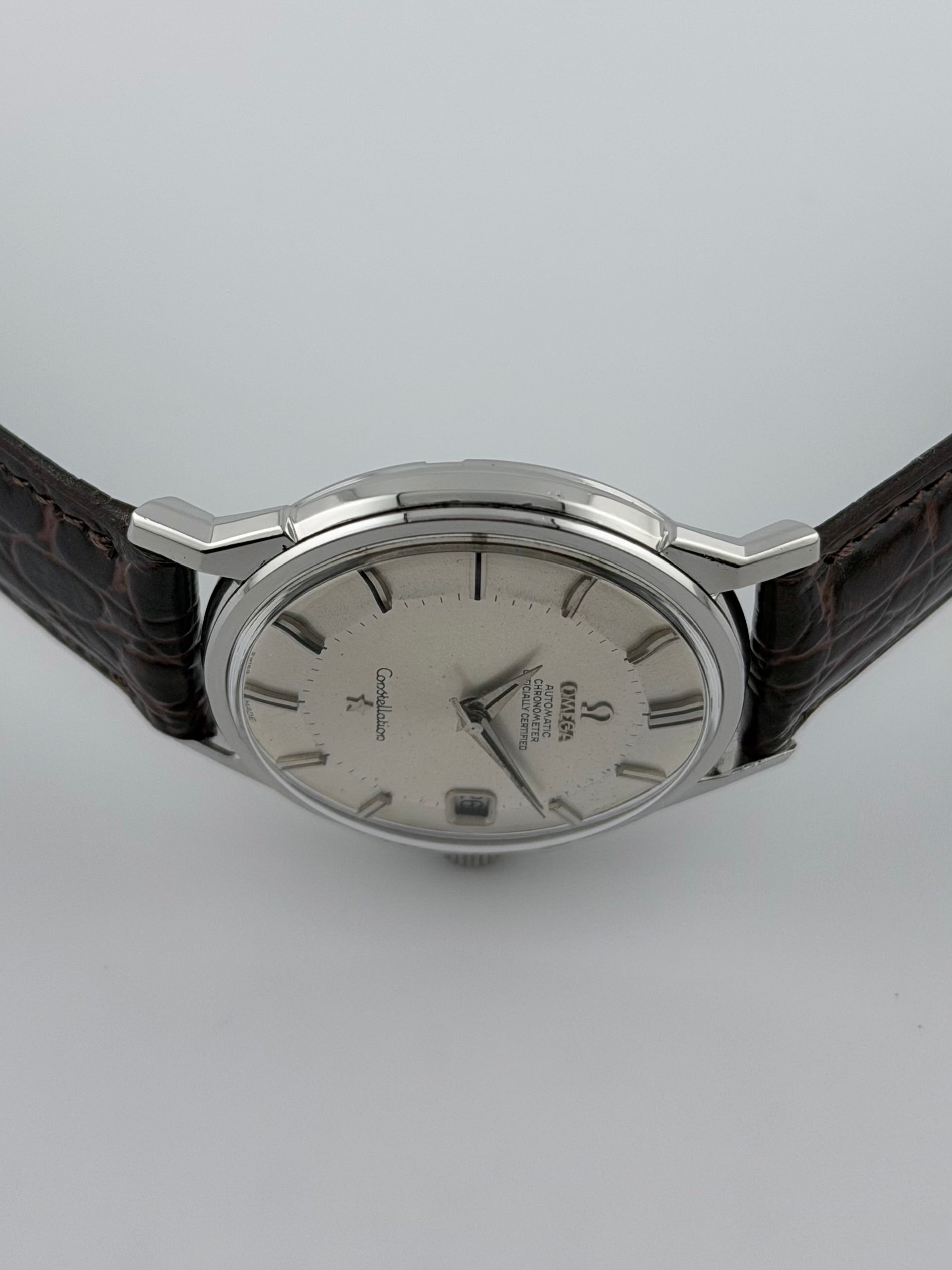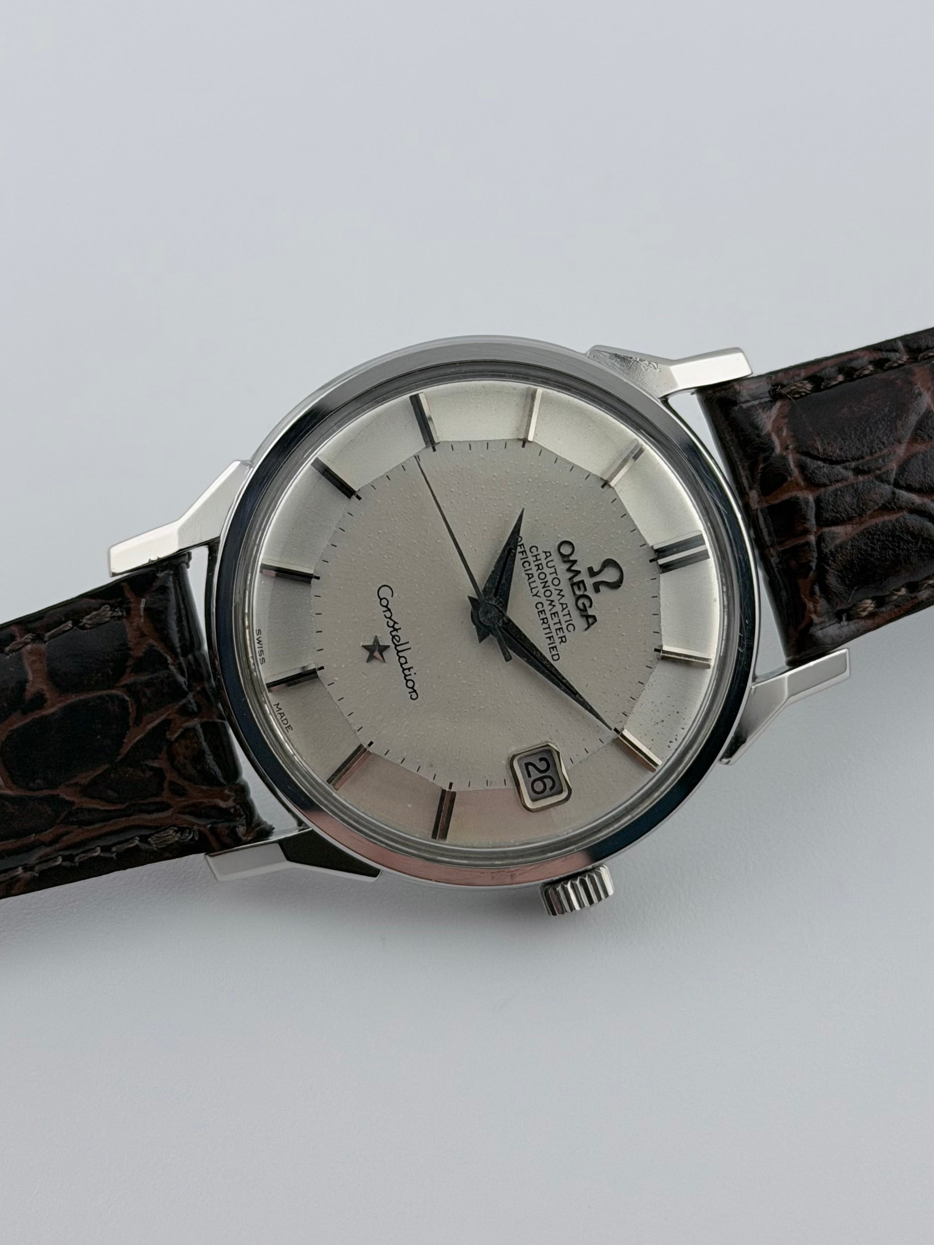 This is a beautifully preserved Omega Constellation Automatic from the 1960s, featuring the highly desirable multi-faceted dial with elegant dauphine hands and a date complication. The attractive dial is encased in a stainless steel case with the highly sought after dog-leg lugs. Close inspection reveals a fine patina across the dial which adds real character to what is a very well preserved watch.