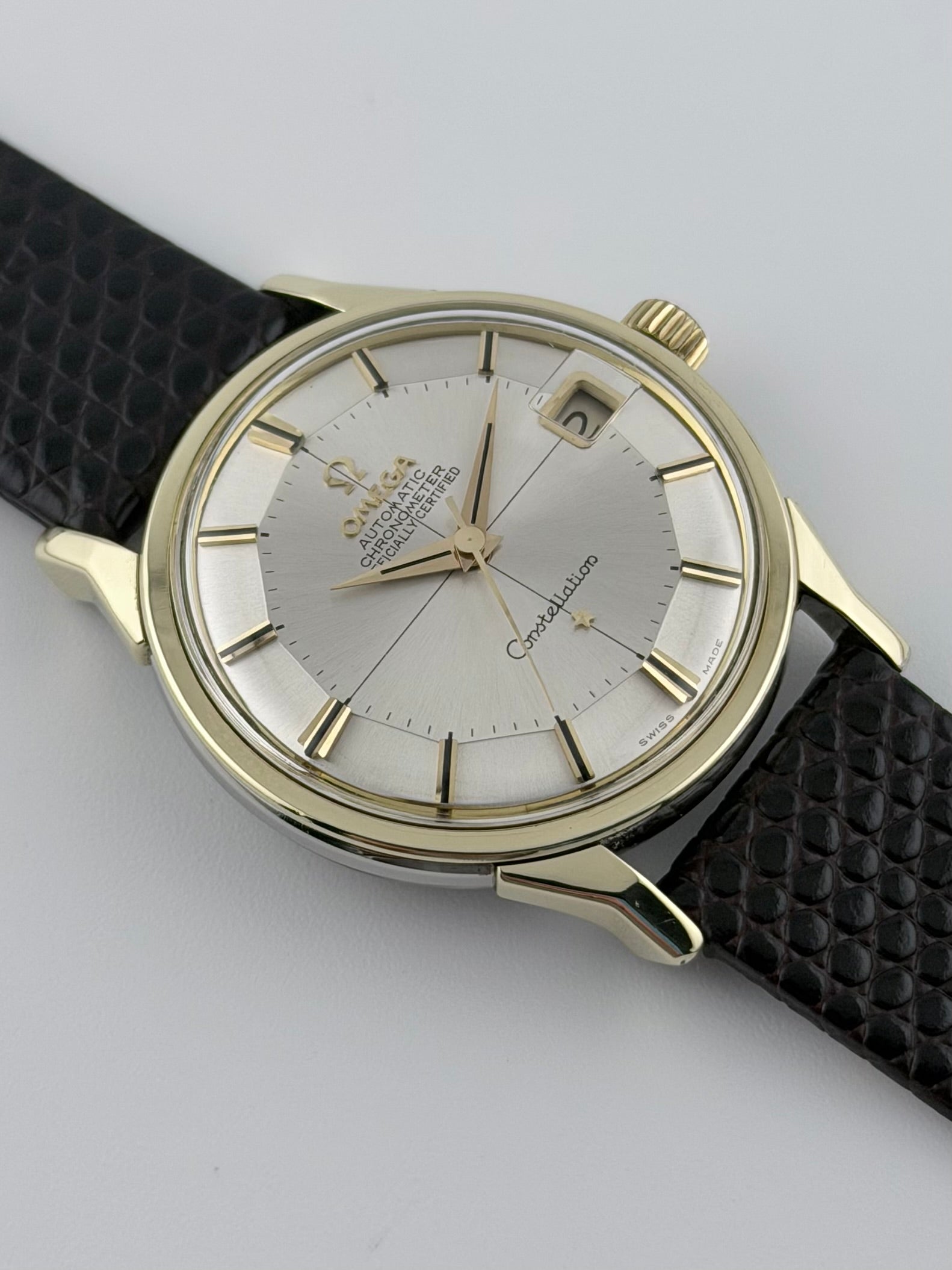 This Omega Constellation Pie Pan is a classic vintage dress watch with iconic 1960s-era style and timeless elegance. Featuring an extremely desirable silver sunburst Pie Pan dial housed in a gold-plated case, that also includes special dog leg lugs and refined markers and dauphine hands, radiates subtle luxury on the wrist. Powered by a reliable automatic movement and finished with the distinctive gold Constellation observatory emblem on the case back, it is a superb choice for collectors and enthusiasts seeking an elegant, historically iconic Omega. It is one of the most sought after variants of the Pie Pan dial in truly exceptional condition both cosmetically and mechanically for a watch of this age.