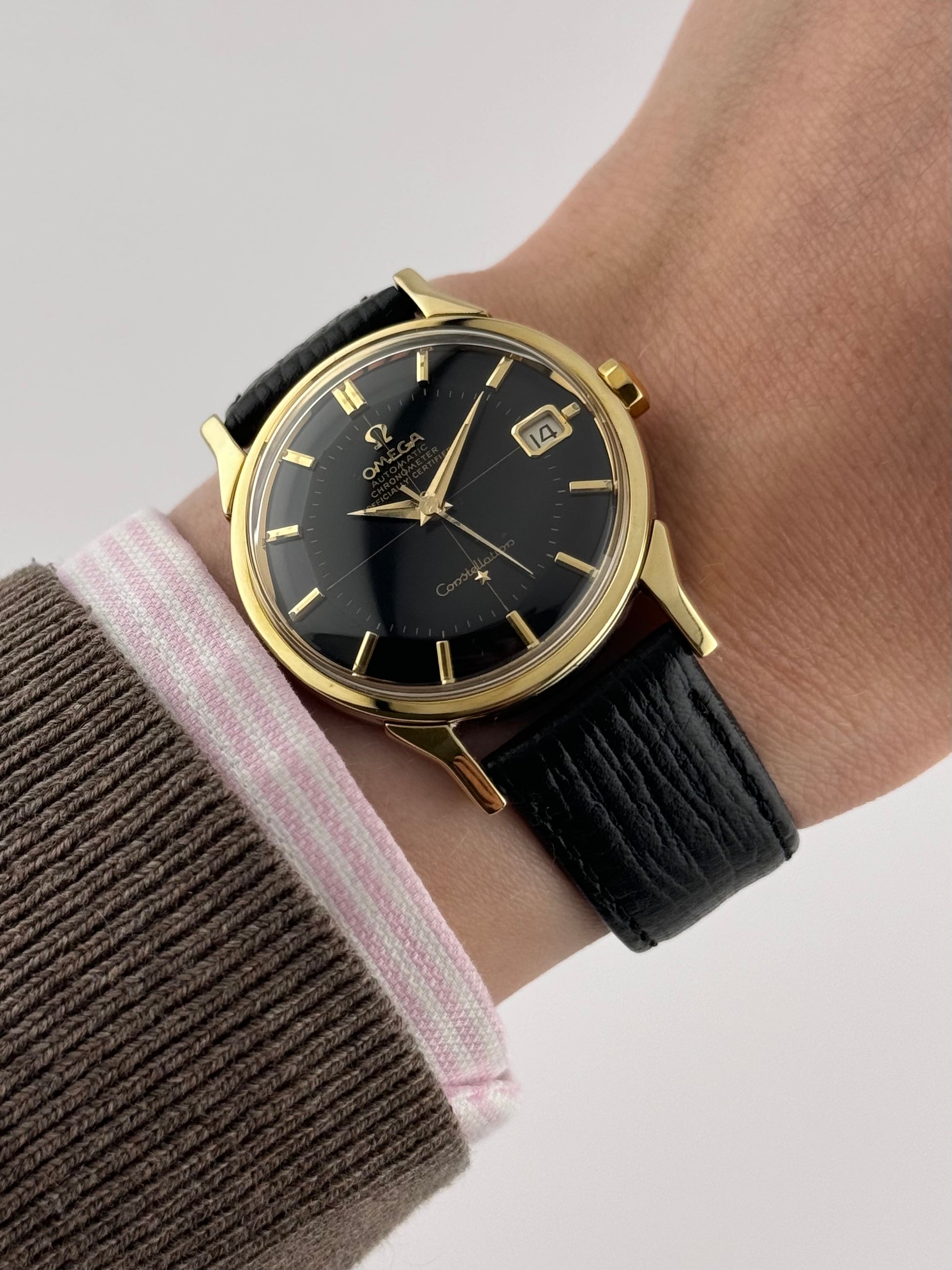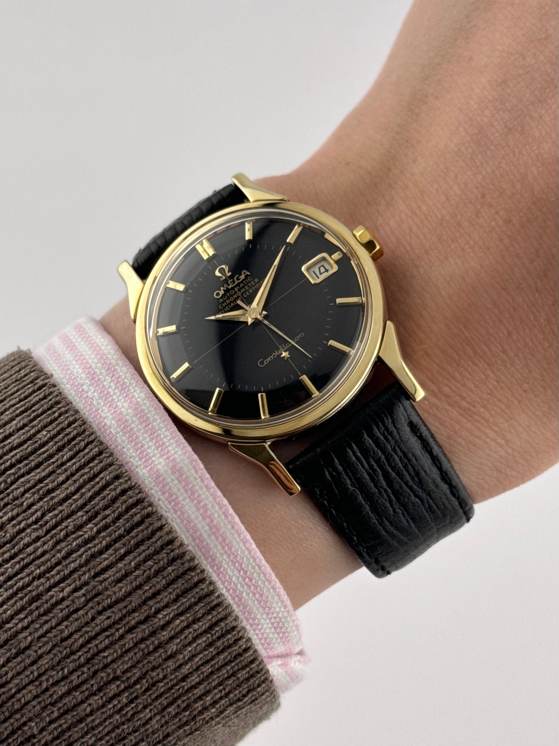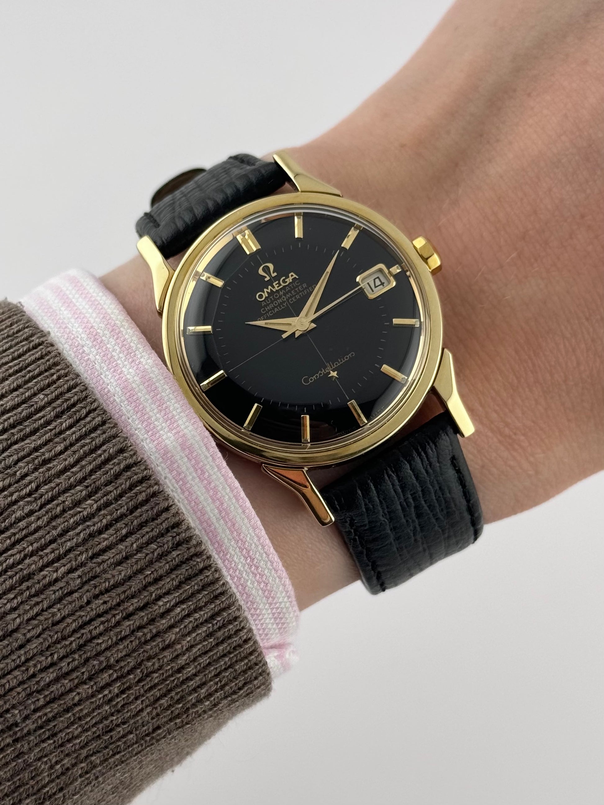 Now this is special… An ultra-rare Omega Constellation Pie Pan Chronometer featuring an extremely desirable black Pie Pan dial and distinctive, rare and beautiful dog leg lugs. This exceptional example is presented in remarkable condition and represents one of the most sought-after variants of the Constellation line.