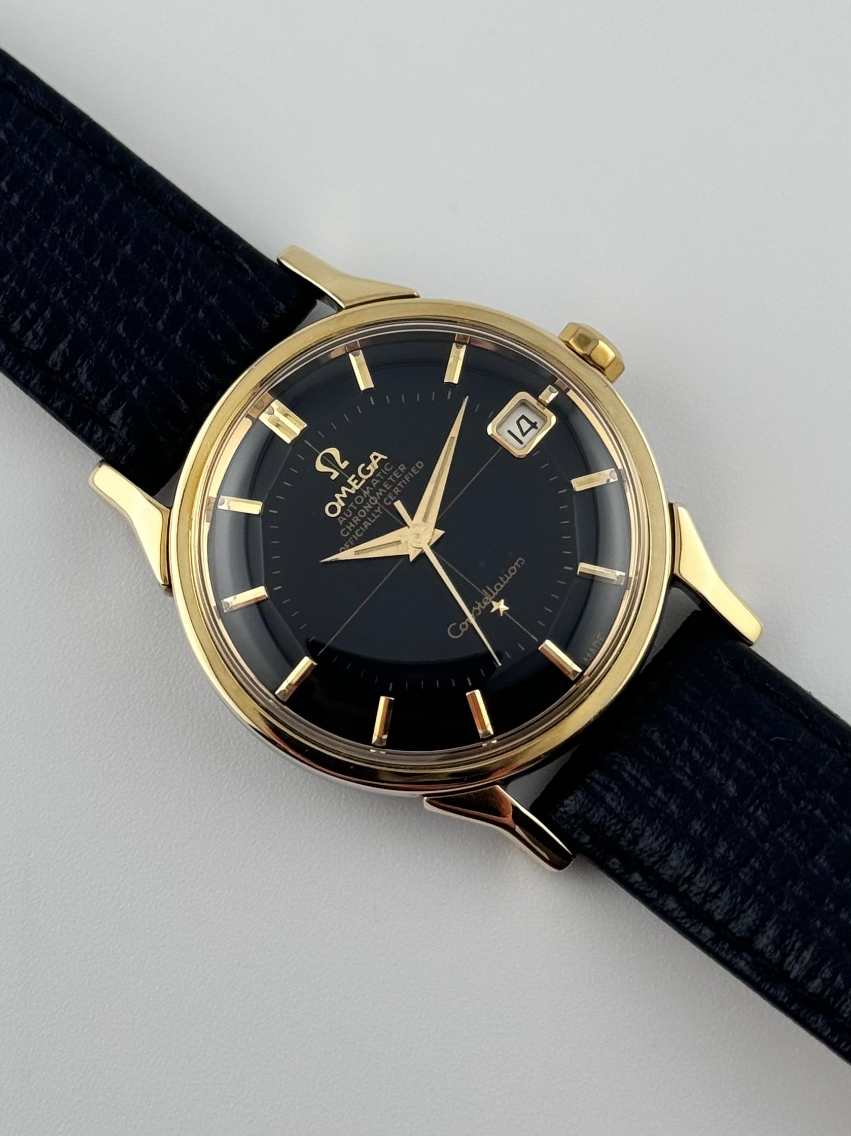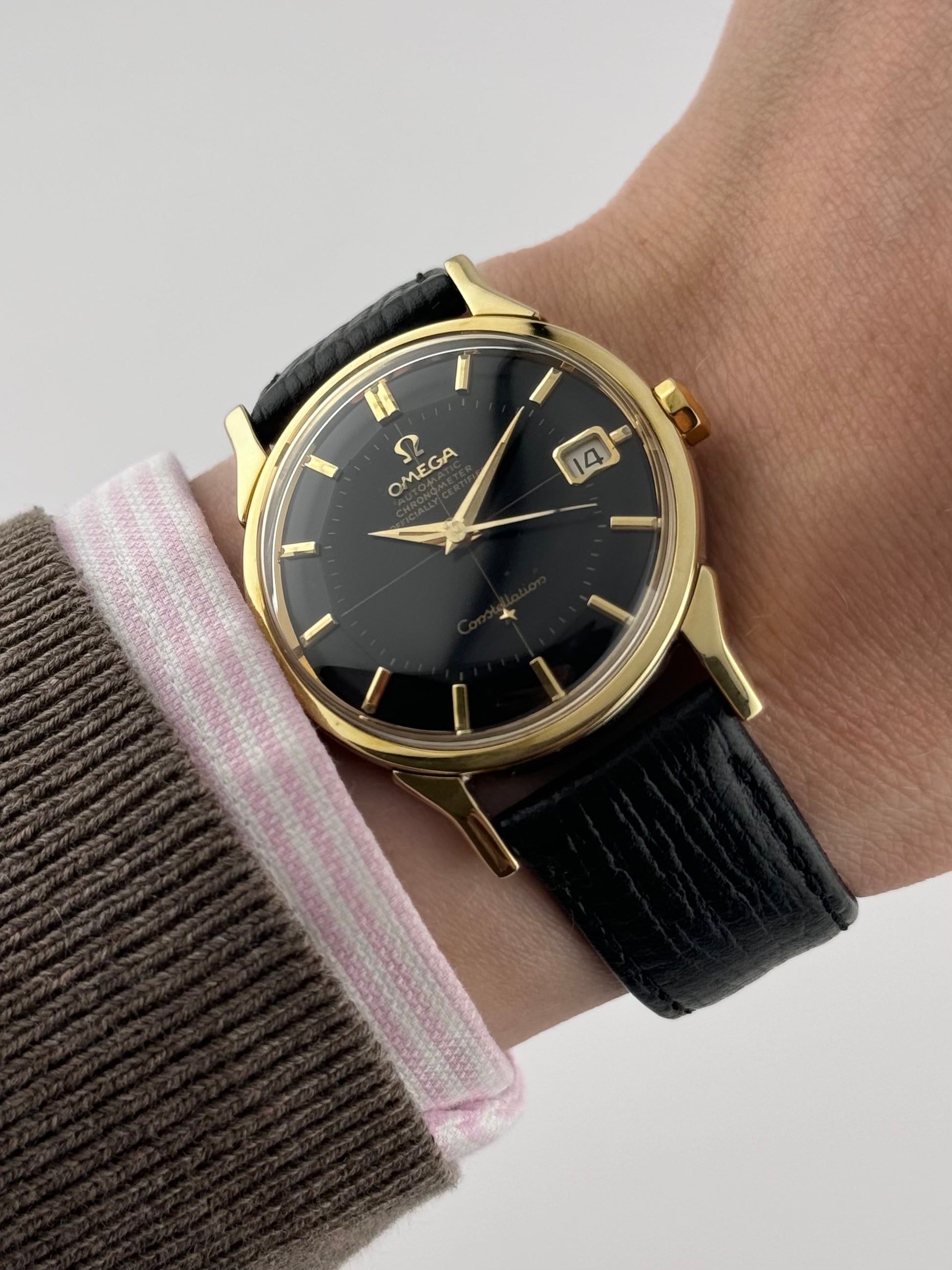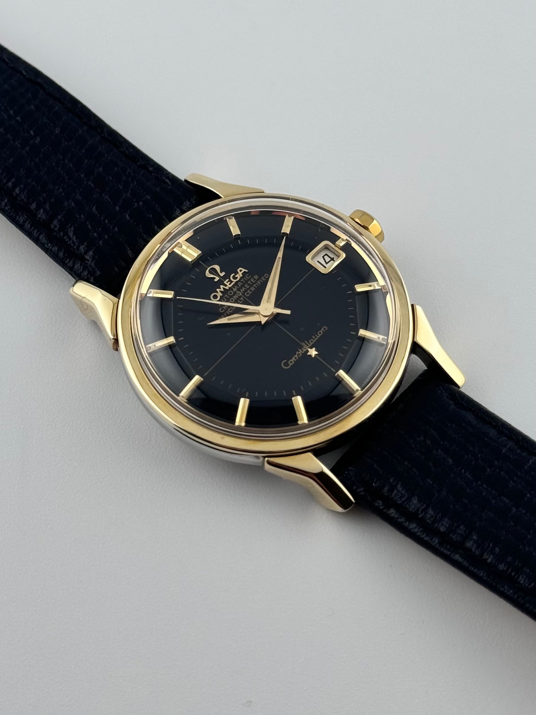 Now this is special… An ultra-rare Omega Constellation Pie Pan Chronometer featuring an extremely desirable black Pie Pan dial and distinctive, rare and beautiful dog leg lugs. This exceptional example is presented in remarkable condition and represents one of the most sought-after variants of the Constellation line.