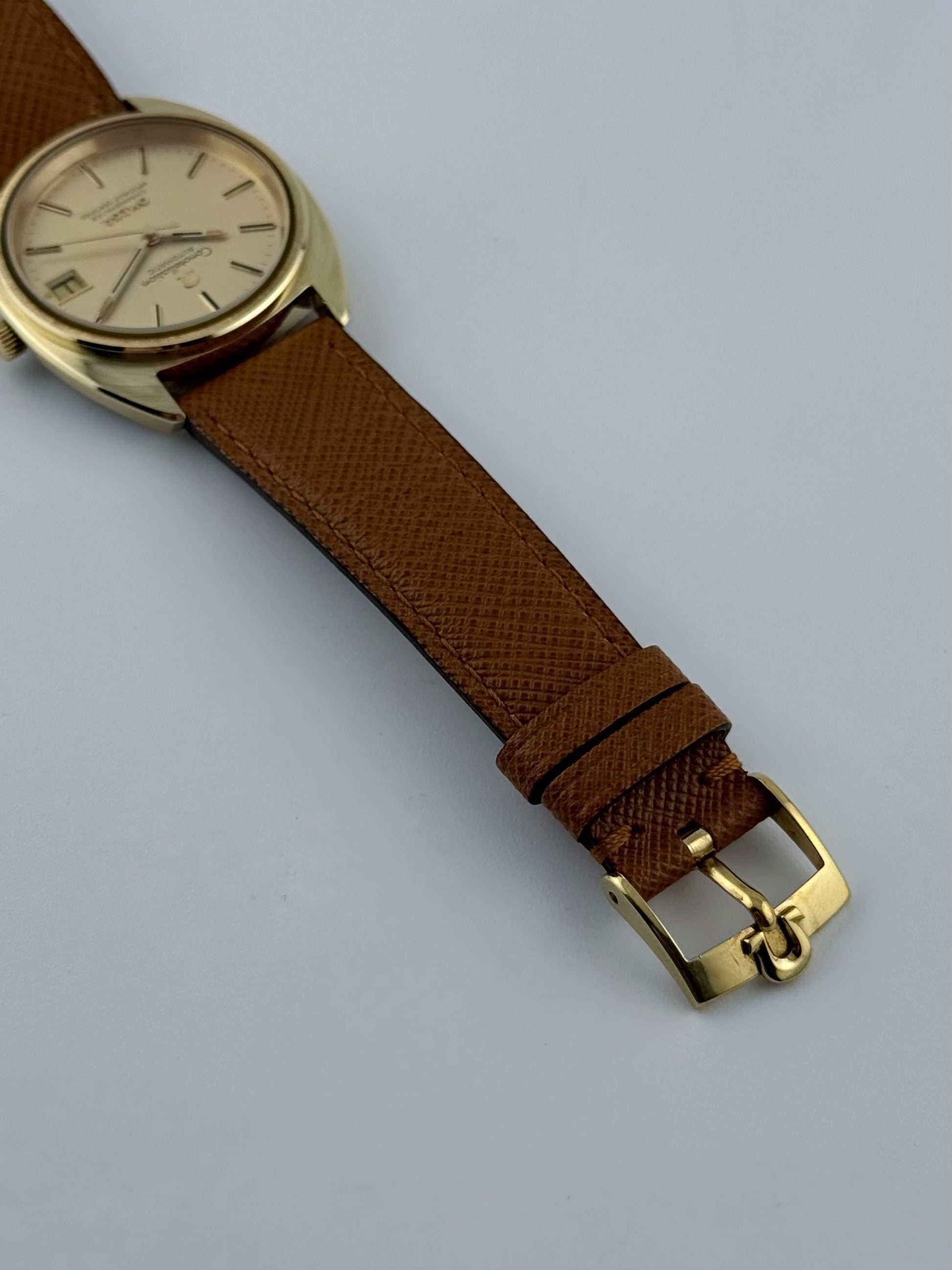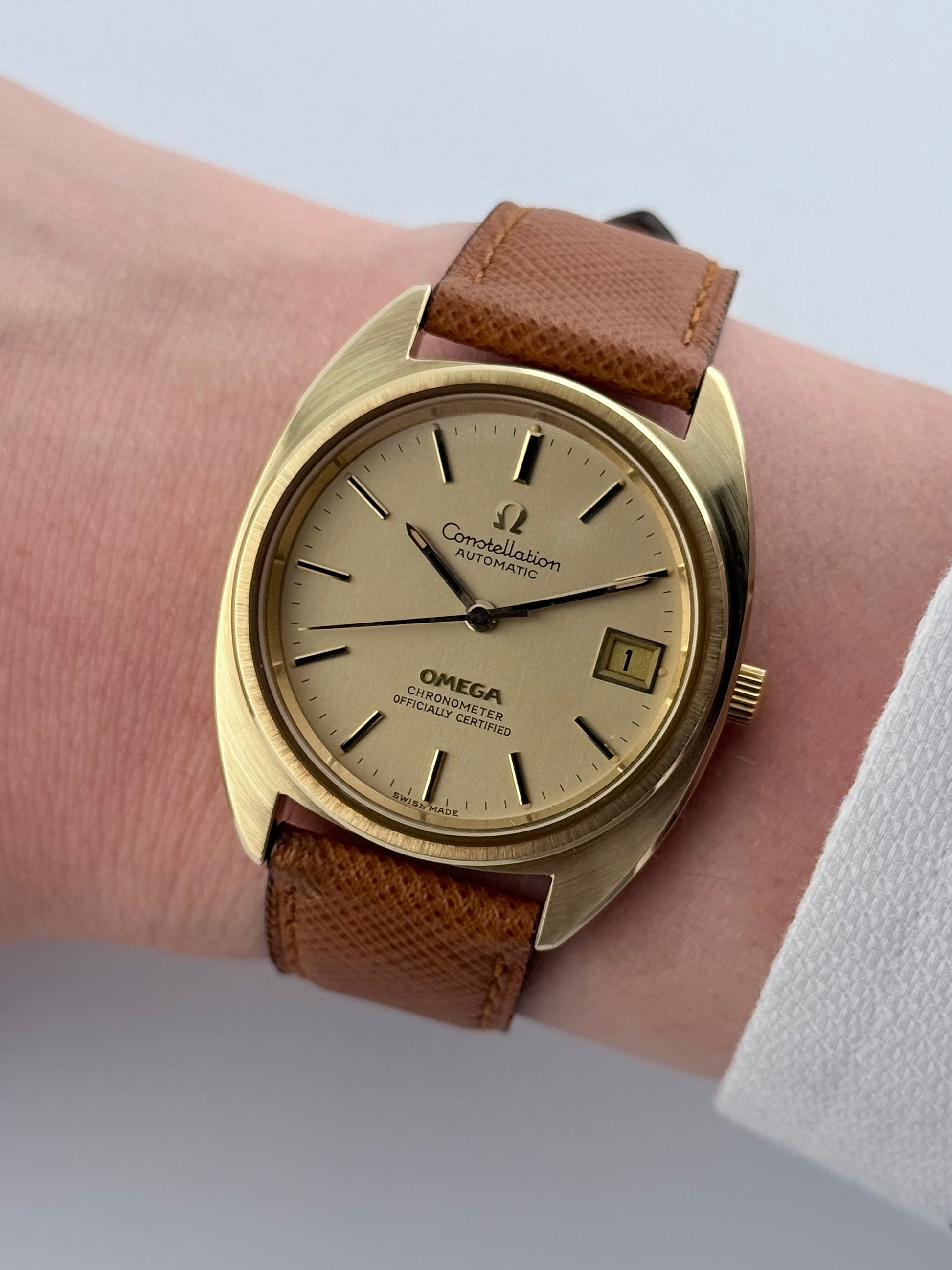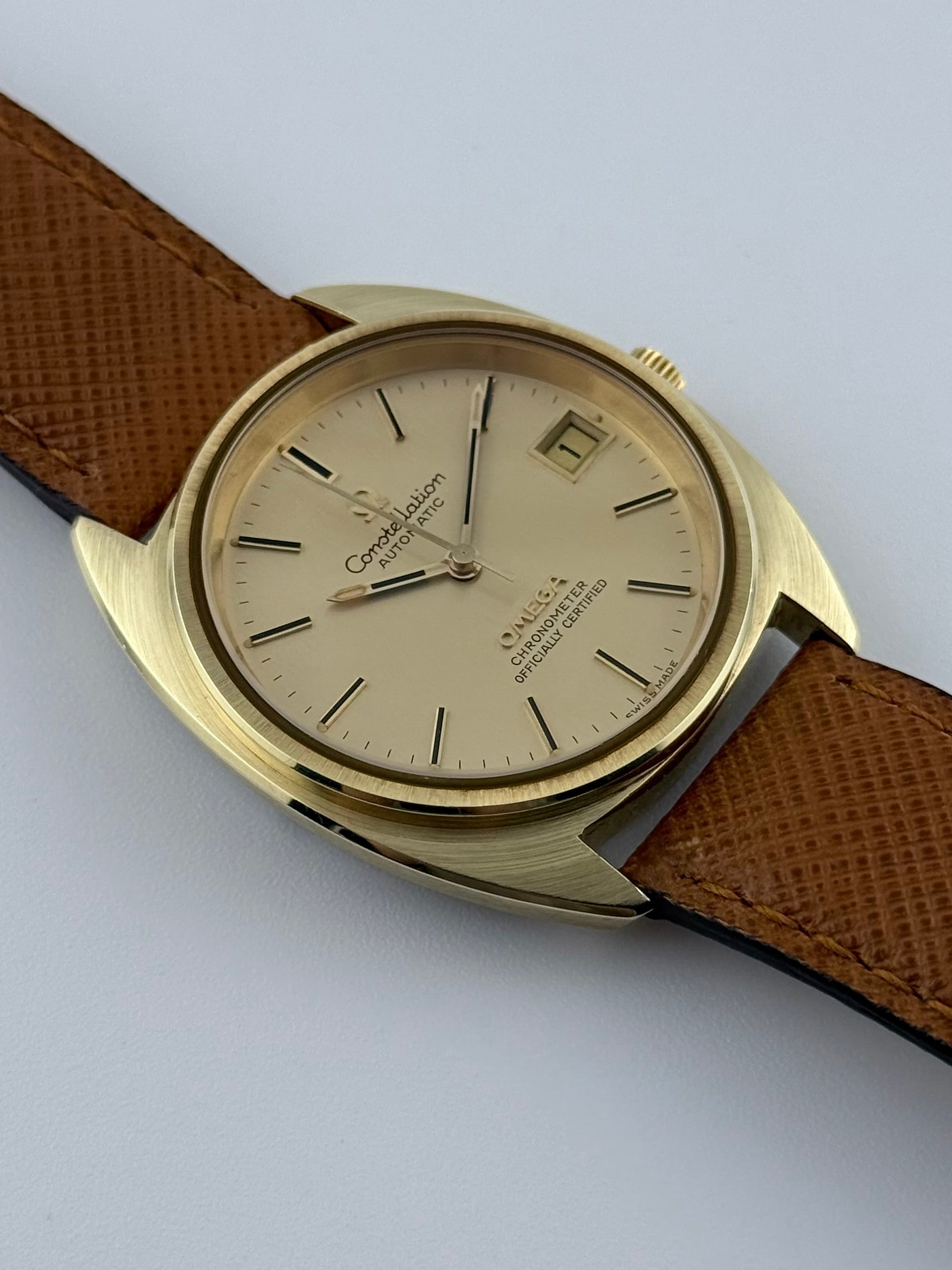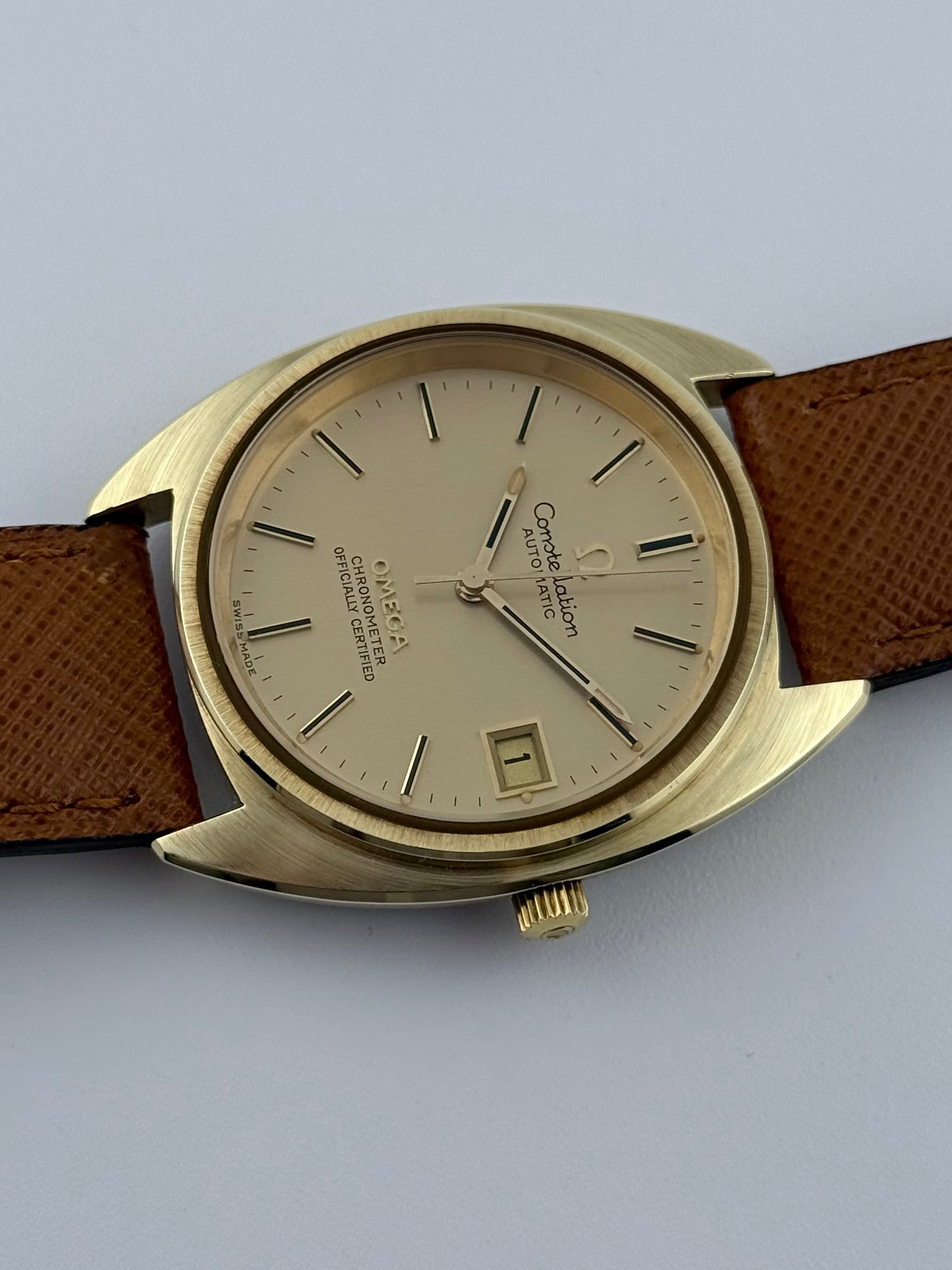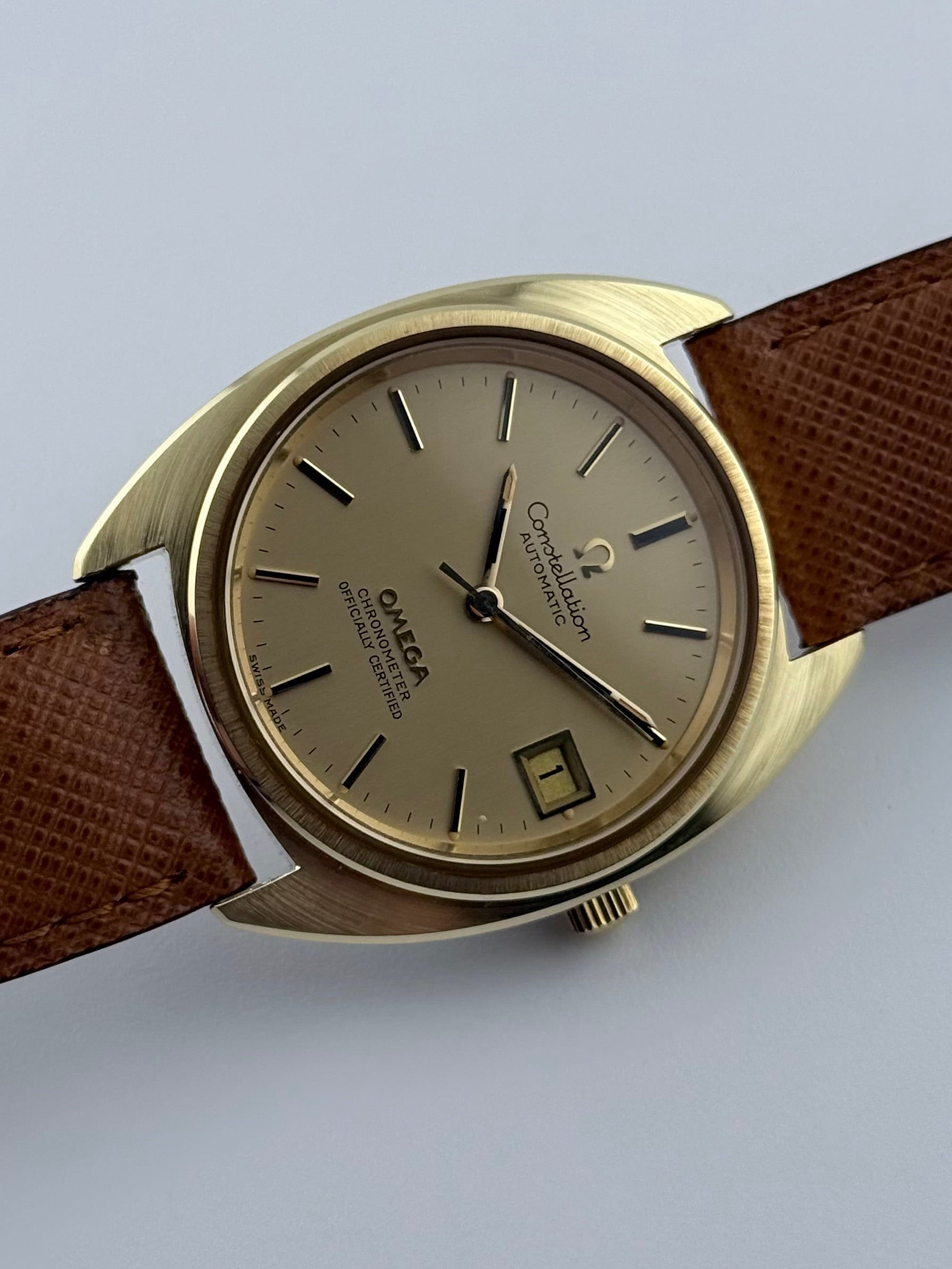 This is an absolute stunner which we have no hesitation in describing as near new old stock. It is a spectacular and rare vintage Omega Constellation from the 1970s and is only the second time we have stocked this particular case reference. This piece features a beautiful gold brushed dial which displays a fully functional Date complication. The watch is in perfect working order and is keeping excellent time, well within specification.