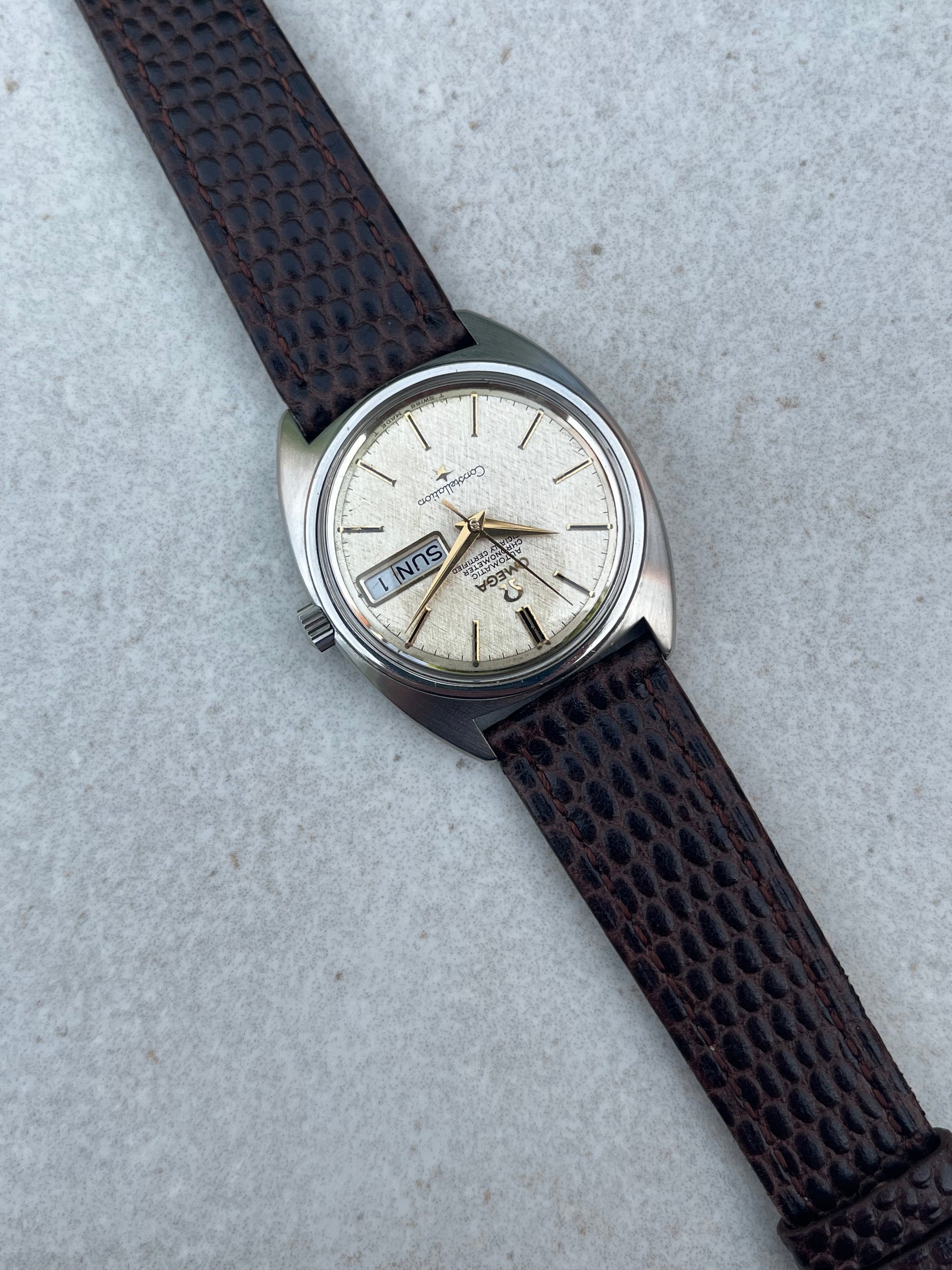 This is an absolutely spectacular and rare vintage Omega Constellation from the 1960s. This piece features a beautiful gilt dial which displays a fully functional Day-Date complication. The watch is in perfect working order and is keeping excellent time well within specification.