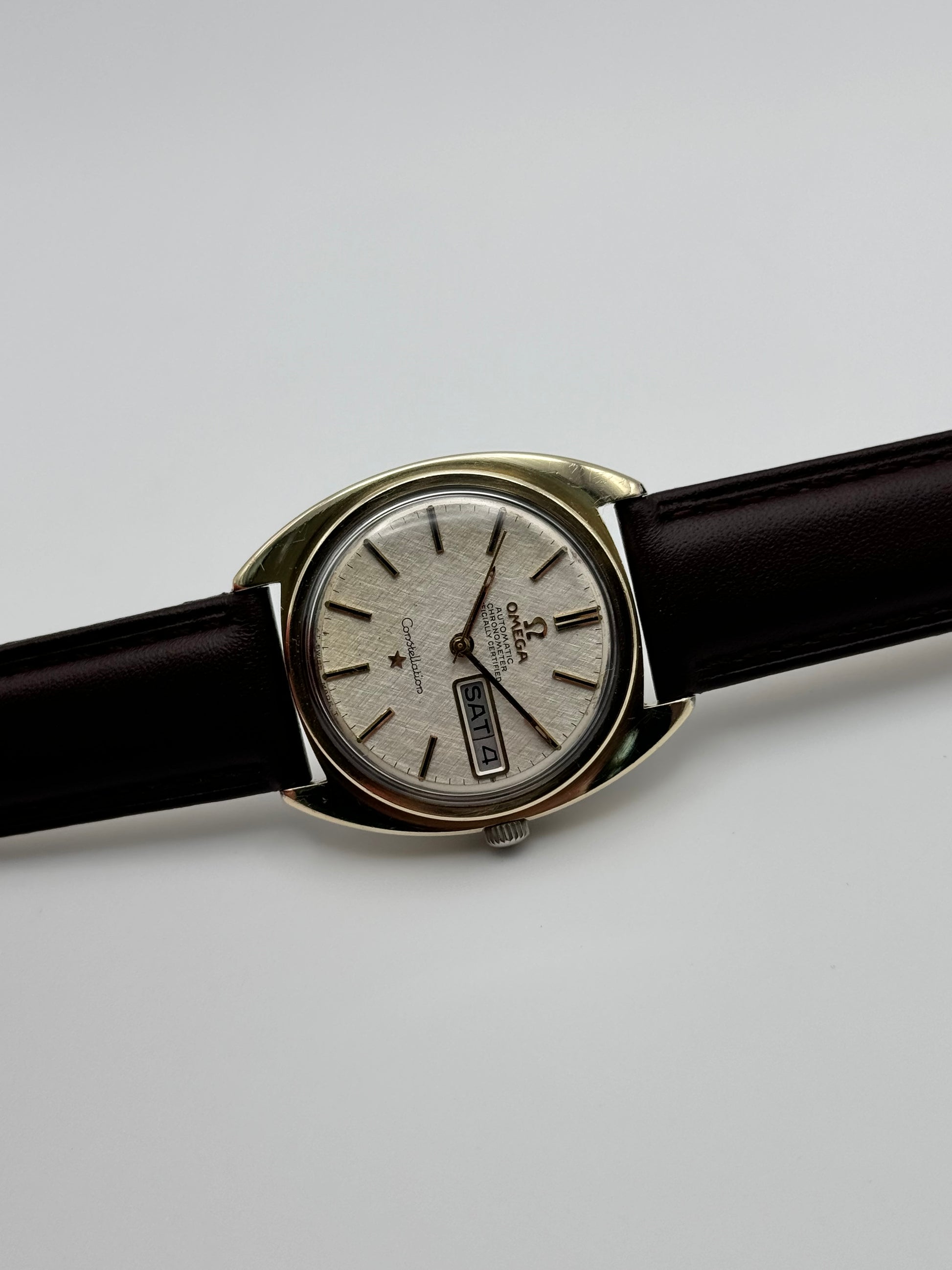 This is an absolutely spectacular and rare vintage Omega Constellation from the 1960s. This piece features a beautiful linen dial which displays a fully functional Day-Date complication. The watch is in perfect working order and is keeping excellent time well within specification.