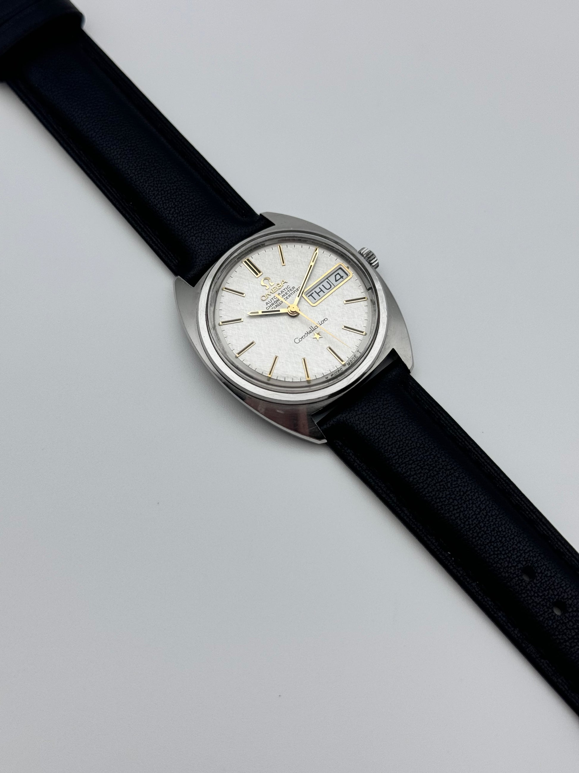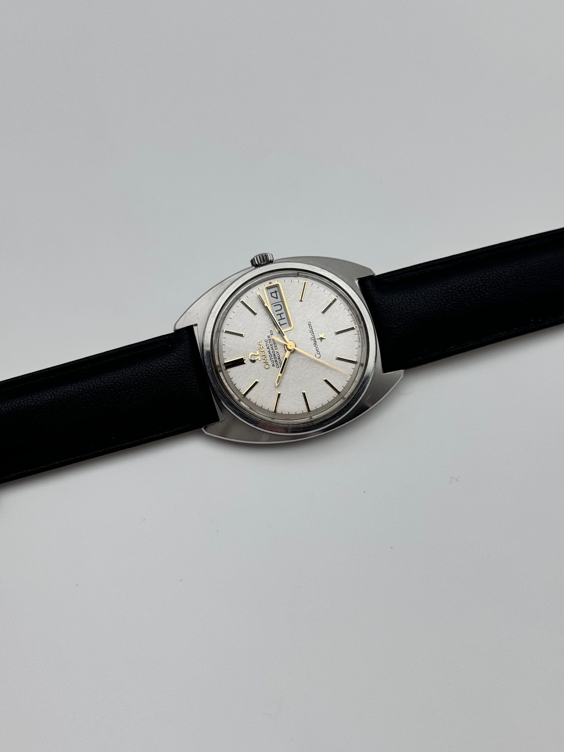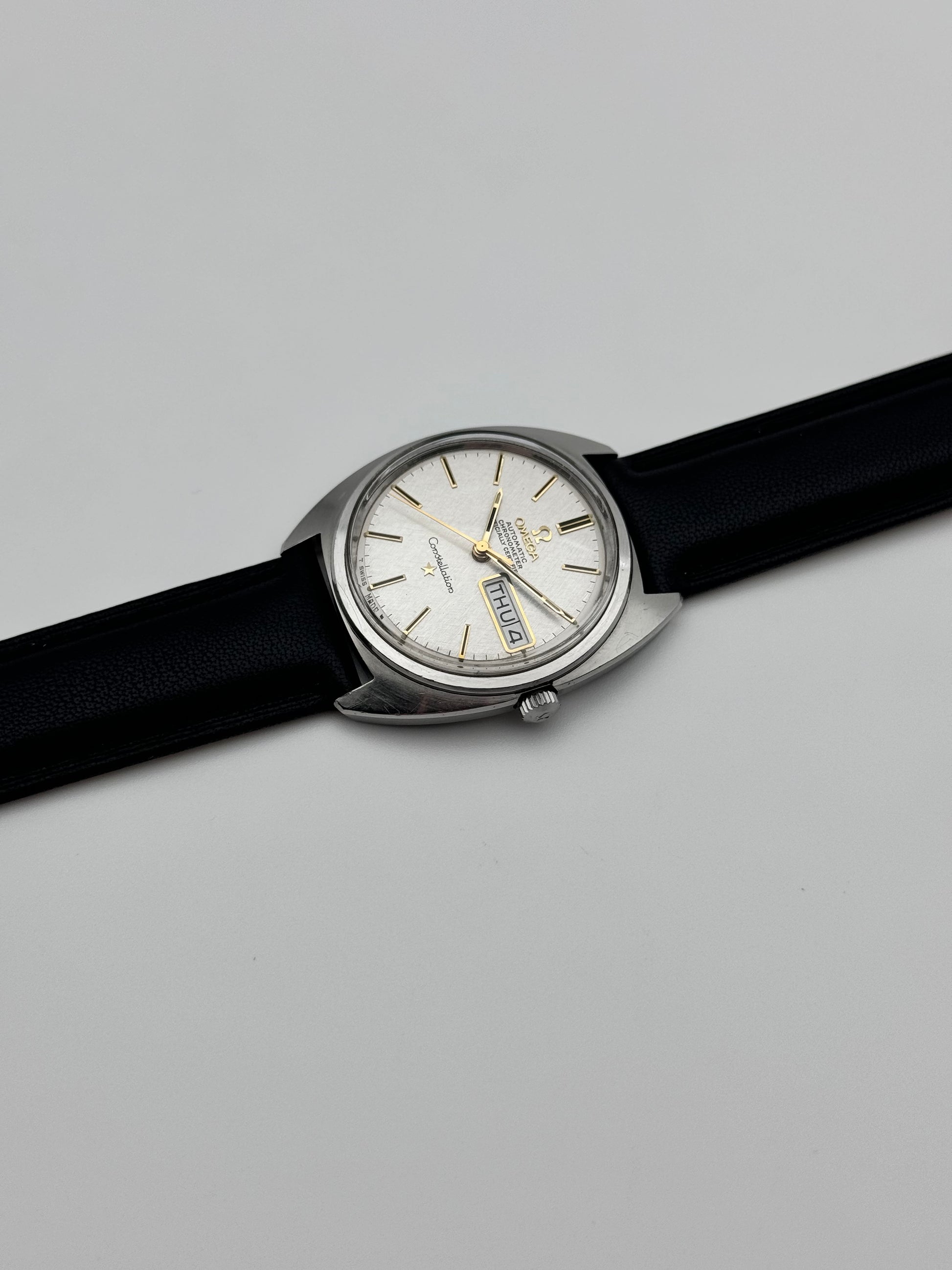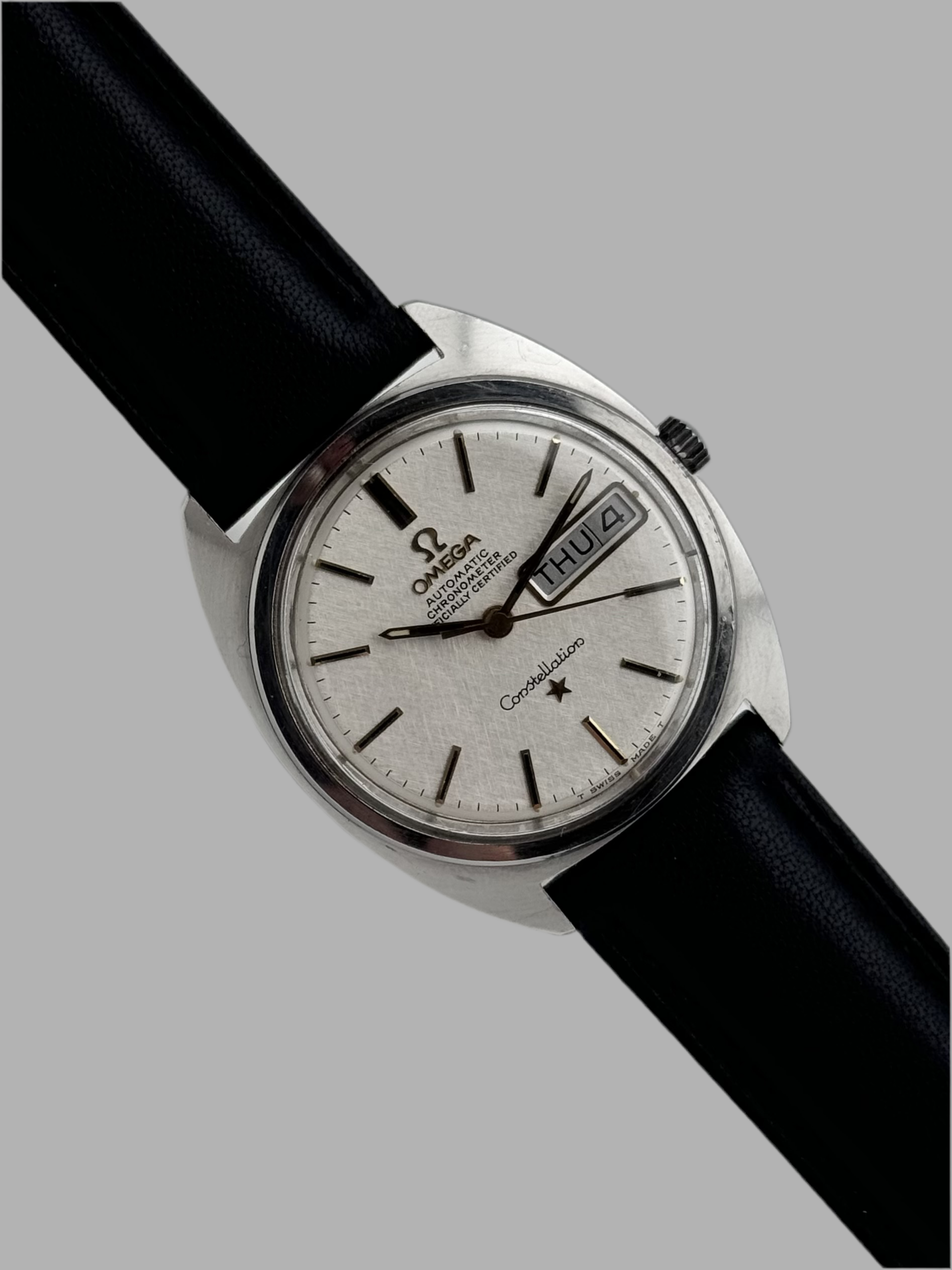 This is an absolutely spectacular and rare vintage Omega Constellation from the 1960s. This piece features a beautiful gilt linen dial which displays a fully functional Day-Date complication. The watch is in perfect working order and is keeping excellent time well within specification.