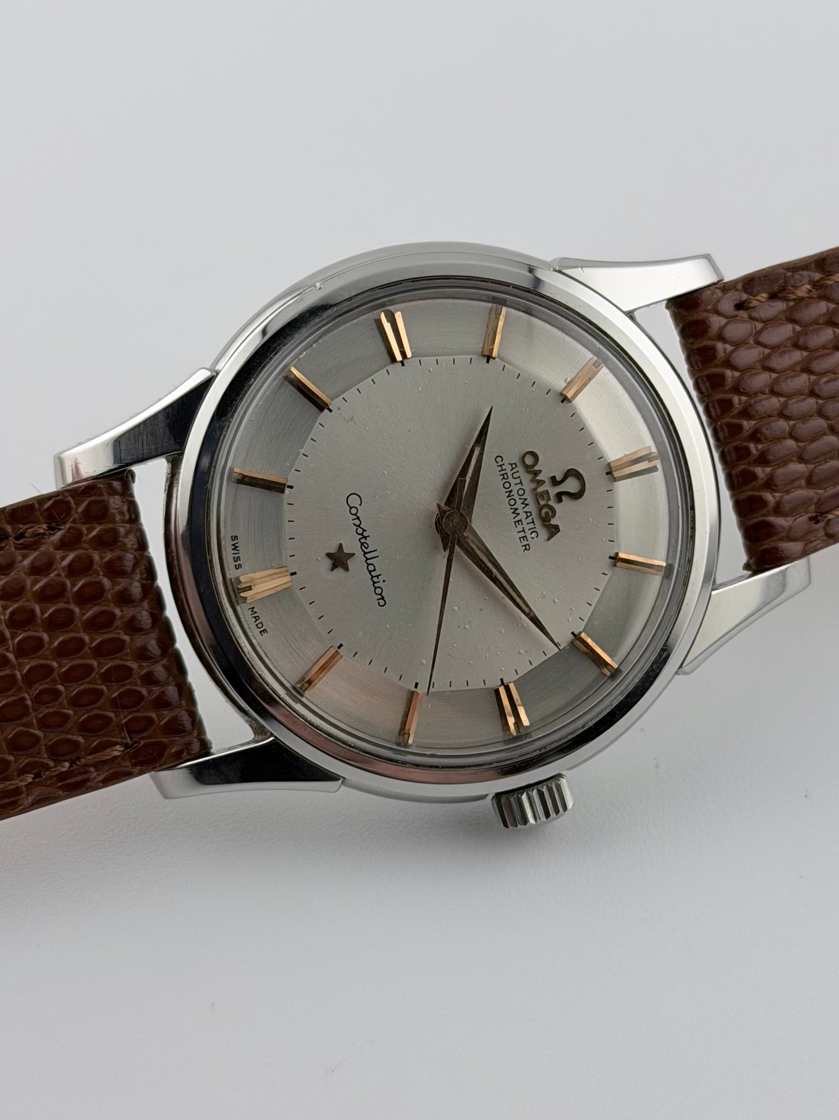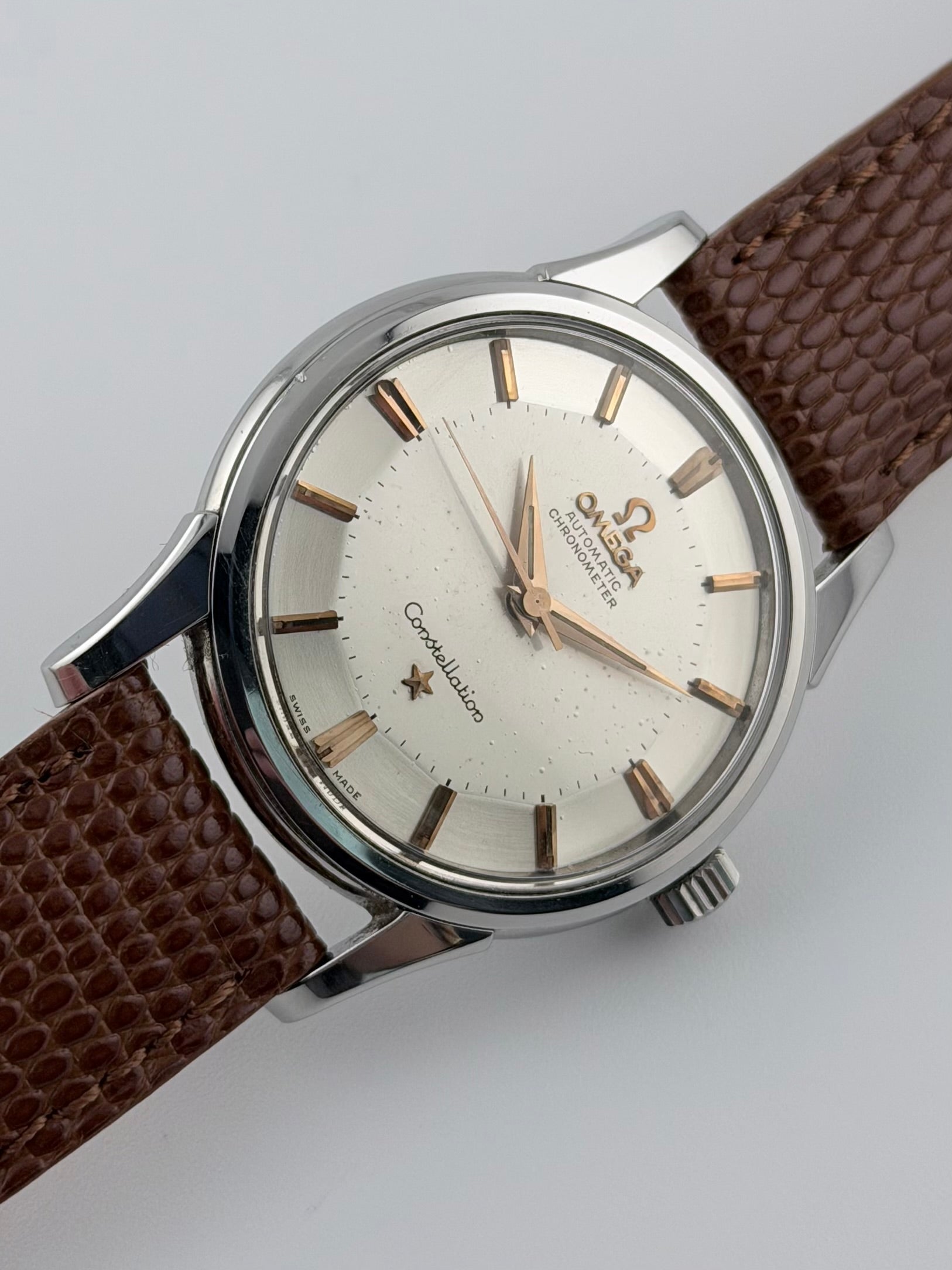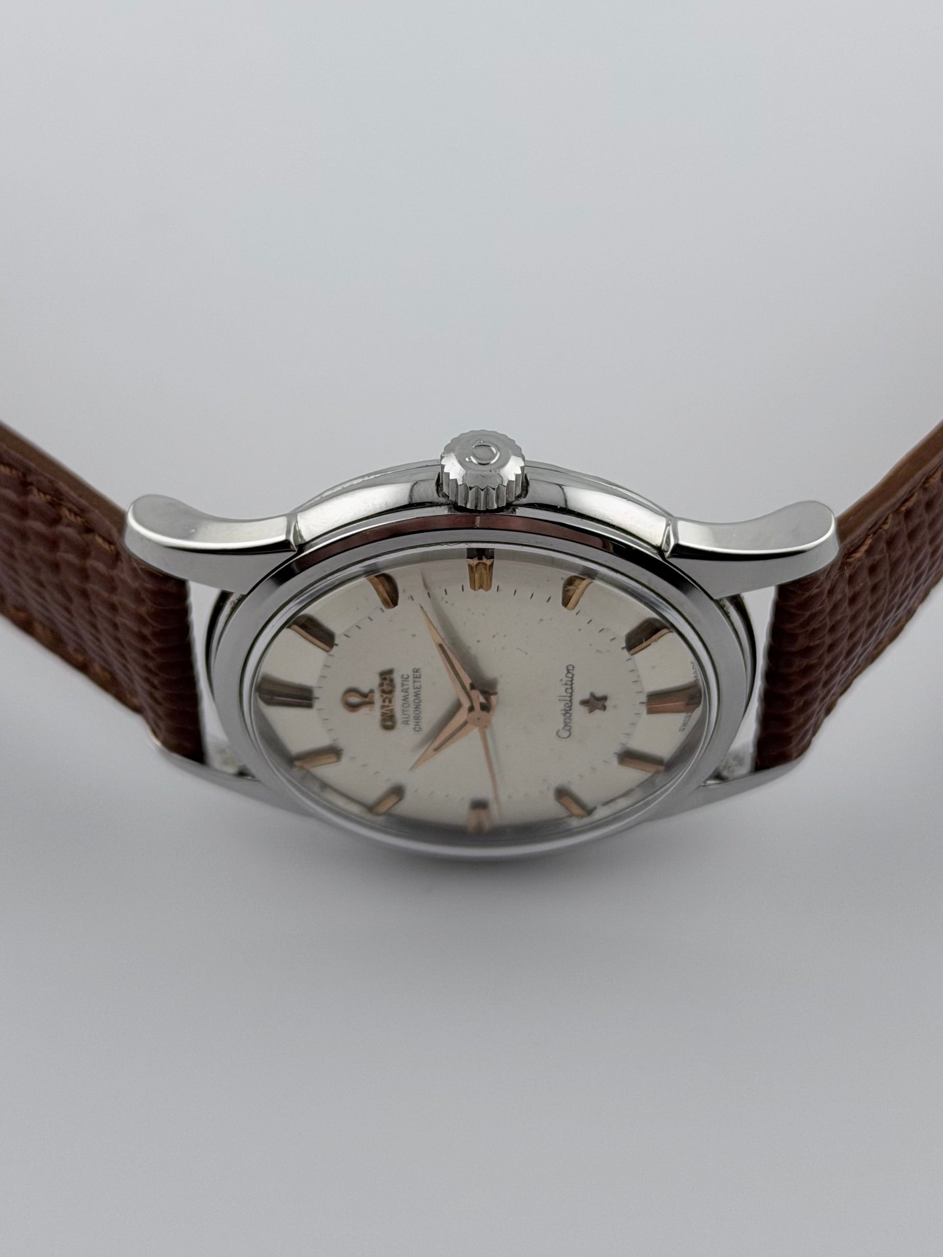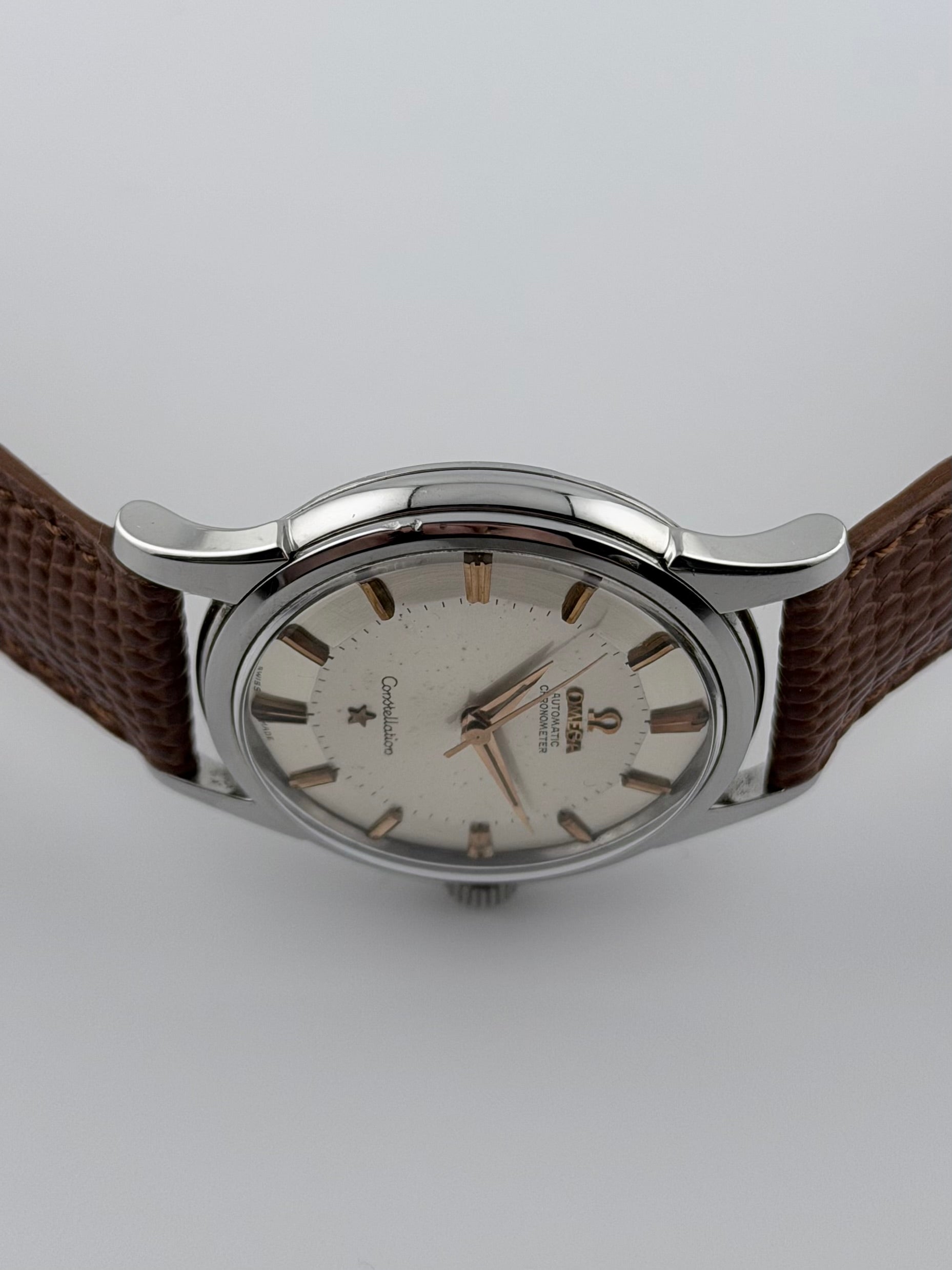 This is a stunning vintage Omega Constellation Pie Pan with the rare feature of rose gold markers which makes for an absolutely superb dial aesthetic. The watch features a sunburst brushed dial which is in beautiful vintage condition. The watch case is in very presentable condition showing minor signs of use over the years. The watch is keeping brilliant time, well within specification.