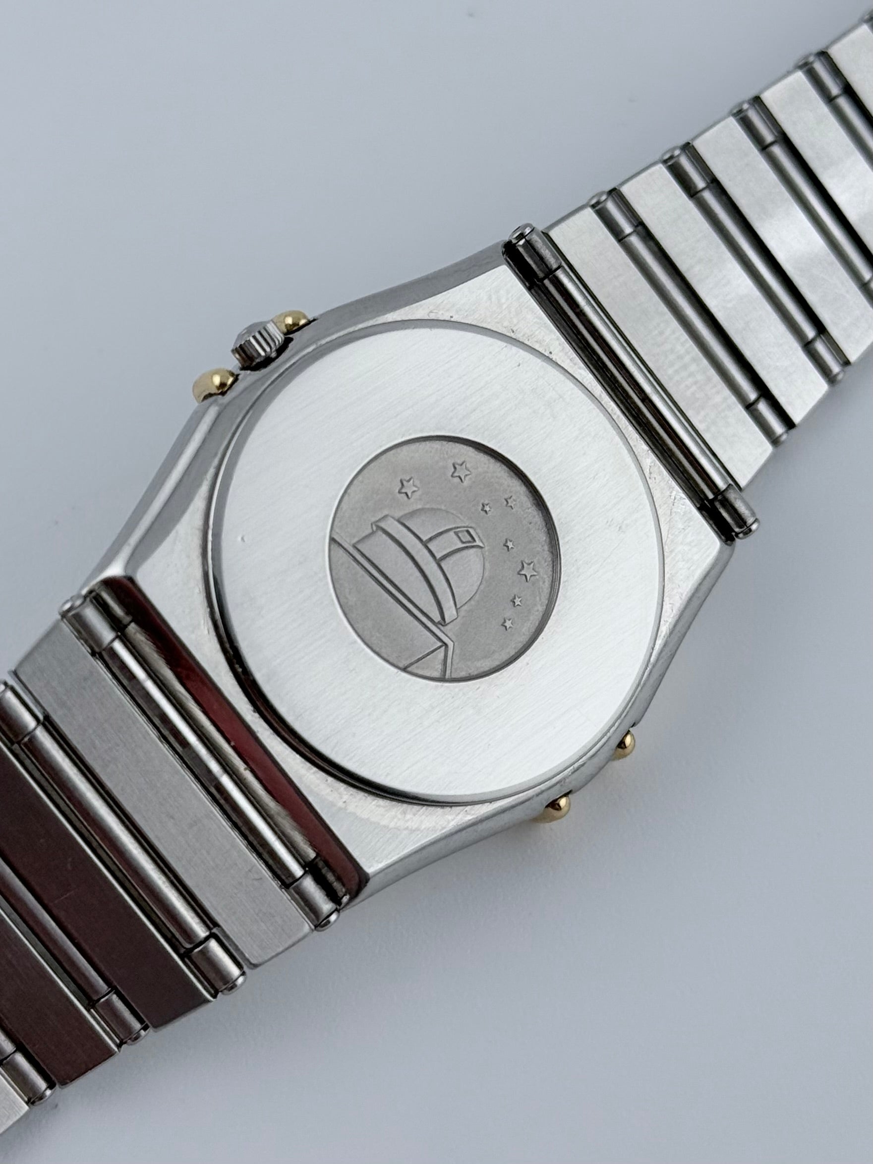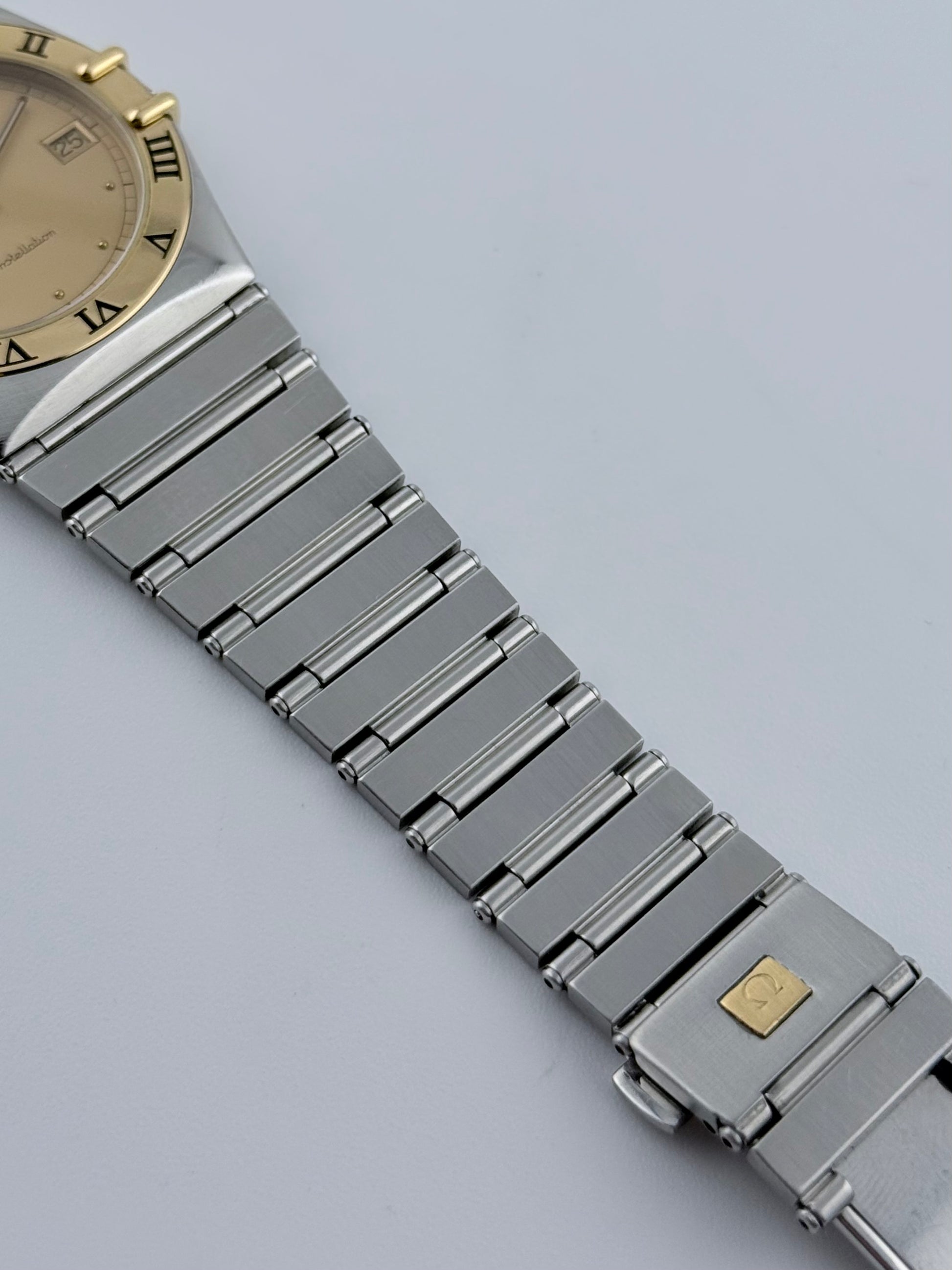 We have for sale the fabulous Omega Constellation Manhattan from the early 1990s with some paperwork including a purchase Omega Warranty Card from Harrods and a servicing receipt. This lovely watch features a gold-tone satin dial with a date complication encased in a stainless steel case with a gold bezel. The watch also displays some of Omega's signature features such as bezel claws and a case with half-moons. The watch is in stunning condition both cosmetically and mechanically. It is keeping perfect time.