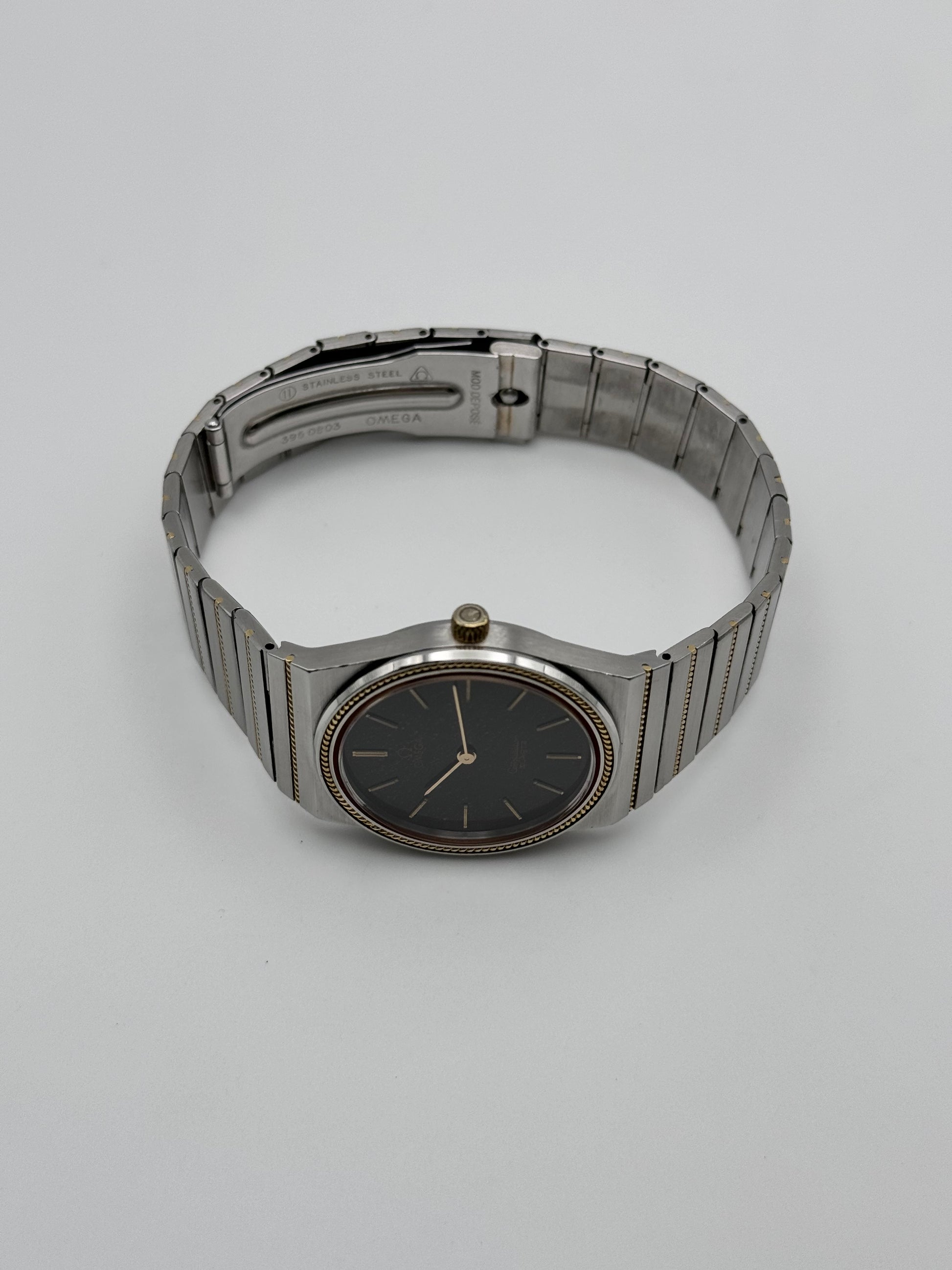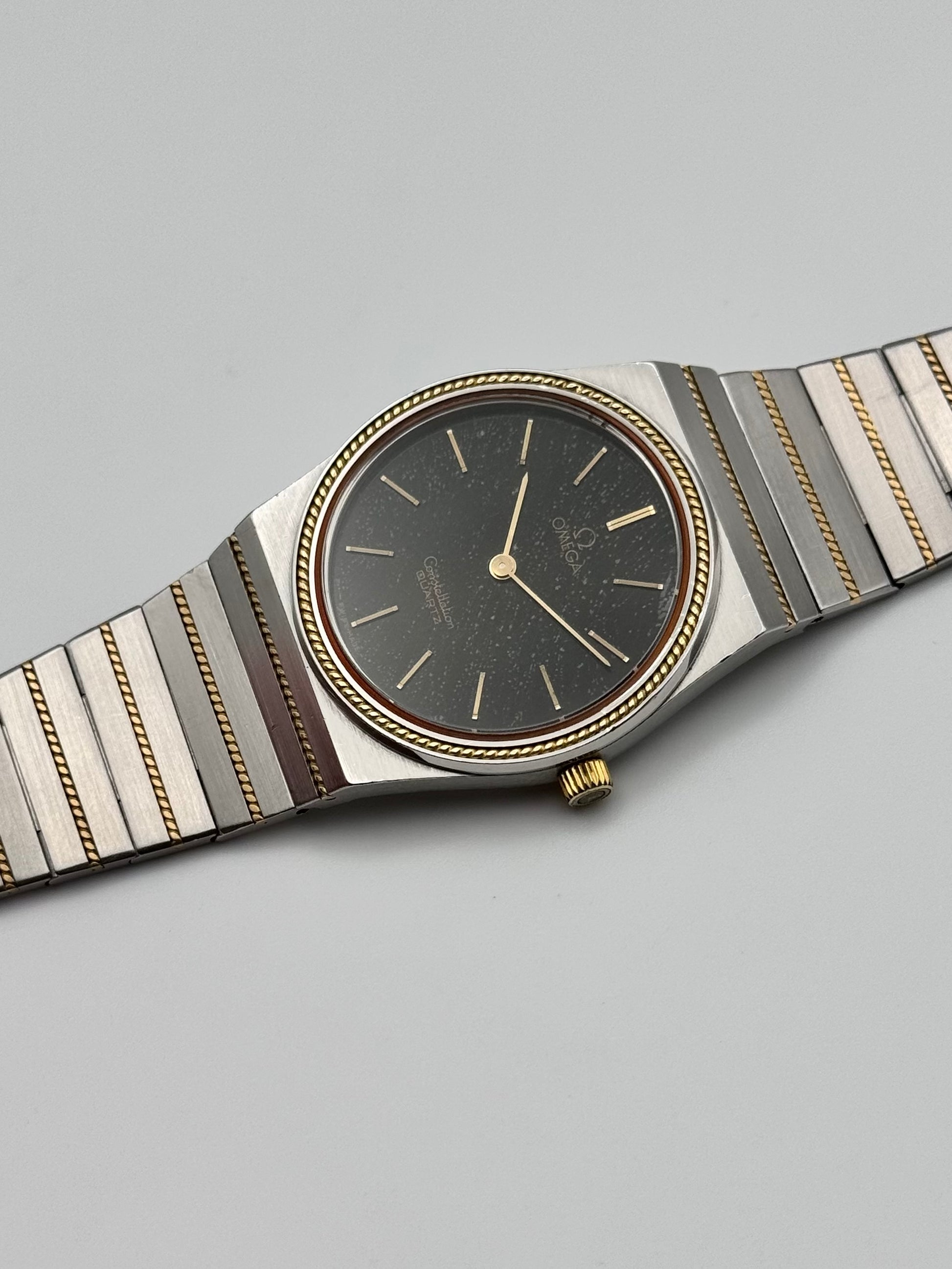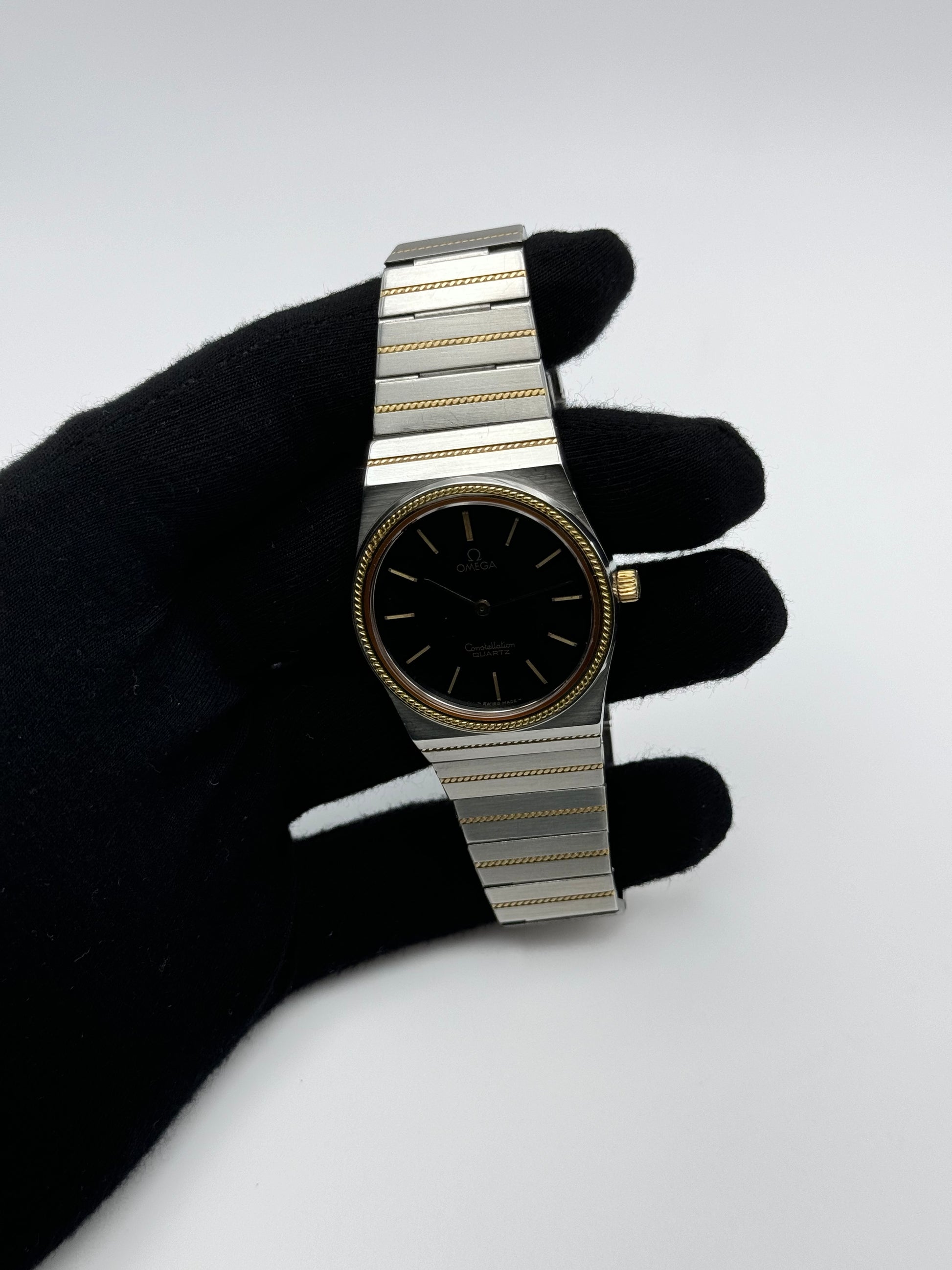 We have for sale a very rare two-tone 18ct gold and stainless steel Omega Constellation Quartz which features a beautiful black dial which features a stone effect. The watch is in great condition both cosmetically and mechanically. It is keeping perfect time.