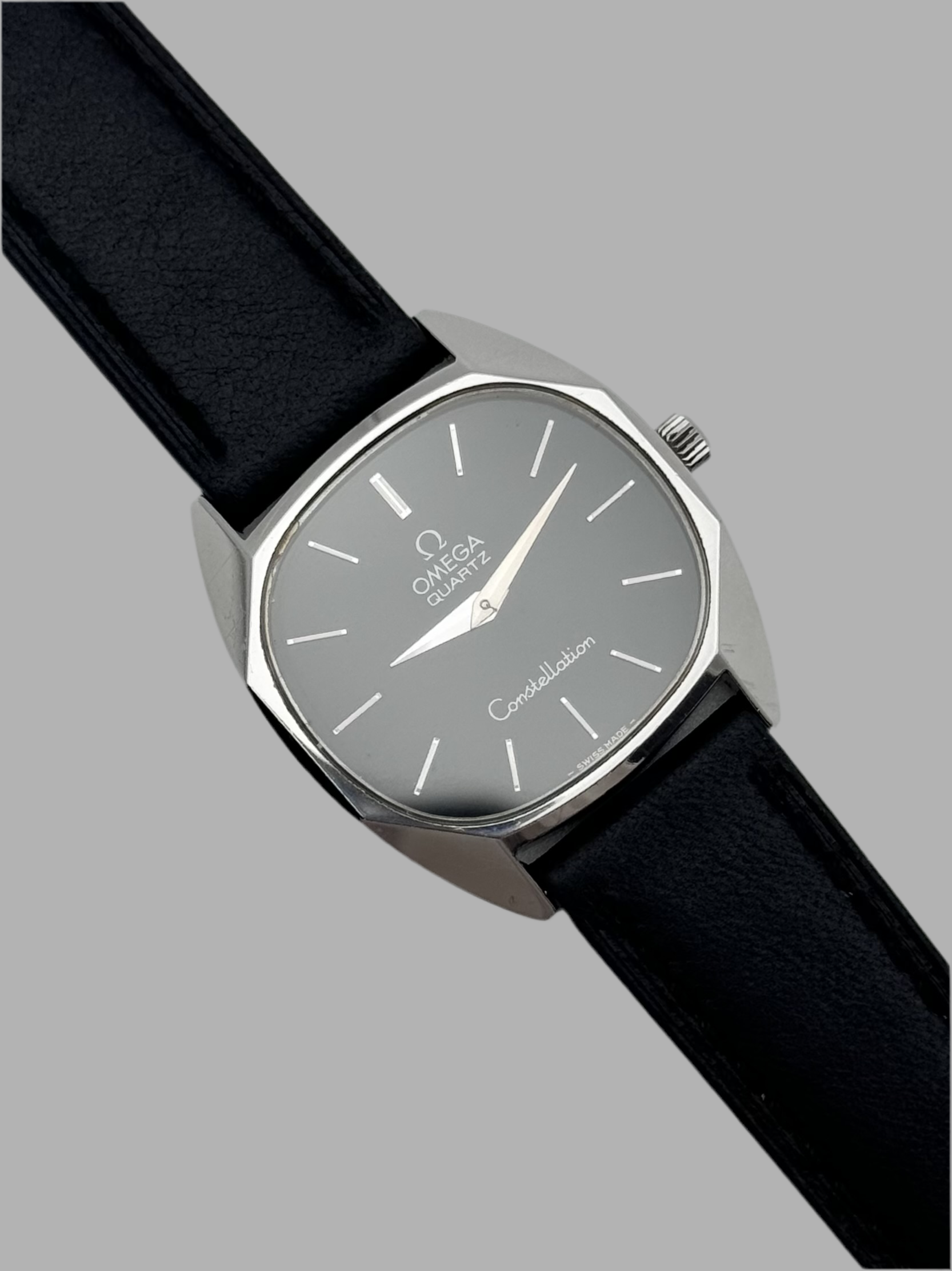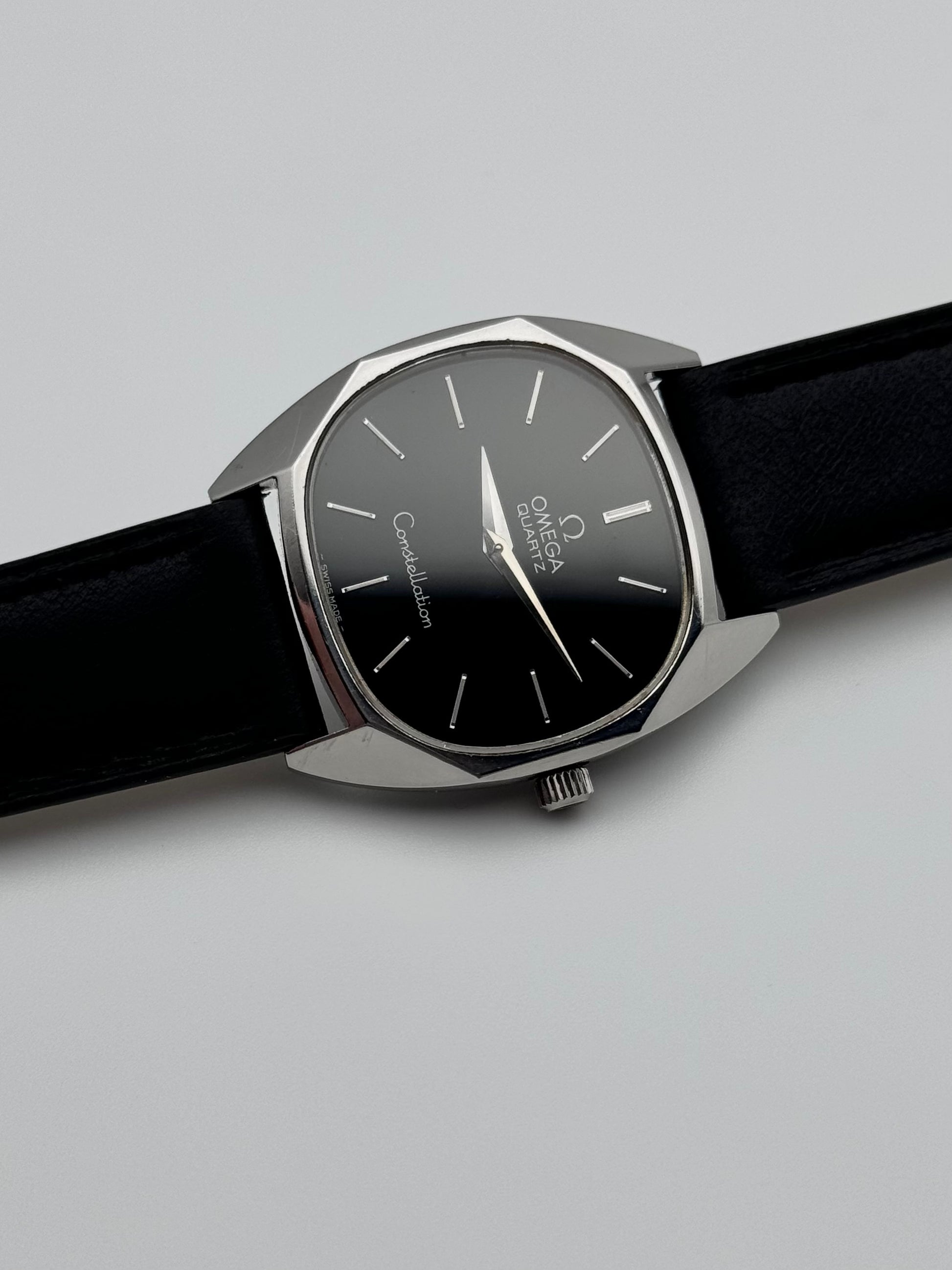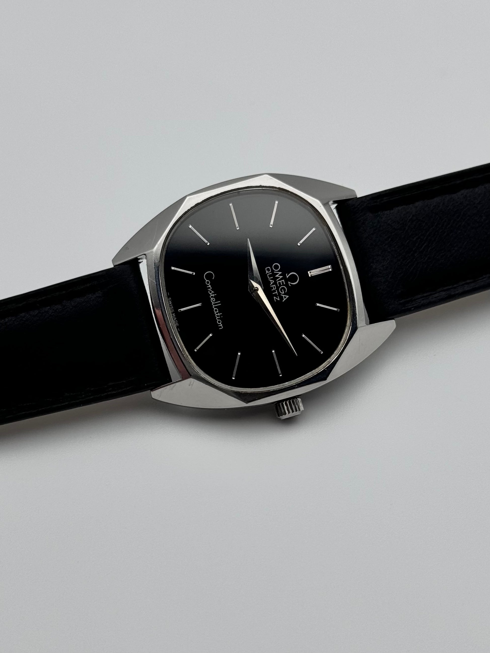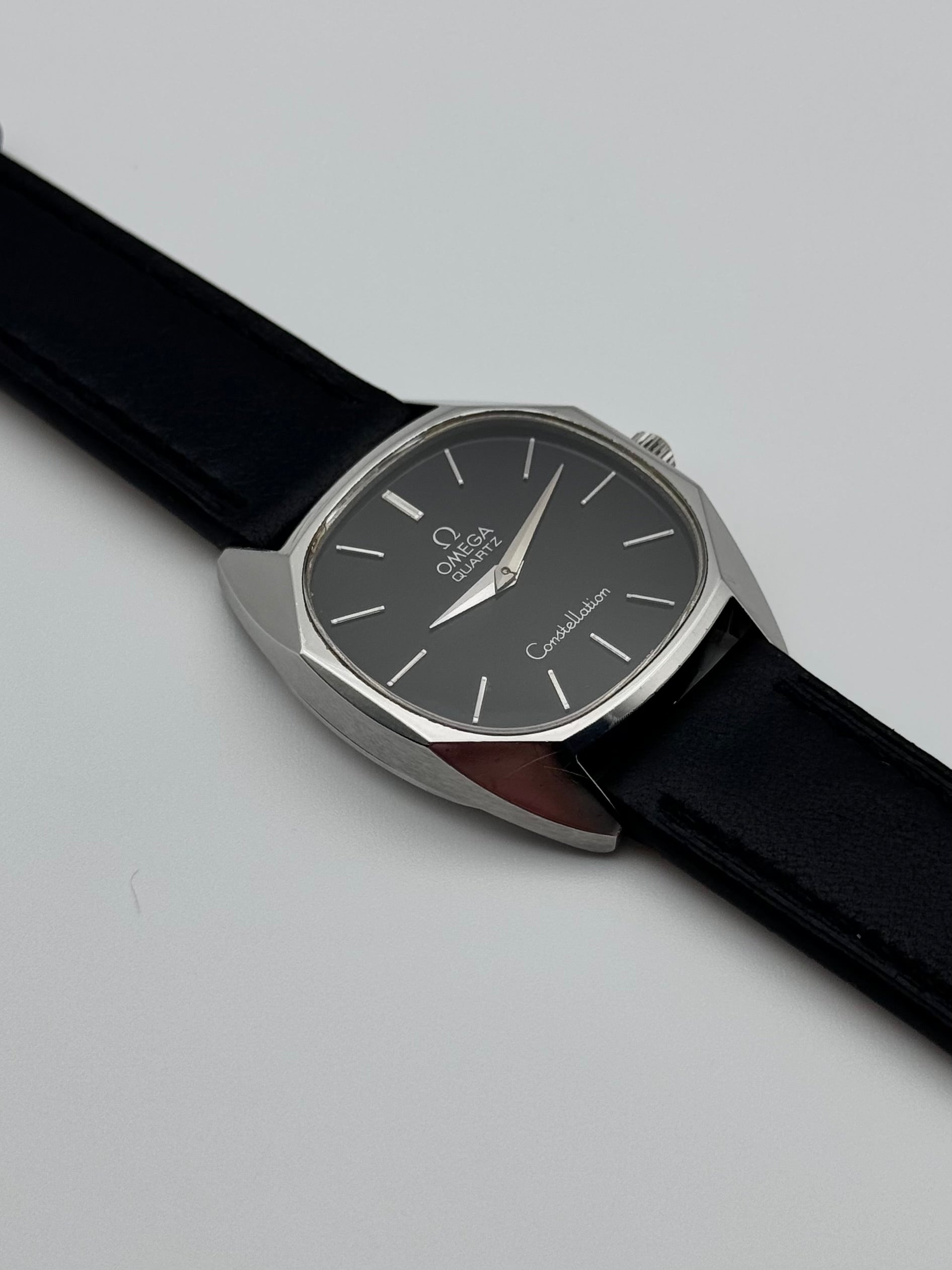 We have for sale a very rare Omega Constellation Quartz which features a beautiful black dial. The watch is in great condition both cosmetically and mechanically. It is keeping perfect time.