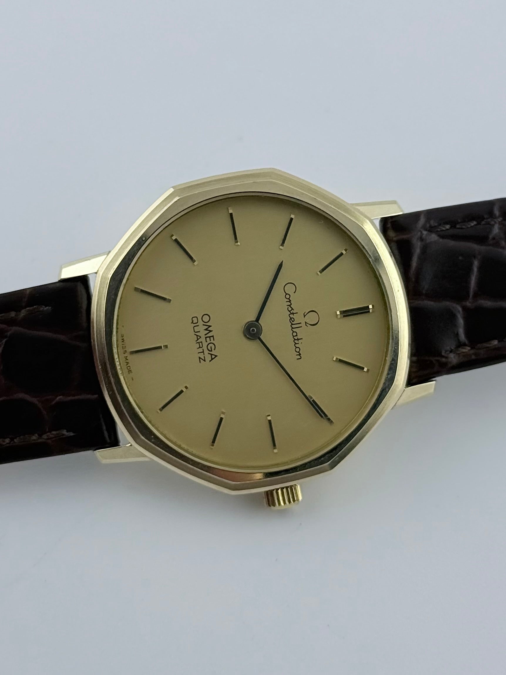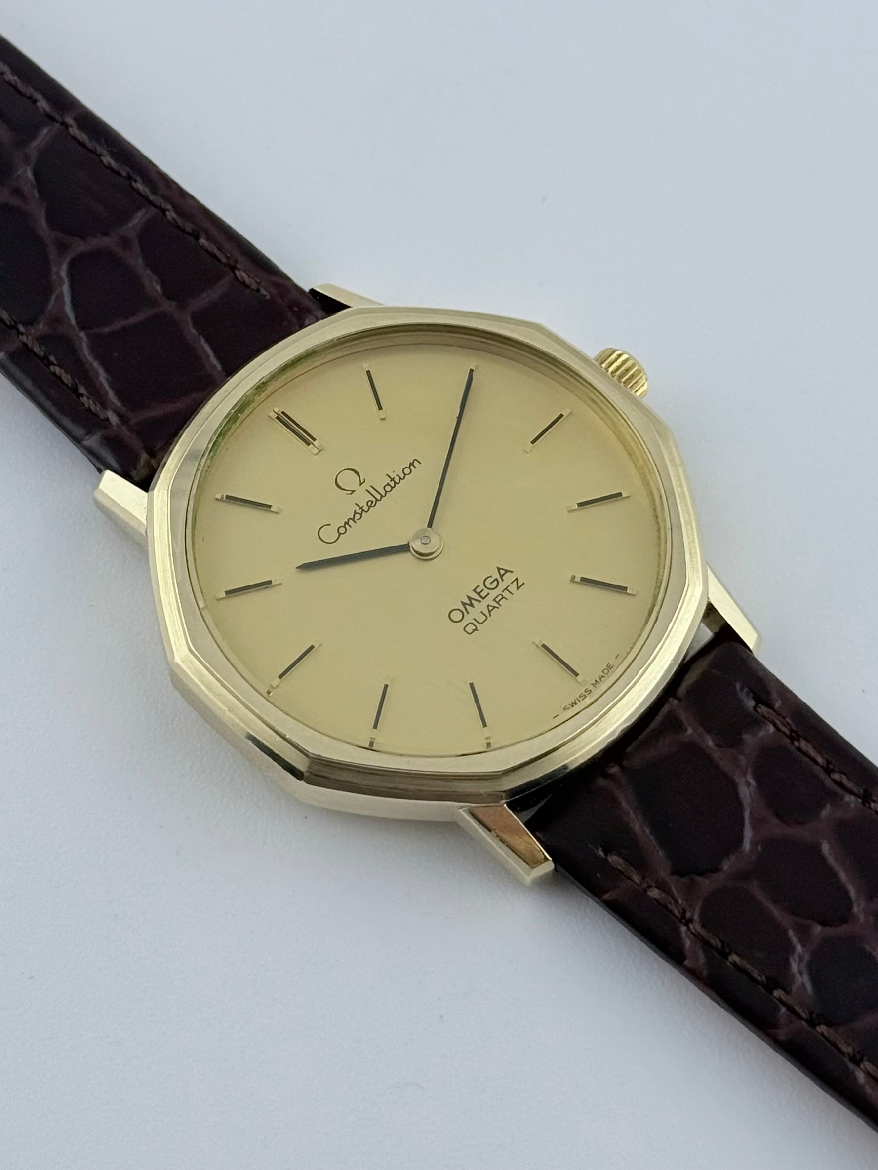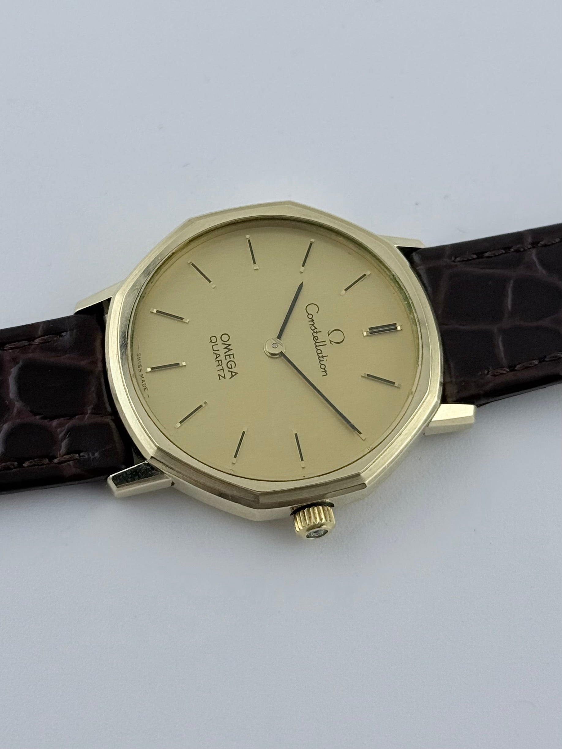 We have for sale an incredible Omega Constellation Quartz with its original box and papers from the 1970s. This fabulous watch features an unusual 10K Gold filled octagonal case complemented by an elegant gold colour dial with fine gold and black baton indexes and hands. The watch is in fantastic condition both cosmetically and mechanically, keeping perfect time.