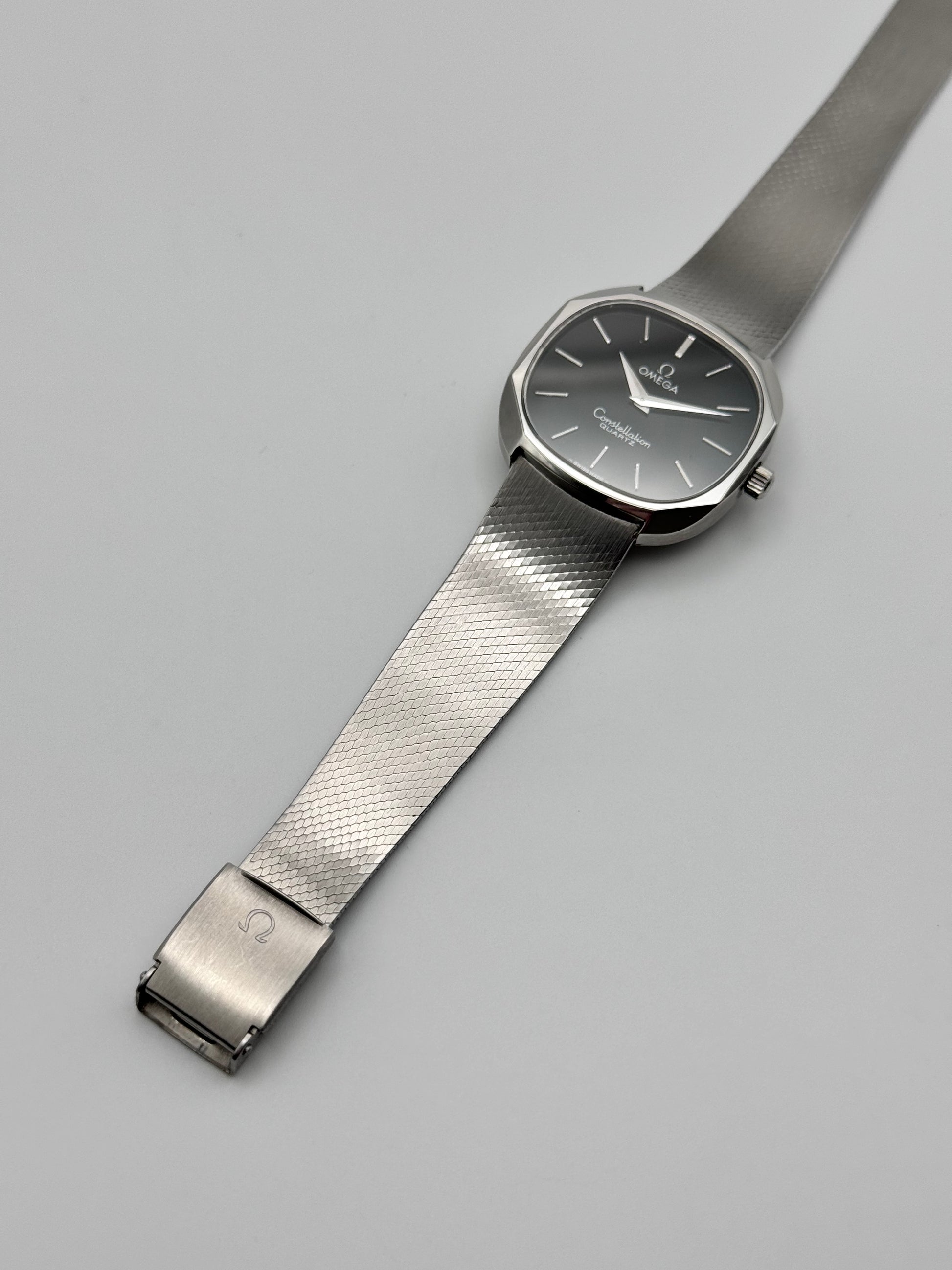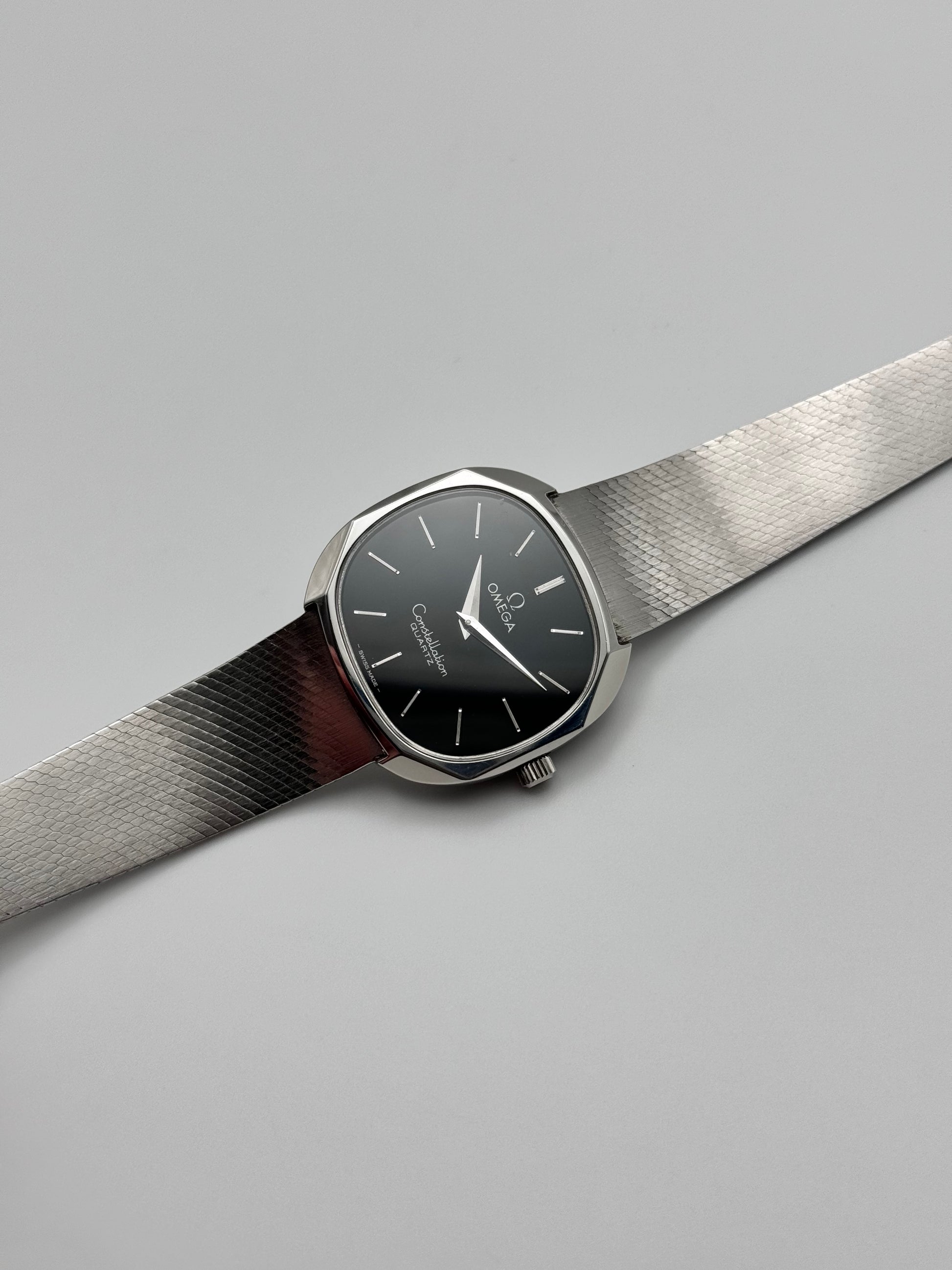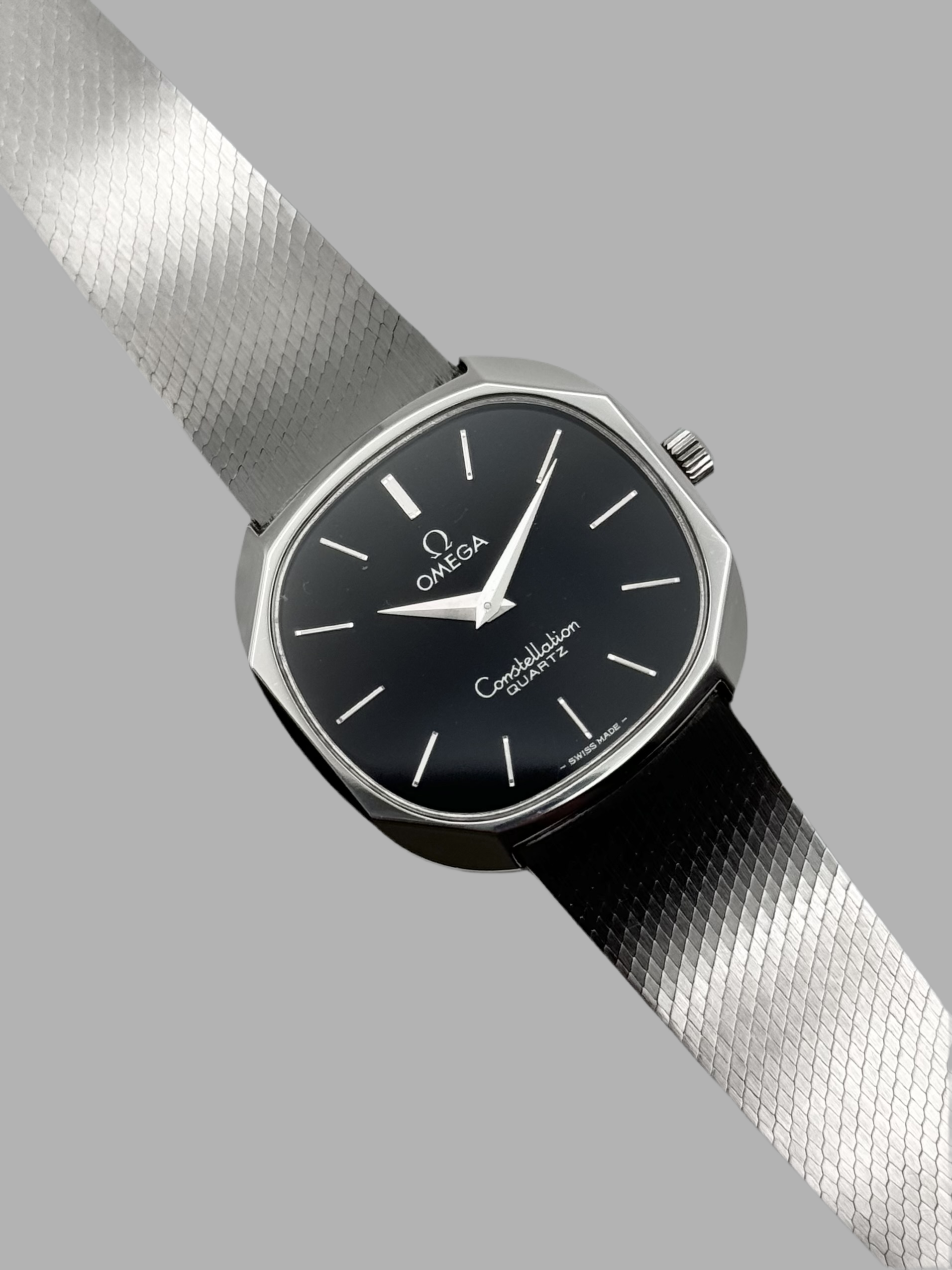 We have for sale a very rare Omega Constellation Quartz which features a beautiful black dial. The watch is in great condition both cosmetically and mechanically. It is keeping perfect time.
