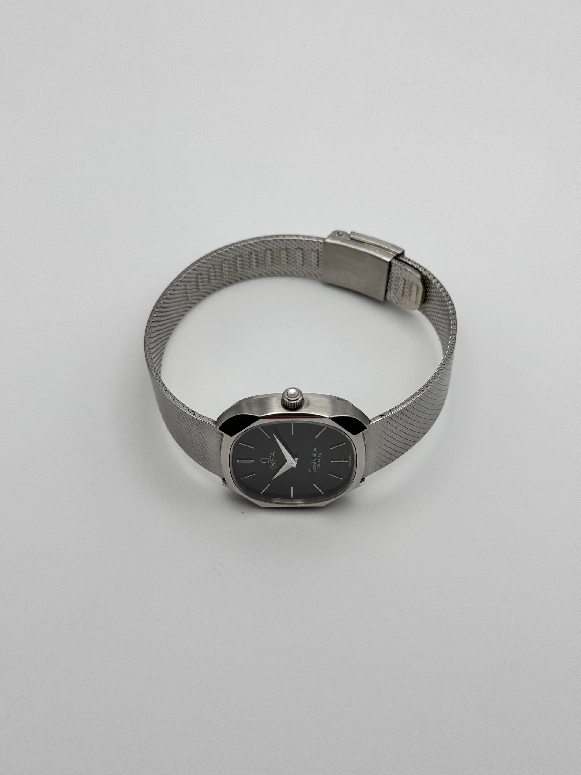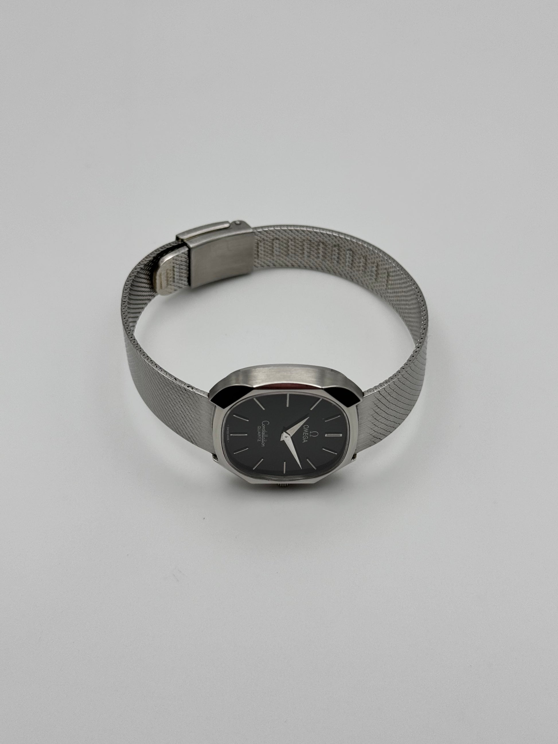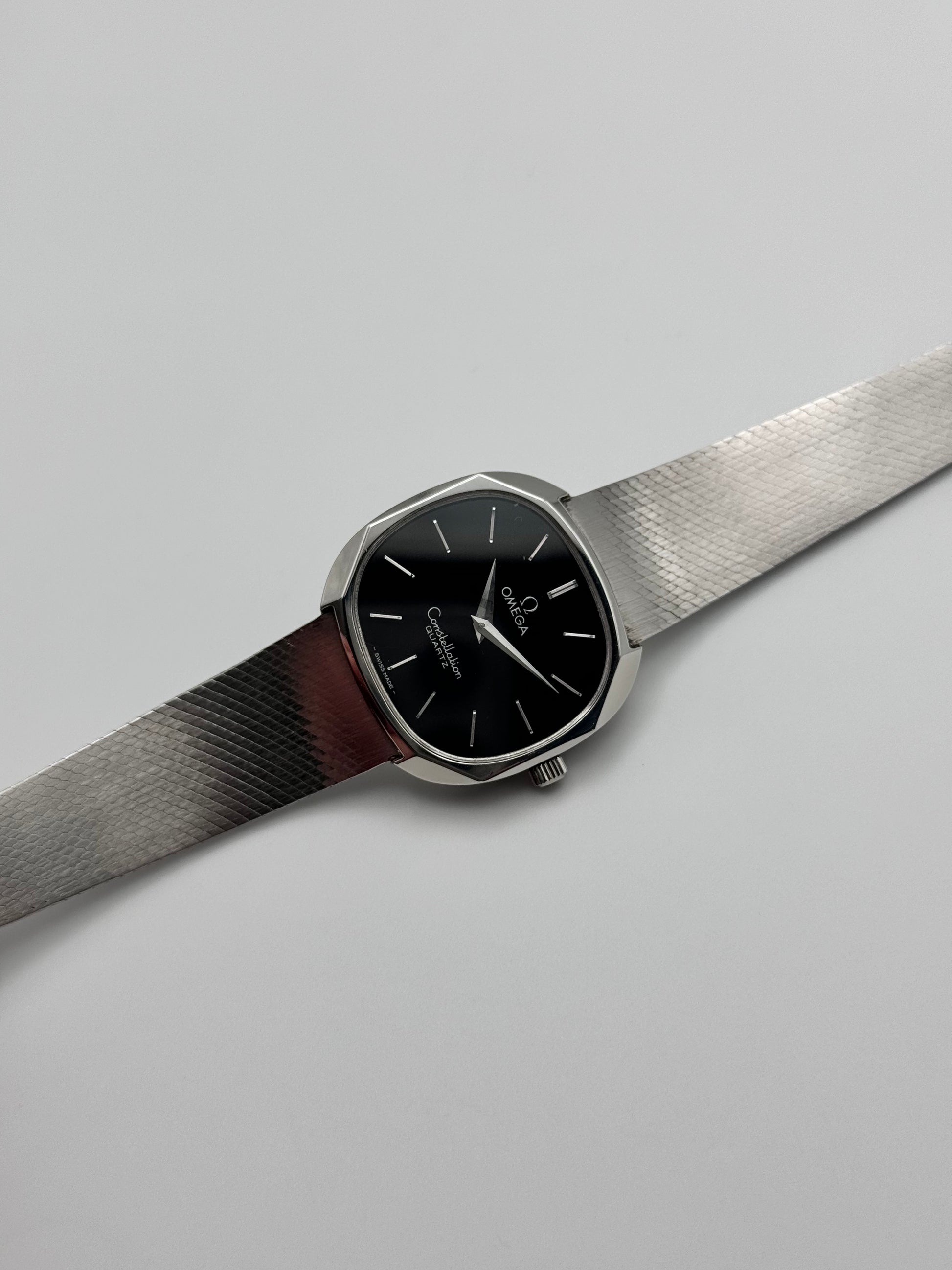 We have for sale a very rare Omega Constellation Quartz which features a beautiful black dial. The watch is in great condition both cosmetically and mechanically. It is keeping perfect time.