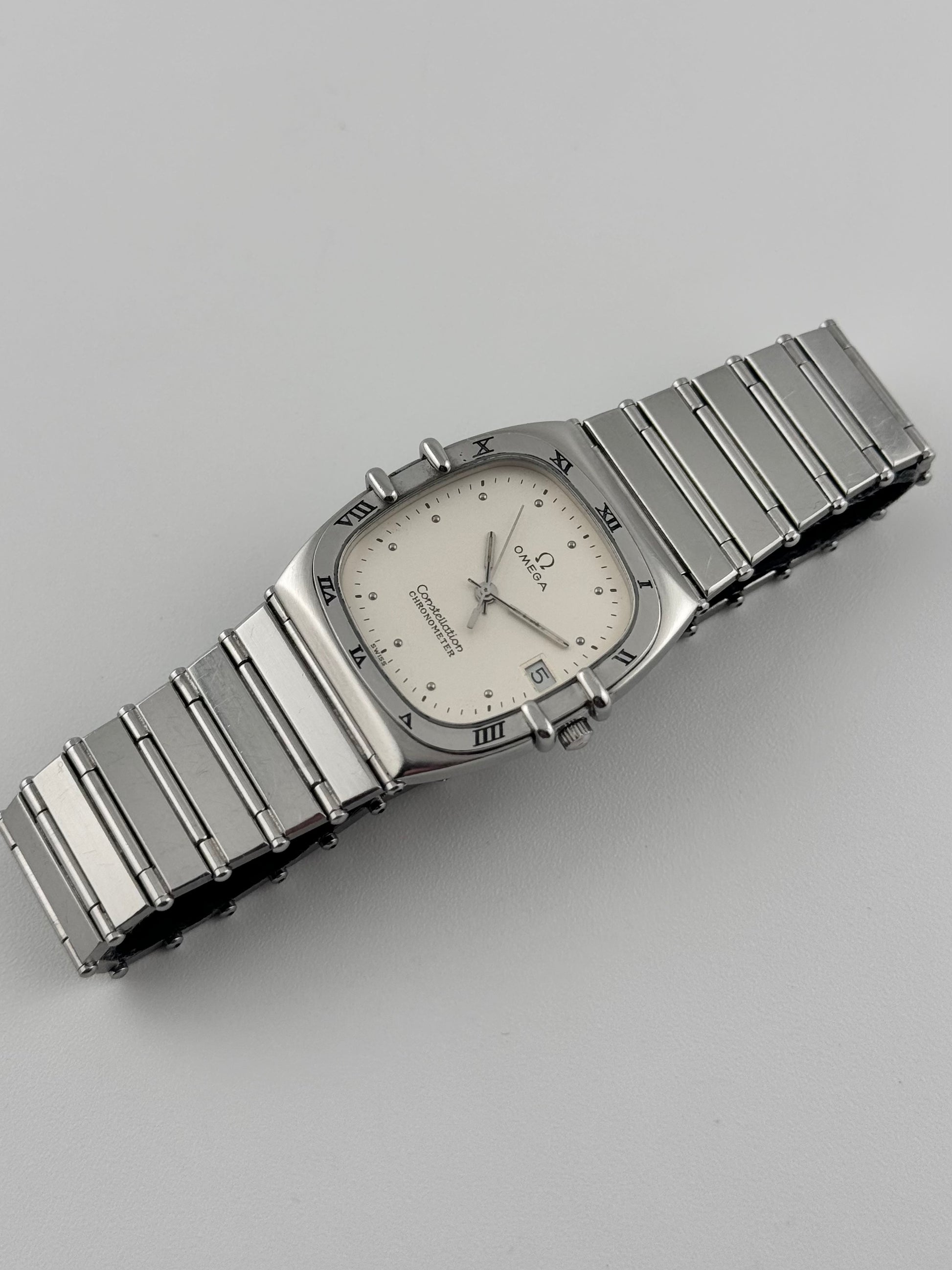 We have for sale a lovely unisex Omega Constellation Quartz which features a beautiful off white dial with a date complication. The watch is in great condition both cosmetically and mechanically. It is keeping perfect time.