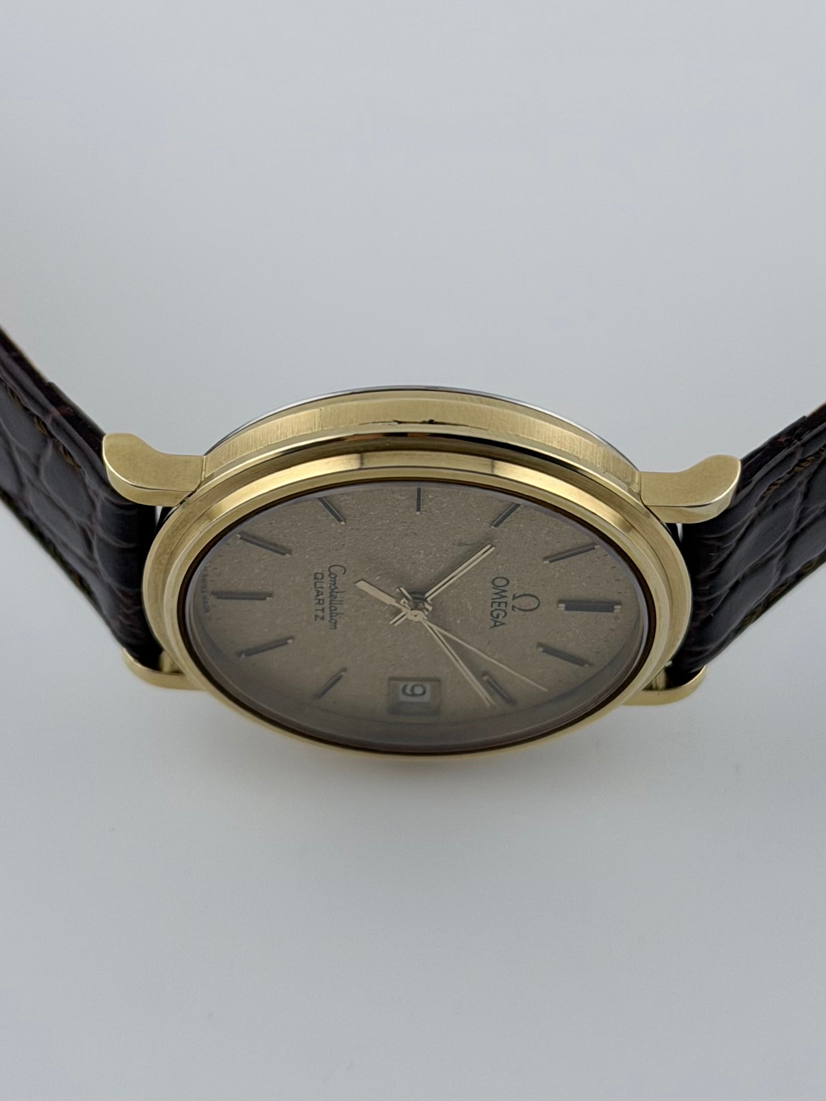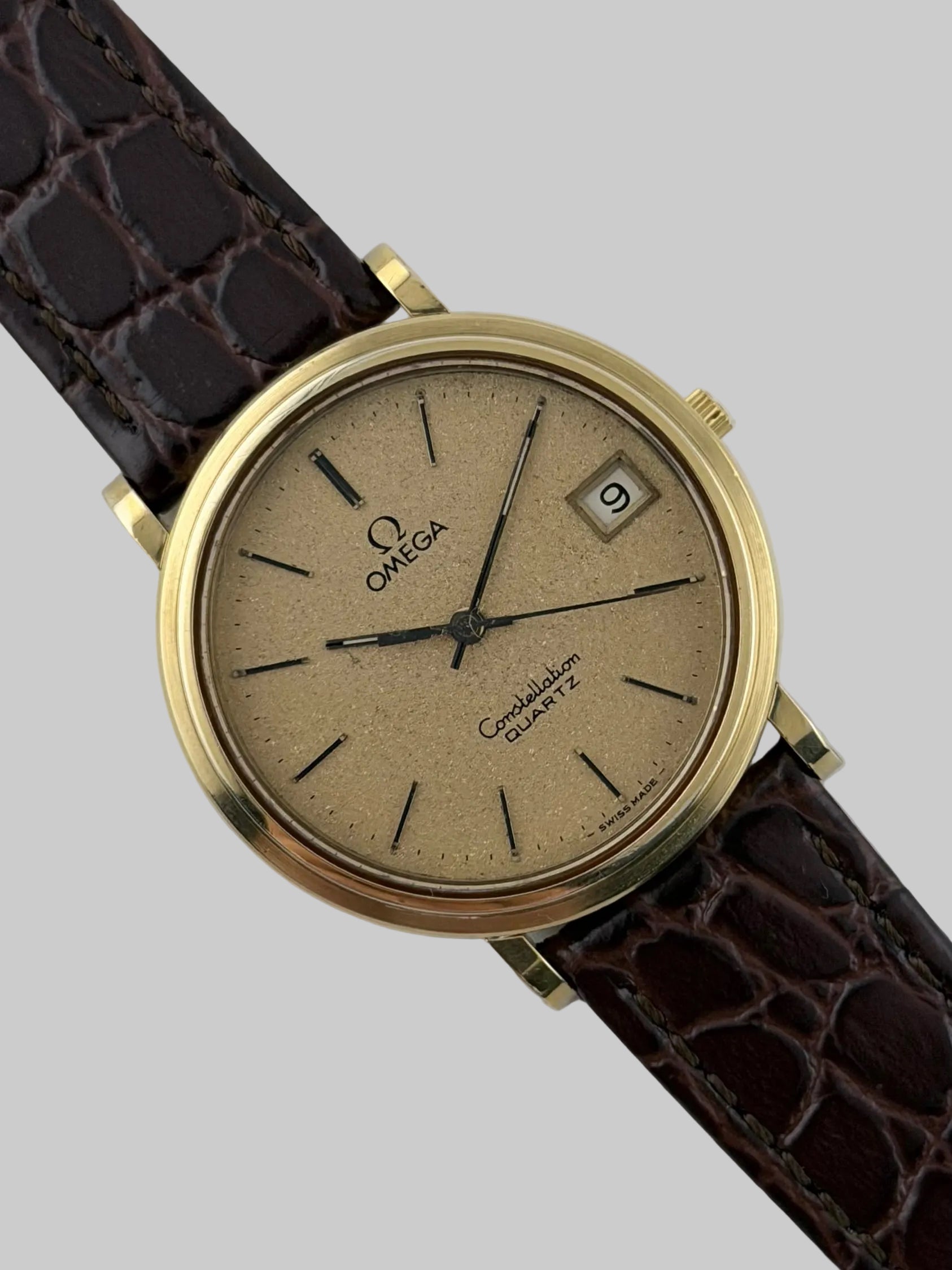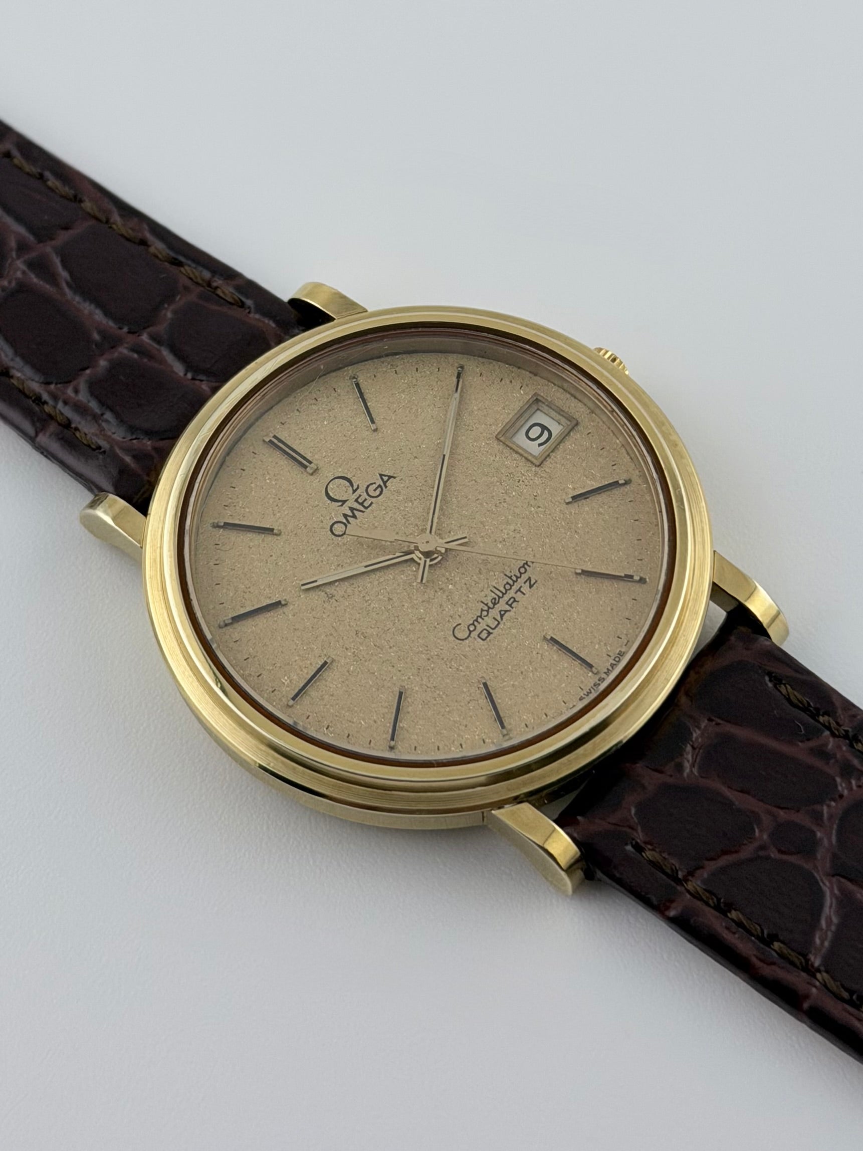 We have for sale an elegant vintage Omega Constellation Quartz featuring a stunning gold-tone “Galaxy” dial that beautifully reflects the light which includes a practical date complication window. This classic piece showcases Omega’s iconic late 1970s / early-1980s Constellation design with its refined, large, gold plated case with timeless dress-watch proportions. The watch is in great condition both cosmetically and mechanically, keeping excellent time.
