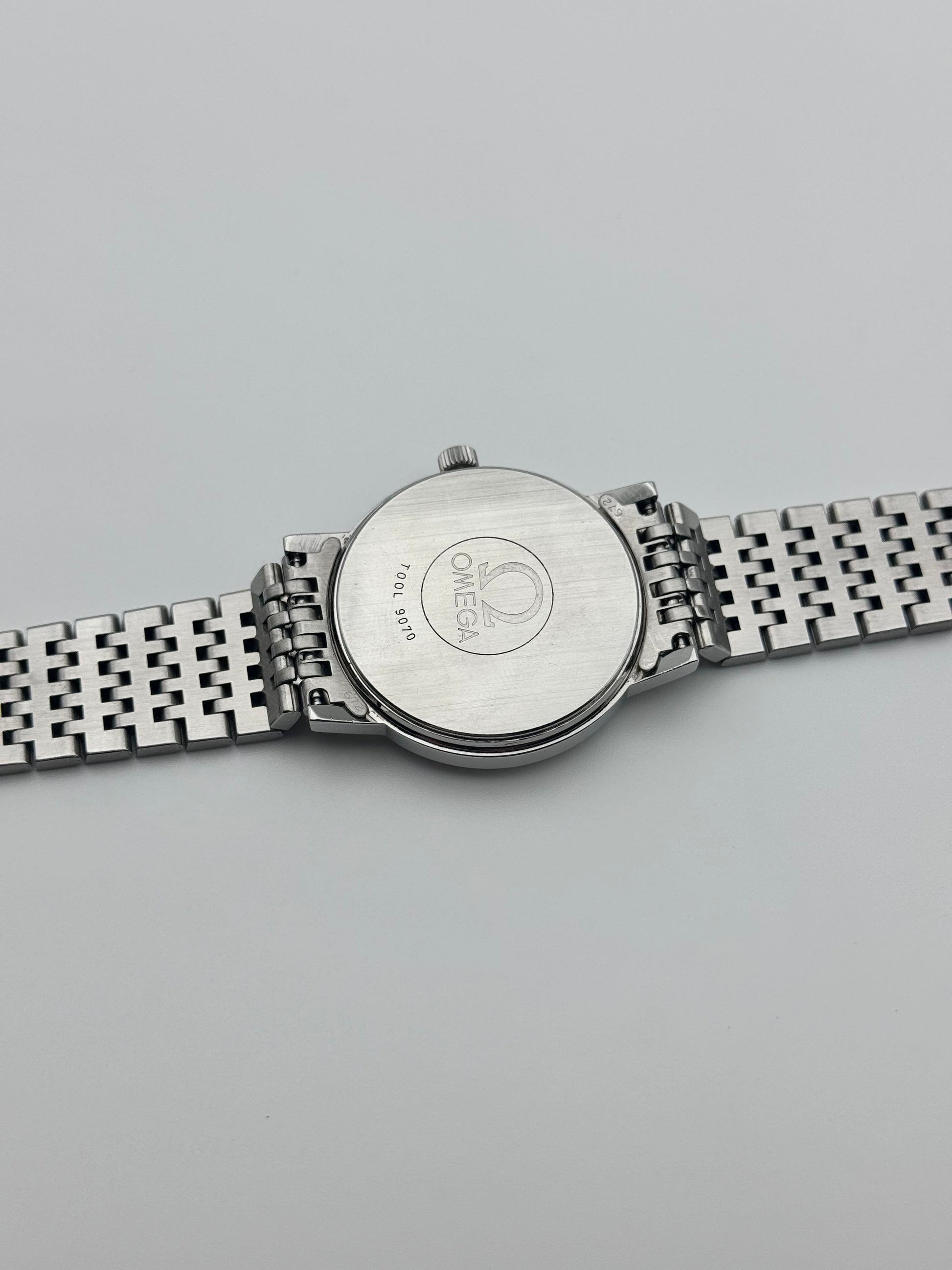 Crown - This model features an Omega stamped crown which is pulled out to its first setting to change the date and the second setting to change the time.