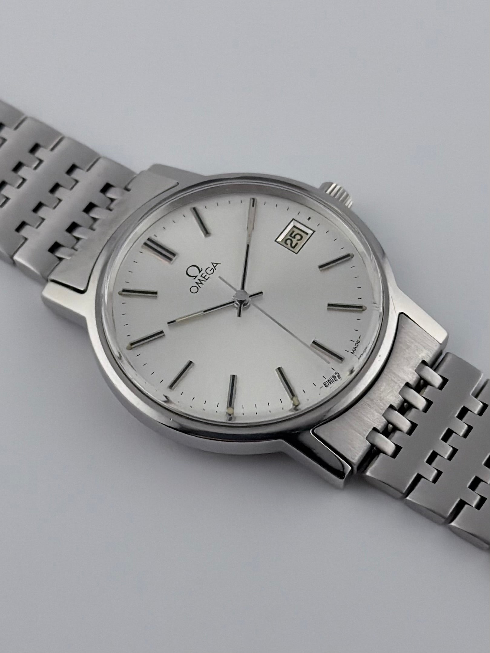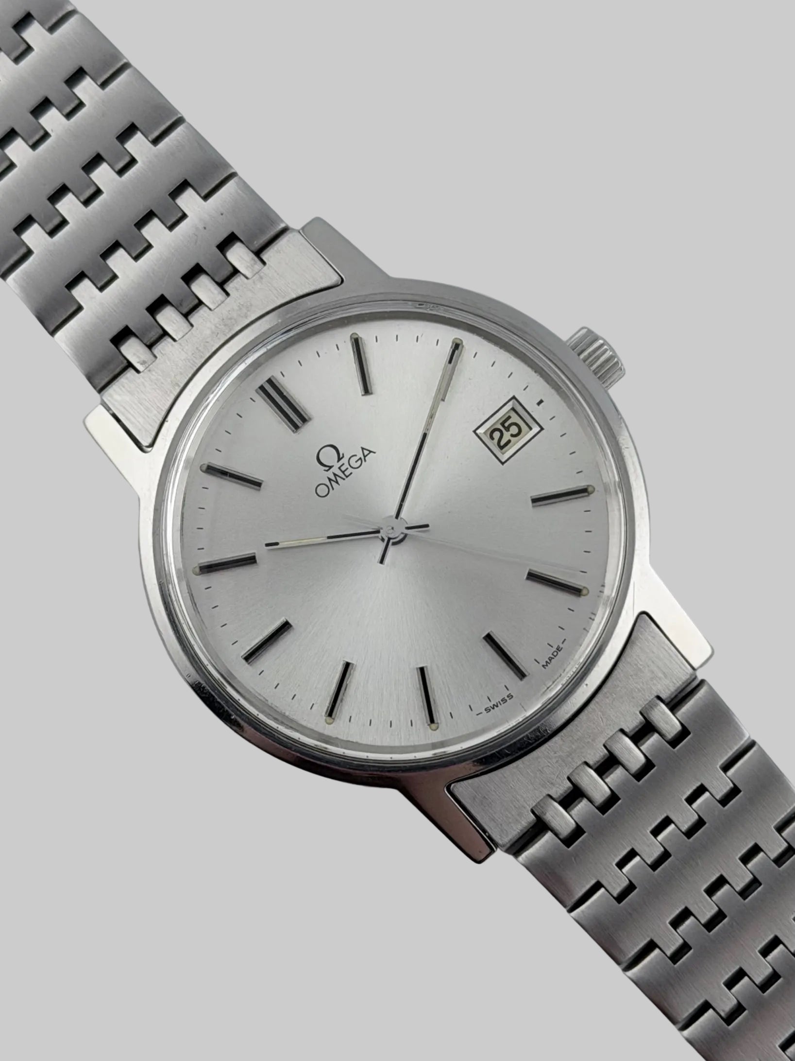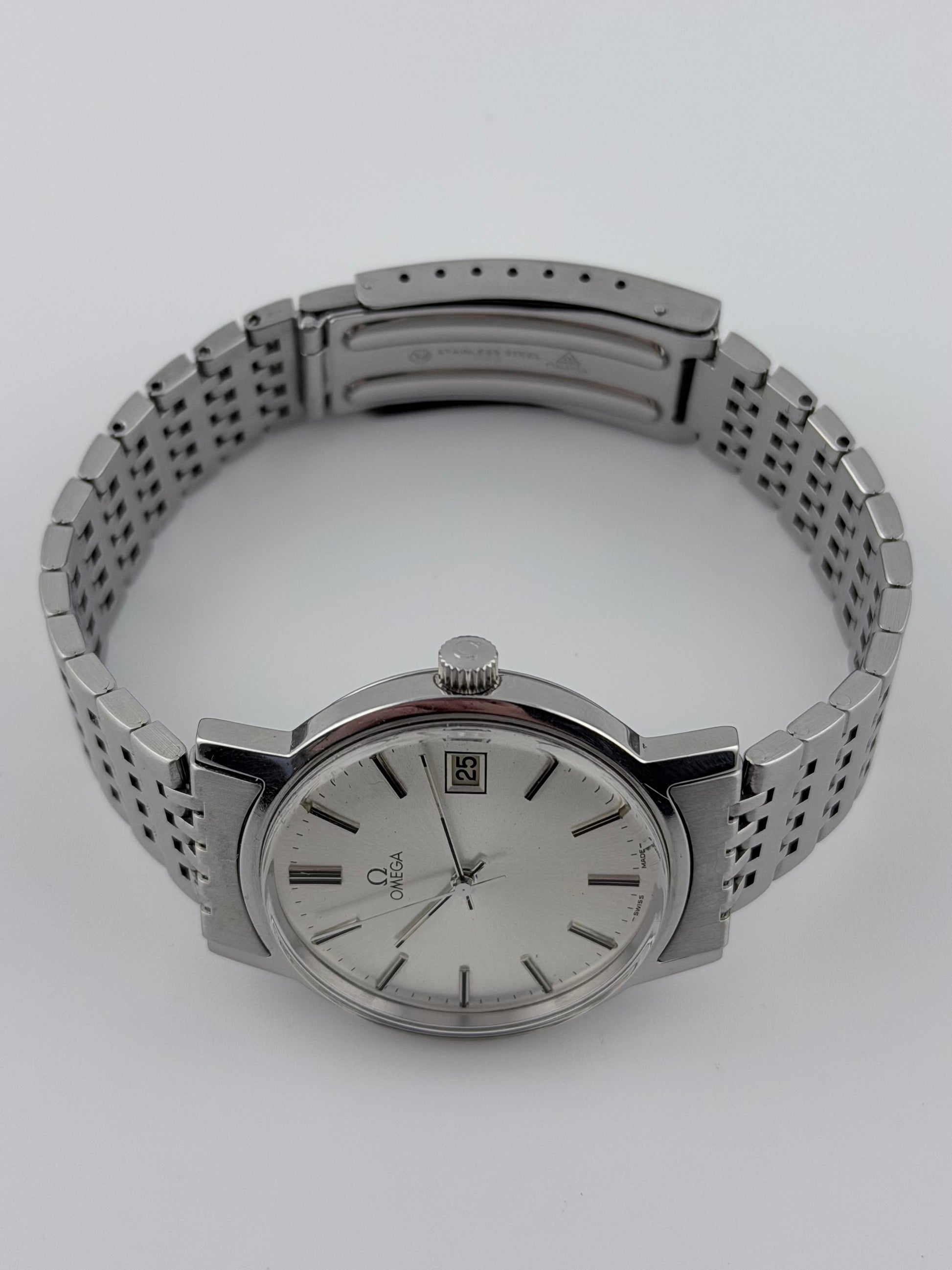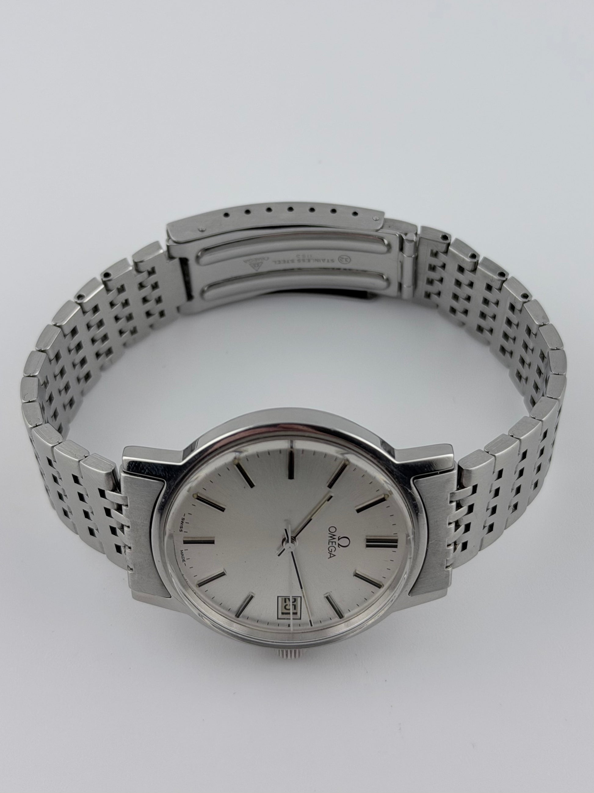 This is a spectacular looking vintage Omega which features a beautiful silver sunburst dial which displays a date complication. This watch is working perfectly, keeping great time and also sits on its original bracelet. Cosmetically the watch is in absolutely fantastic condition!