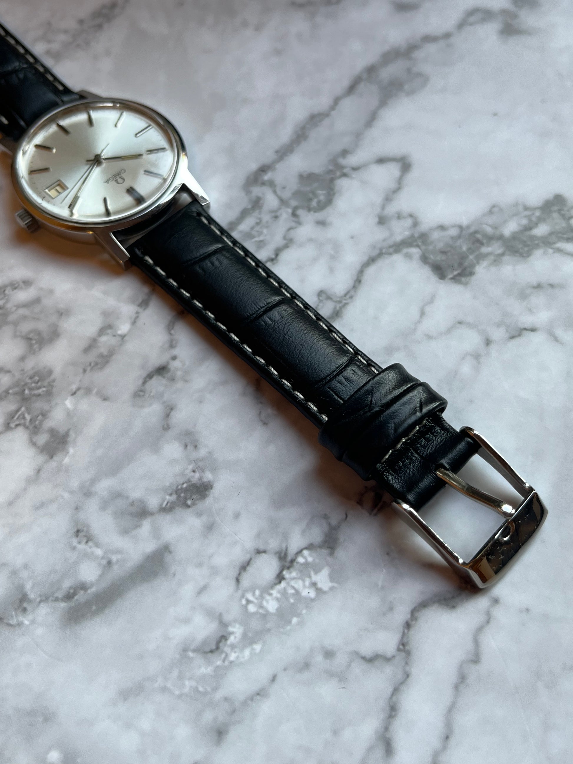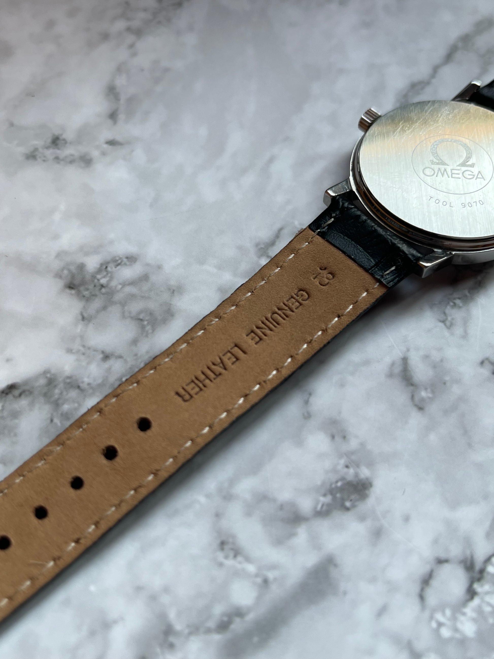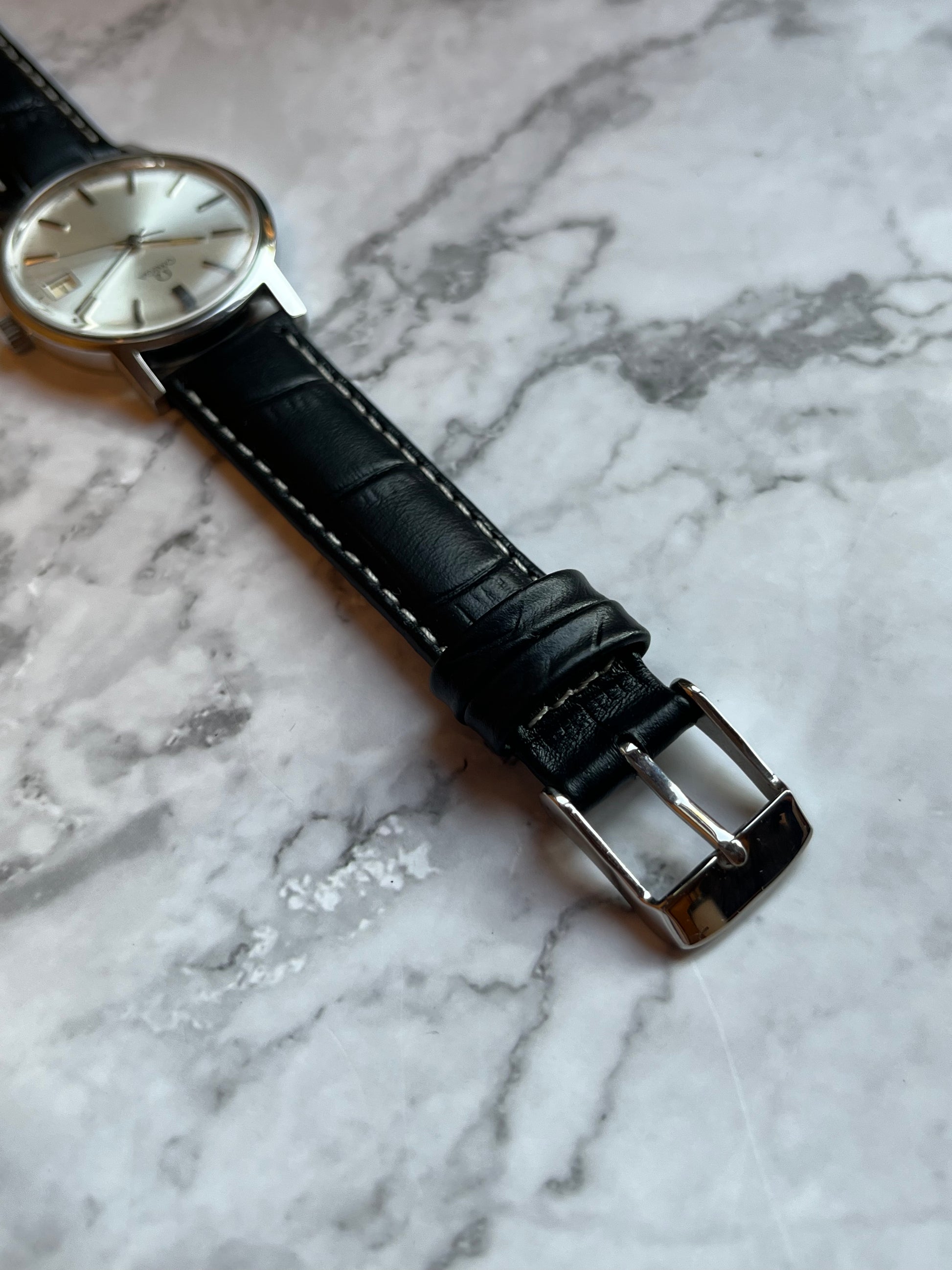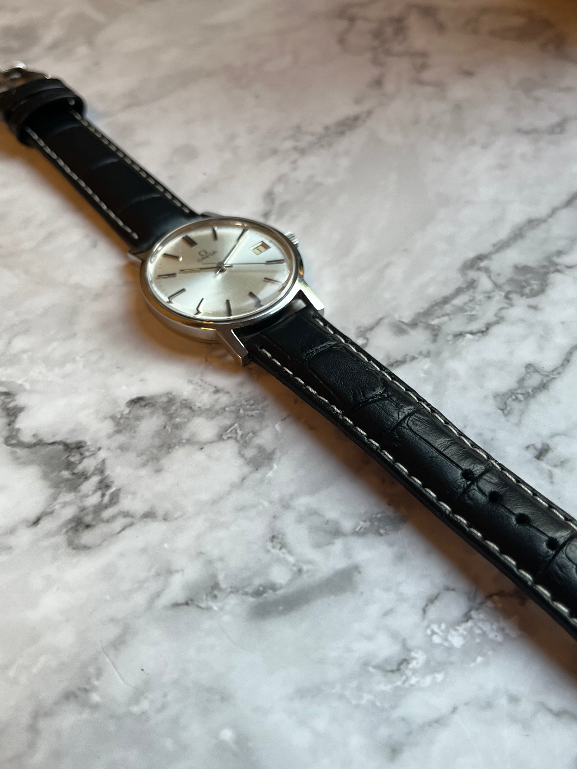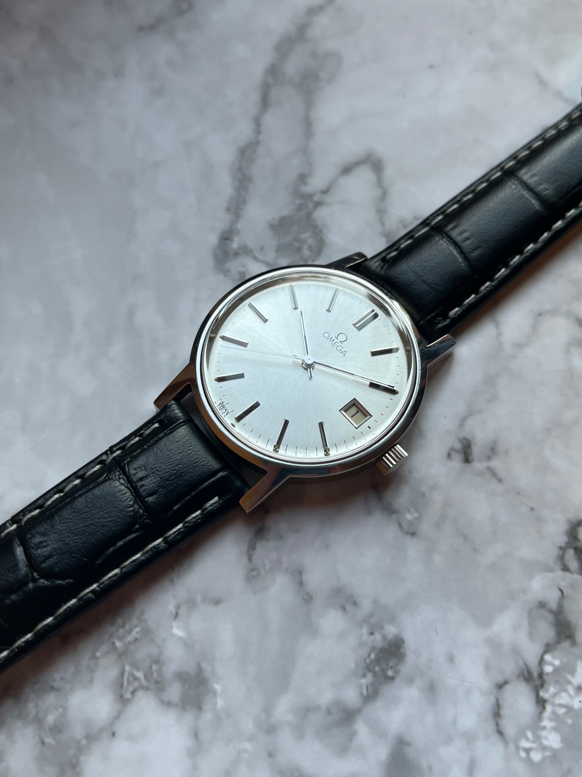 This is a beautiful steel Omega dress watch from 1979. This piece features a lovely silver sunburst dial which hosts a fully functional date complication. The watch’s manual wind movement is keeping excellent time within +/- 10 seconds per day. This is watch is original apart from its strap which is new. The Crystal has very few light scratches however these are almost invisible.