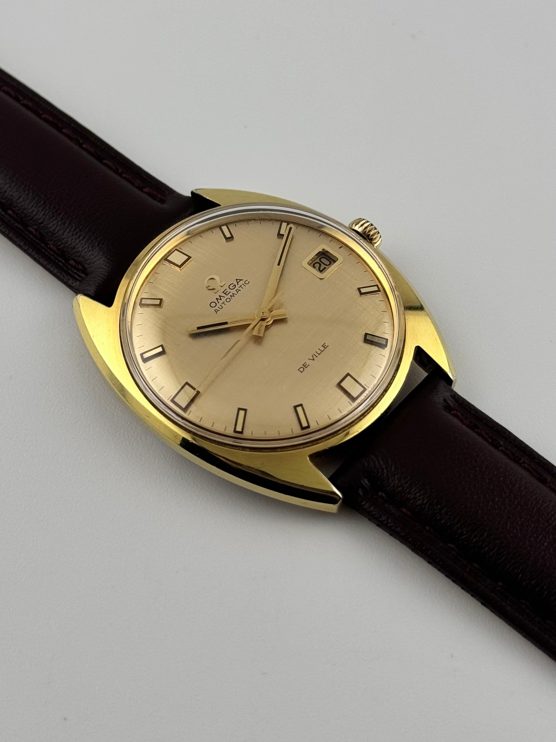 This Omega De Ville Automatic sports an uber rare dial which has a gold linen pattern that looks absolutely amazing. We have not seen this dial before on this case reference, it is a real rarity and even more so because the dial is mint! PLUS - it also comes with its original paperwork which includes the Omega International Guarantee with the page that includes the serial number and spec as well as the 'You and Your Omega' booklet. PLUS - the original box. Mechanically, the watch is working perfectly and keeping good time within specification. If you are a collector you will want this one as finding another with this dial and all of the paperwork is close to the work of a Unicorn hunter!