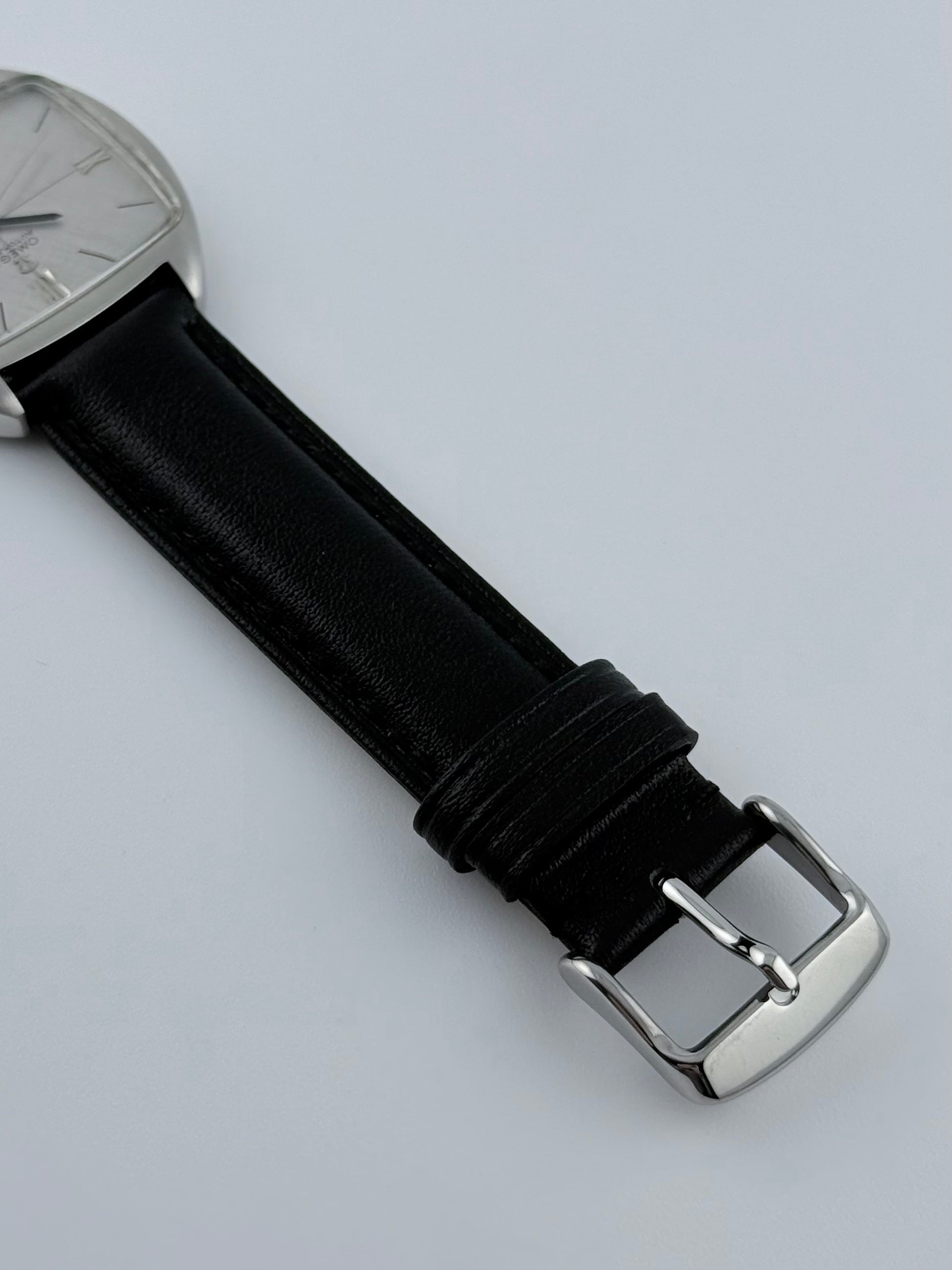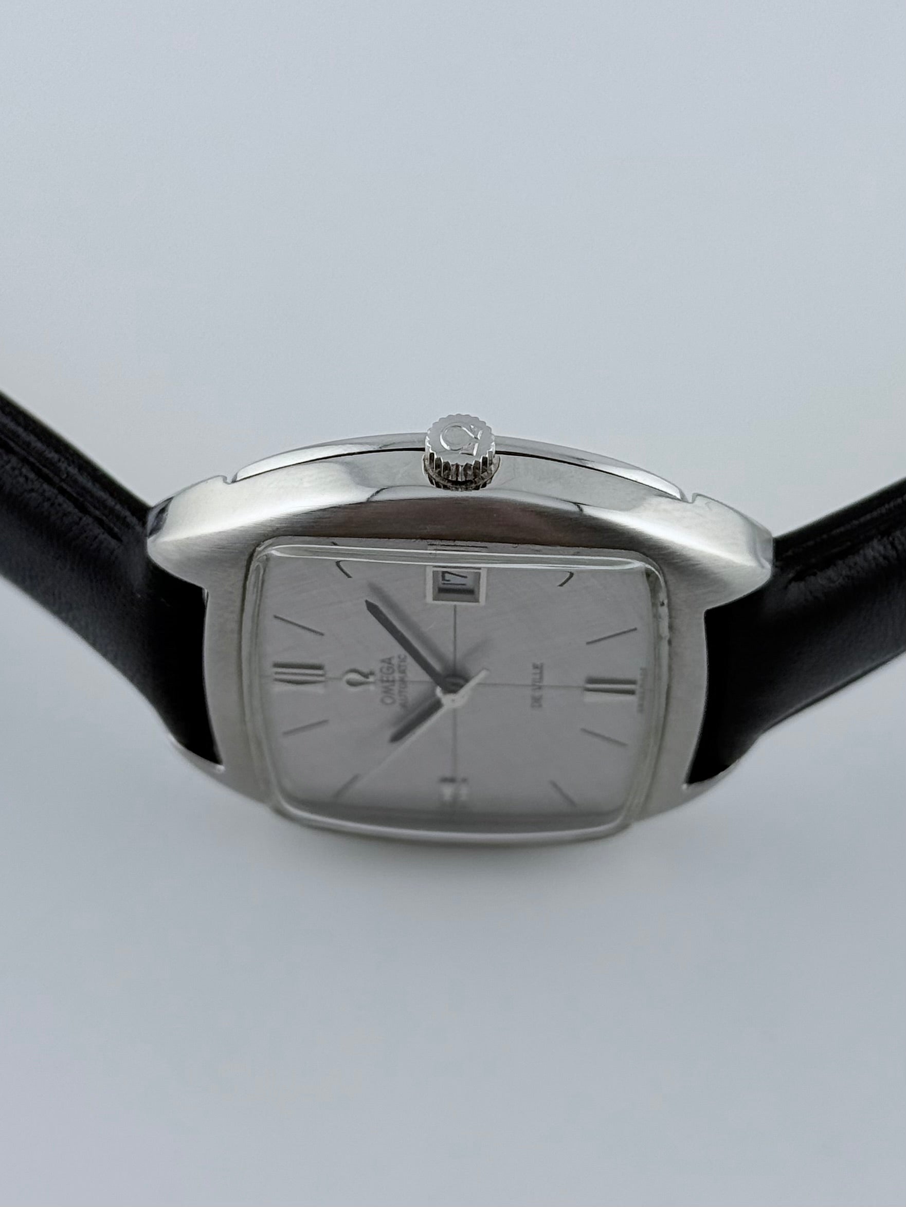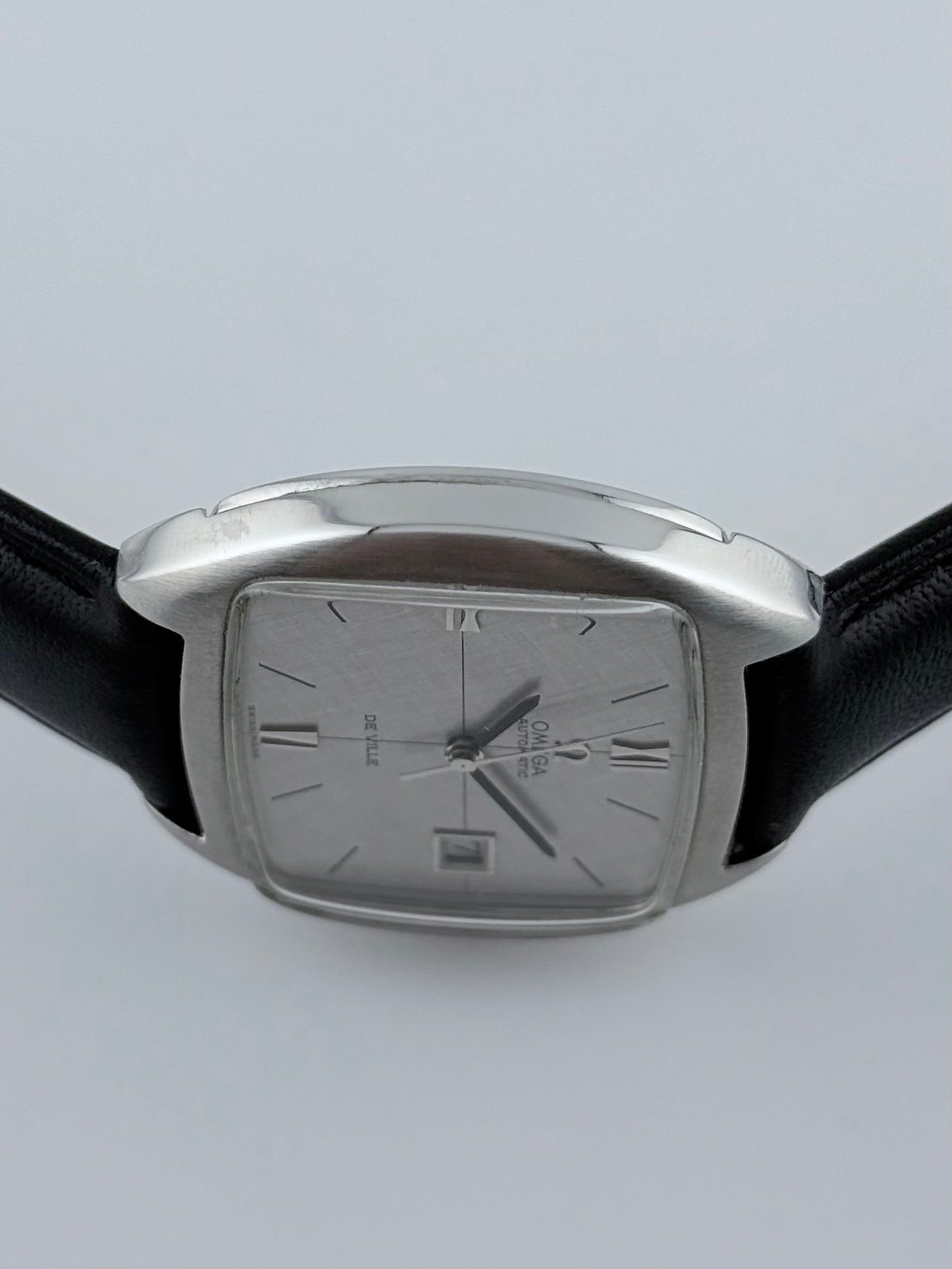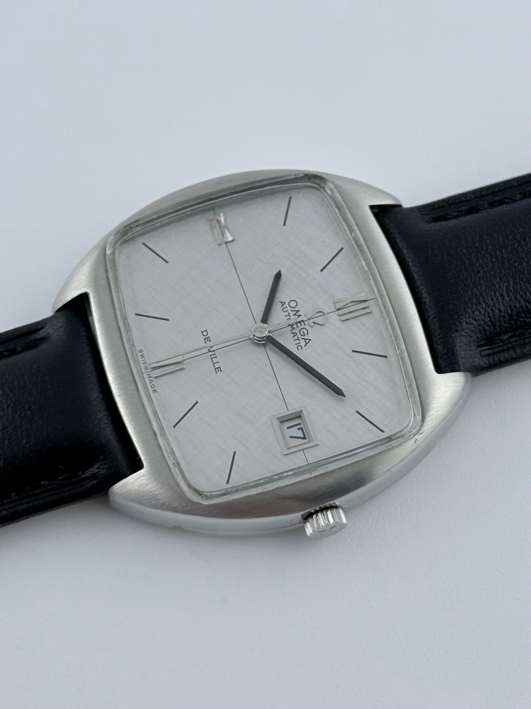 This really is a superb and rare to find Omega De Ville special production from 1970 in absolutely fantastic condition for its age. This fabulous watch features a very distinctive shaped case housing a stunning and rare silver crosshair linen dial with rare Roman numerals at 6-9-12 alternating with very fine blued indices, also embellished by blued hands and a fully functional date complication. This particular example is in stunning condition, working perfectly and keeping excellent time within specification. A truly fantastic addition to any watch collection.