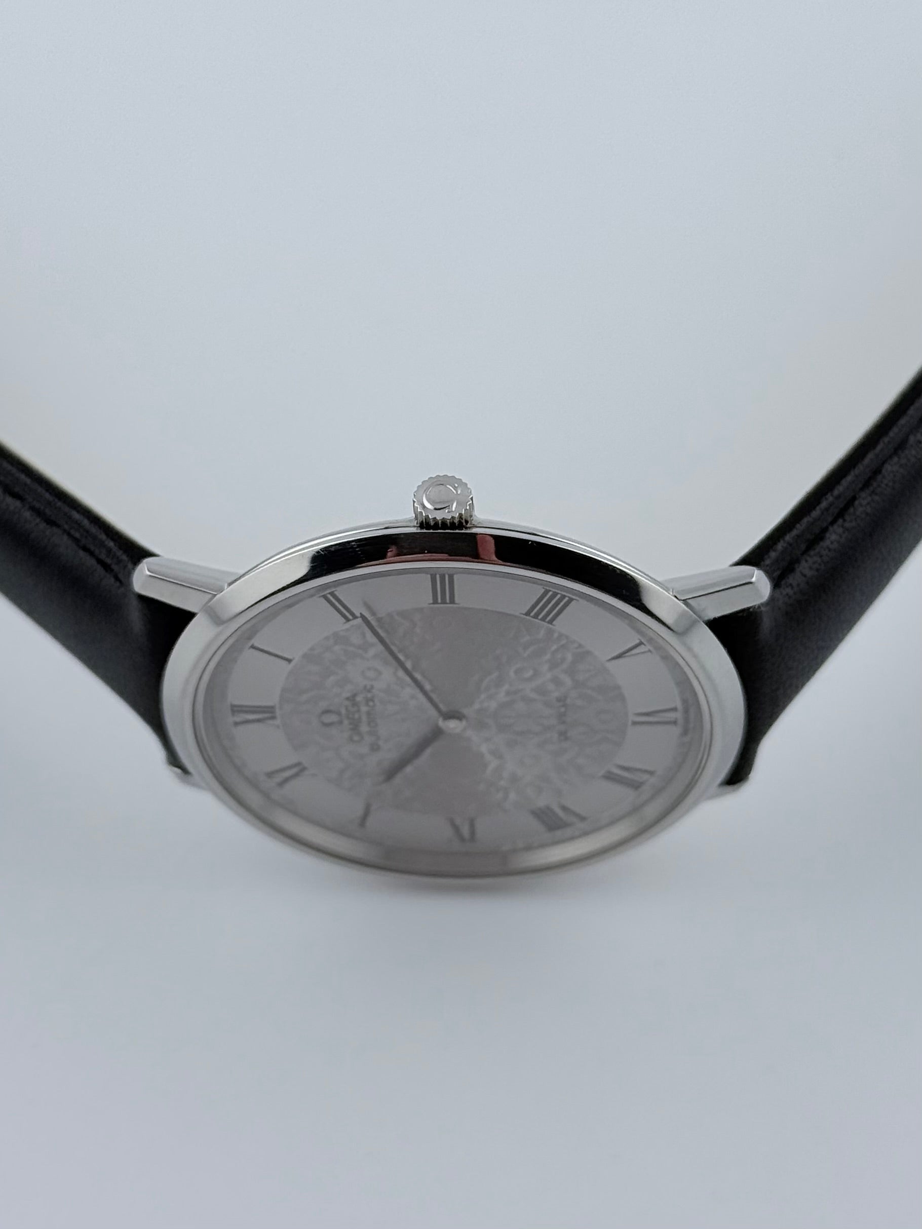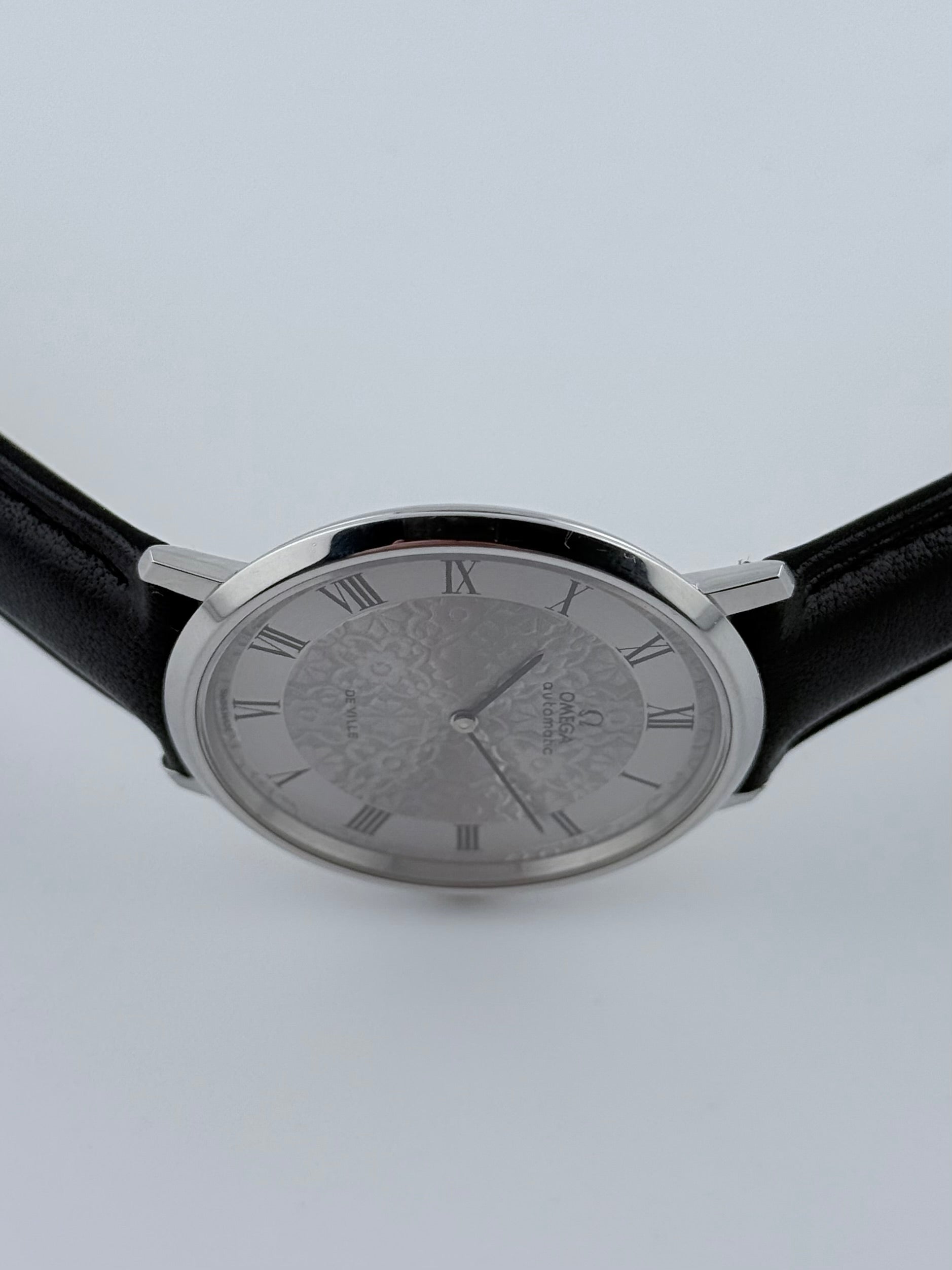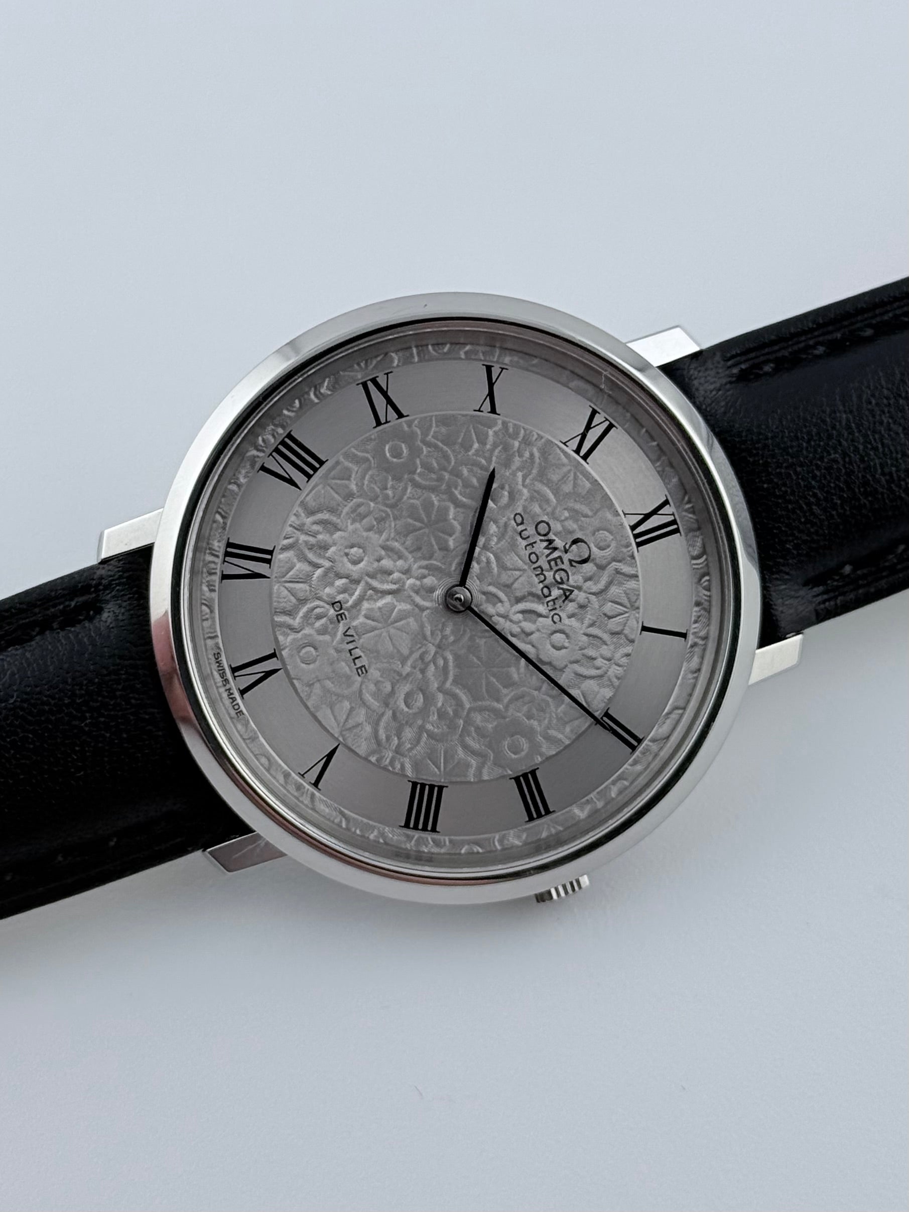 This is a stunning vintage Omega De Ville automatic with a very unusual and striking dial from the 1970s preserved in pristine condition. The full stainless steel profile of this beautiful watch combines the intricately designed pressed flower motif dial with smoothly brushed inner ring displaying Roman numerals and a polished stainless steel case. This example is in incredible condition for its age showing only minimal signs of wear, if any. Mechanically, this piece is running perfectly, keeping excellent time.