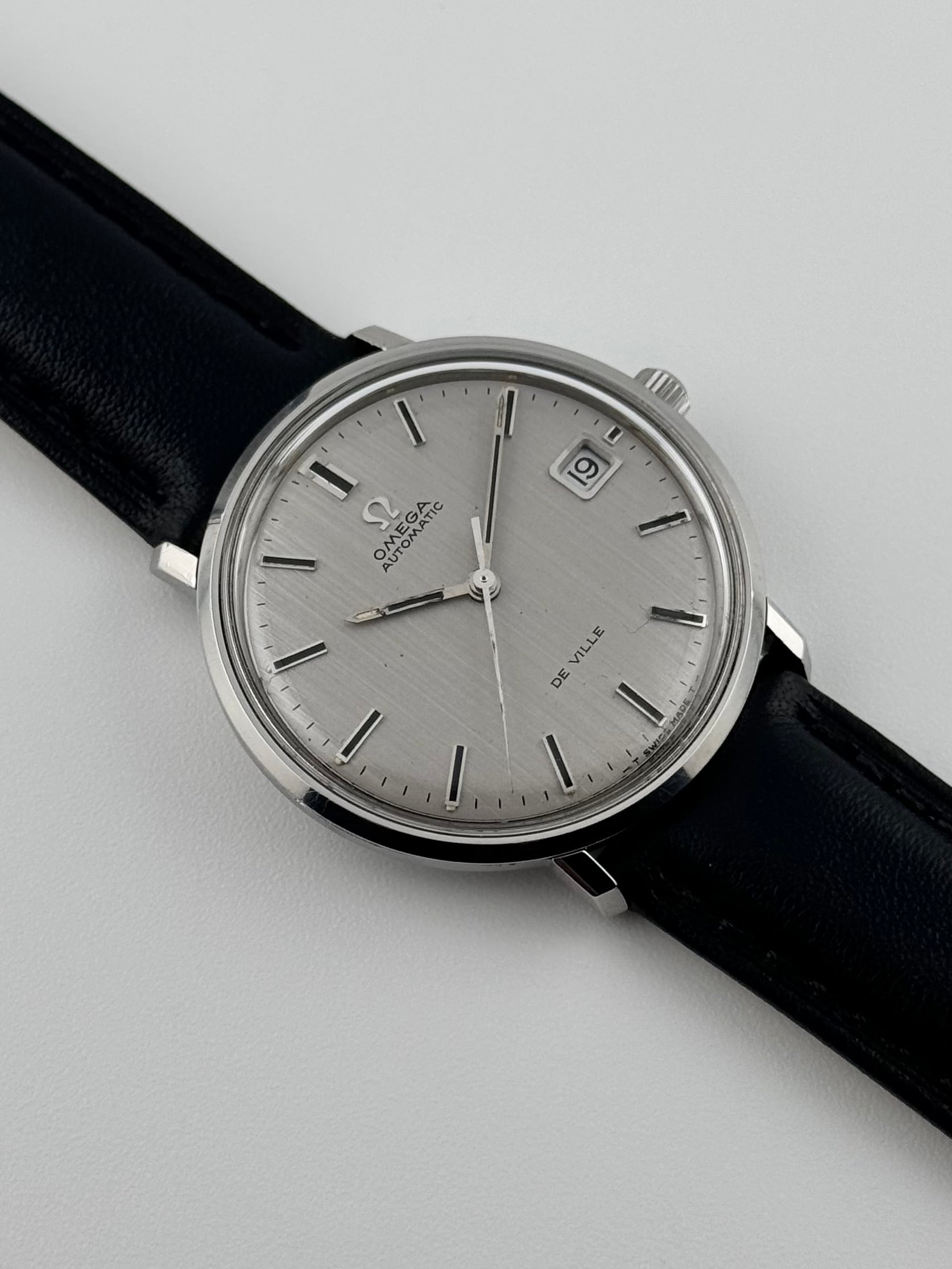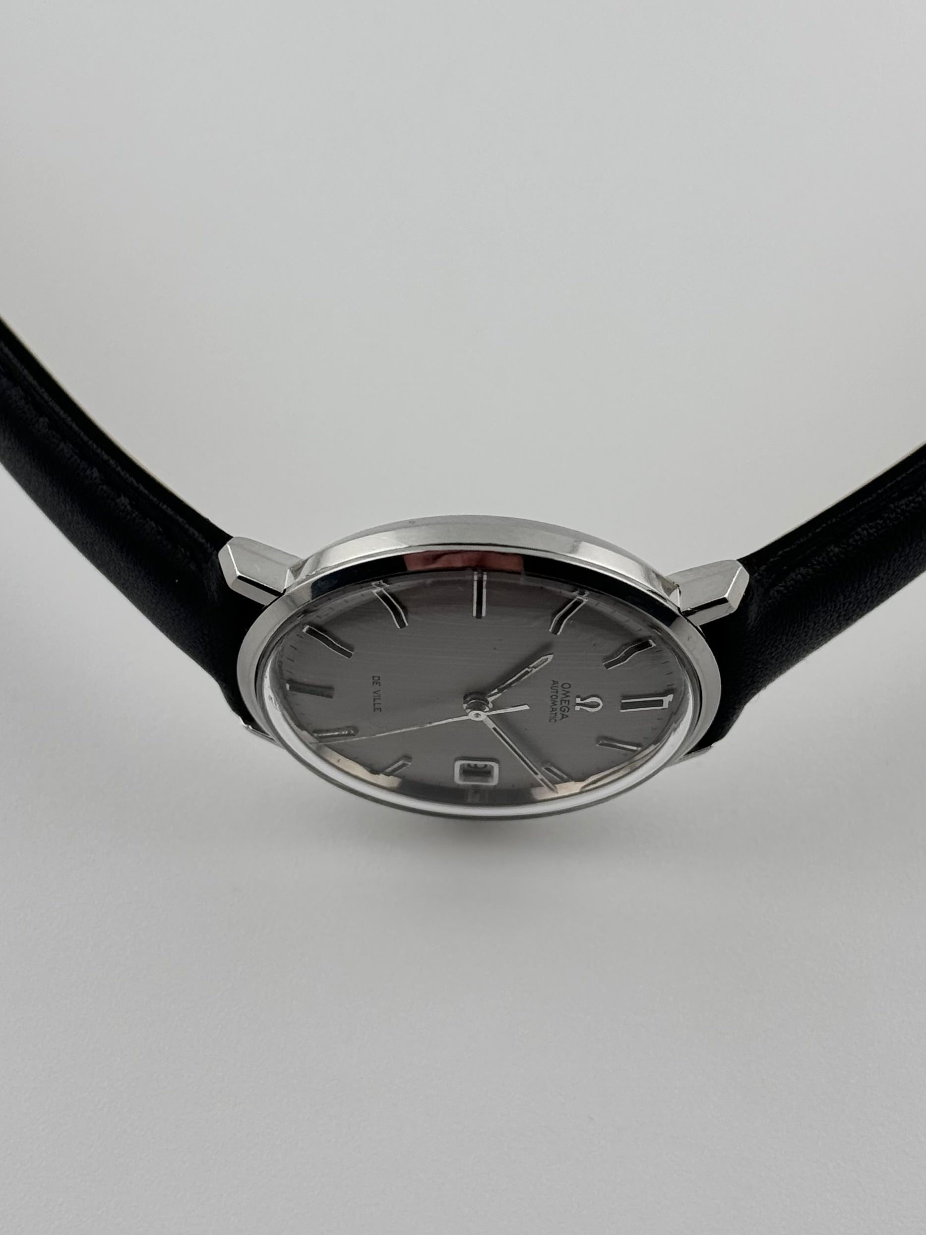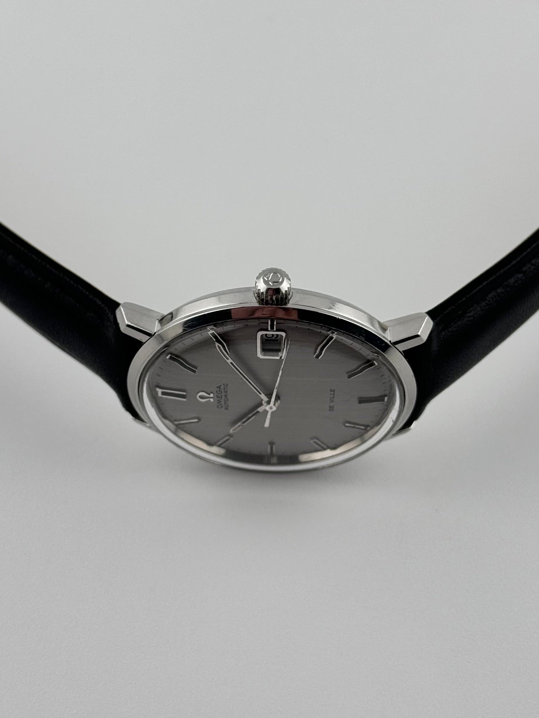 This is a beautiful vintage Omega De Ville automatic date. This model features a very rare brushed grey dial with black and silver markers. It also displays a fully functional date complication. This example is in incredible condition for its age showing only very light signs of wear over the years. Overall it is a great looking watch. This particular piece is running perfectly within specification.