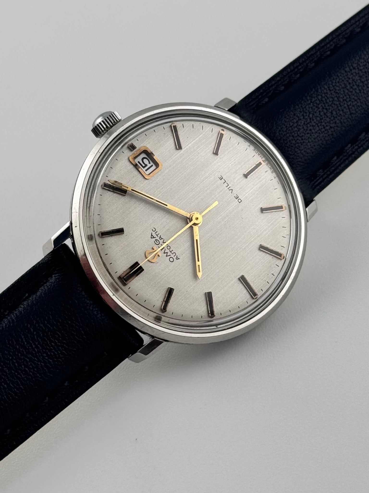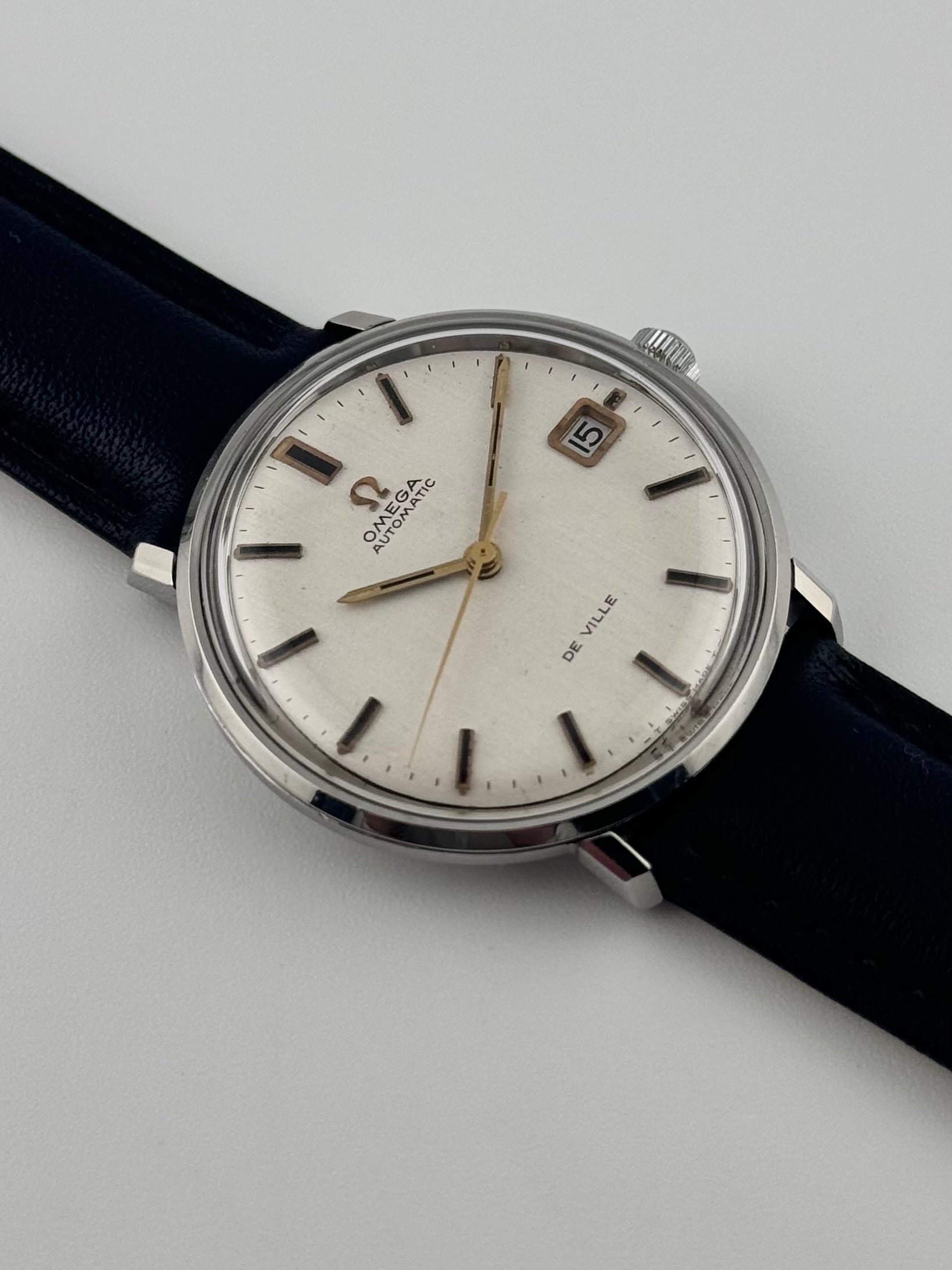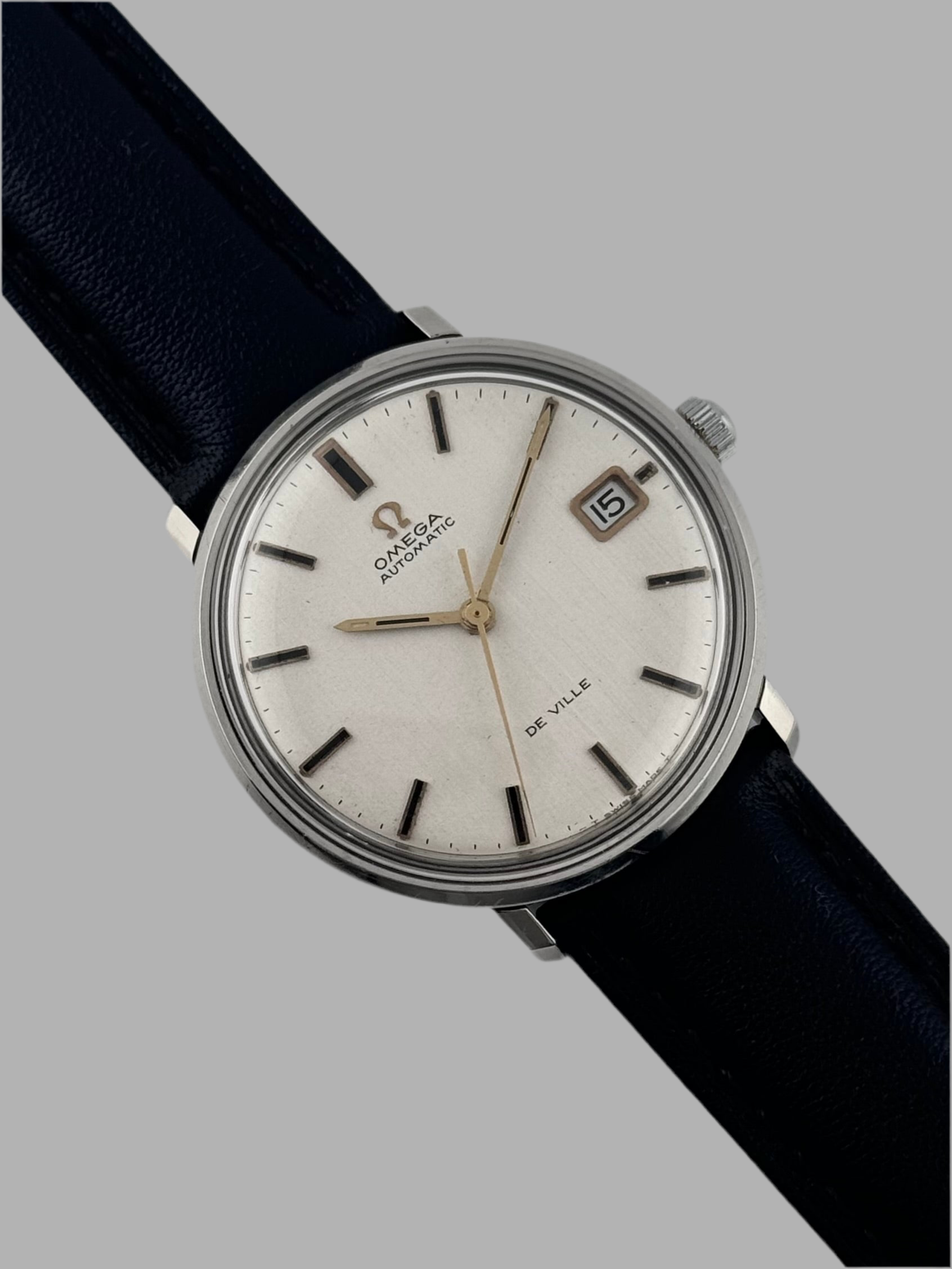 This is a beautiful vintage Omega De Ville automatic date. This model features a vertical striped white satin dial which provides a beautiful finish that catches the light perfectly and combined with the black and gold coloured hour markers, this is a dial that really pops! It also displays a fully functional date complication. This particular piece has just had a full service and is running perfectly within specification.