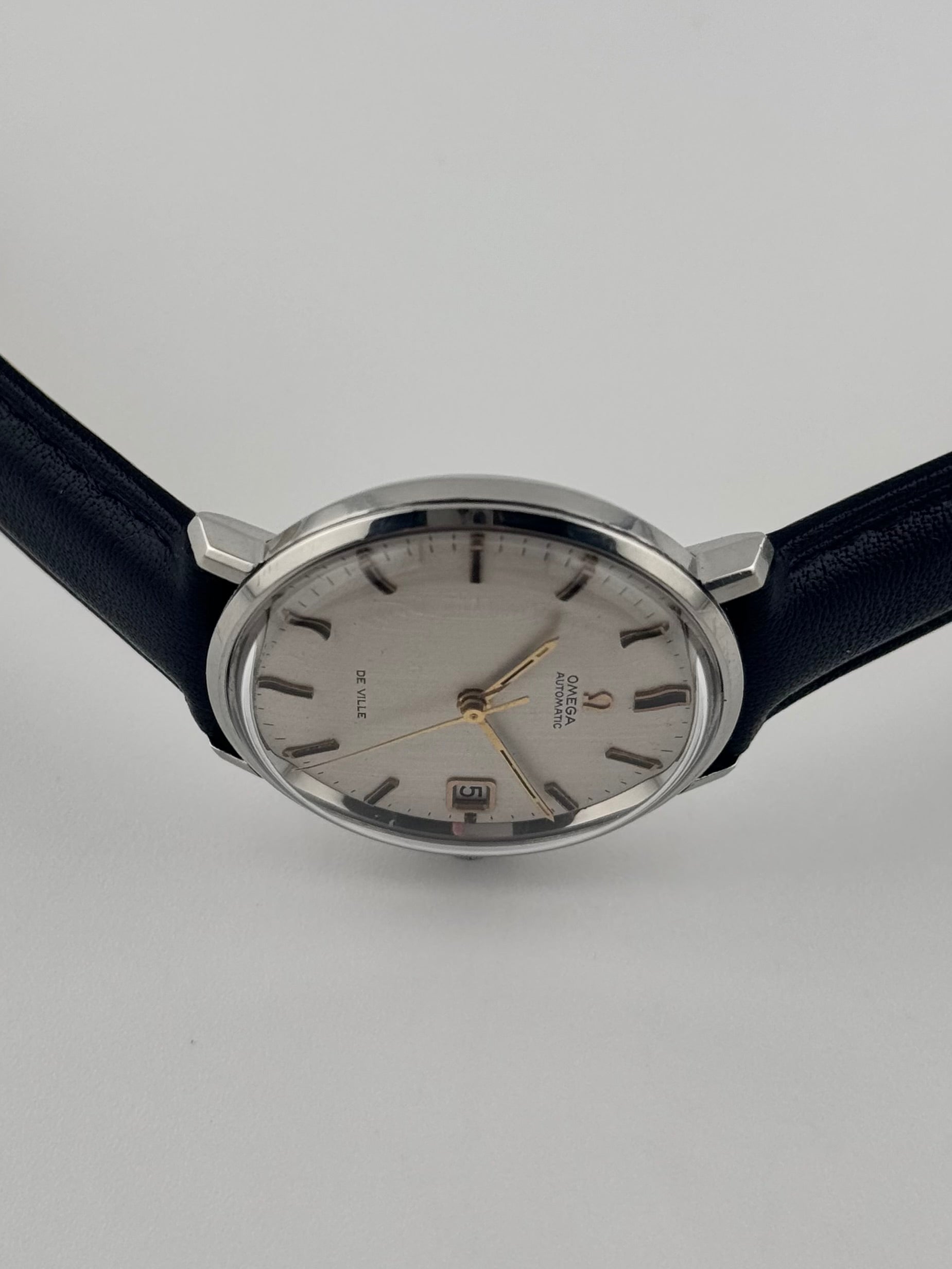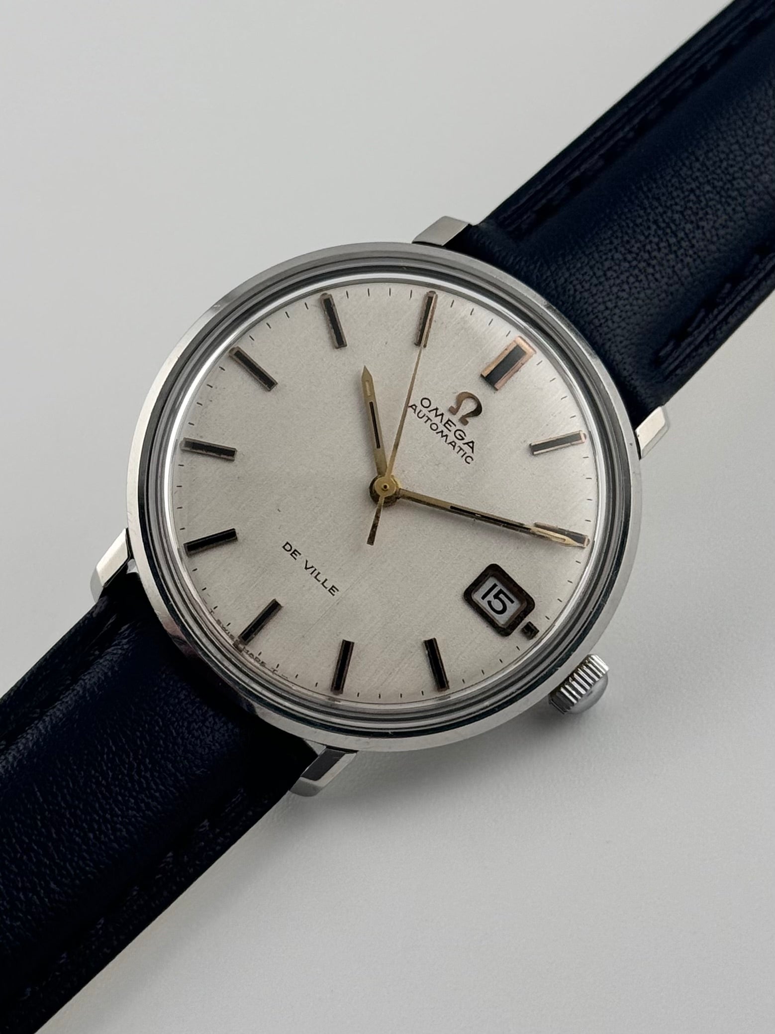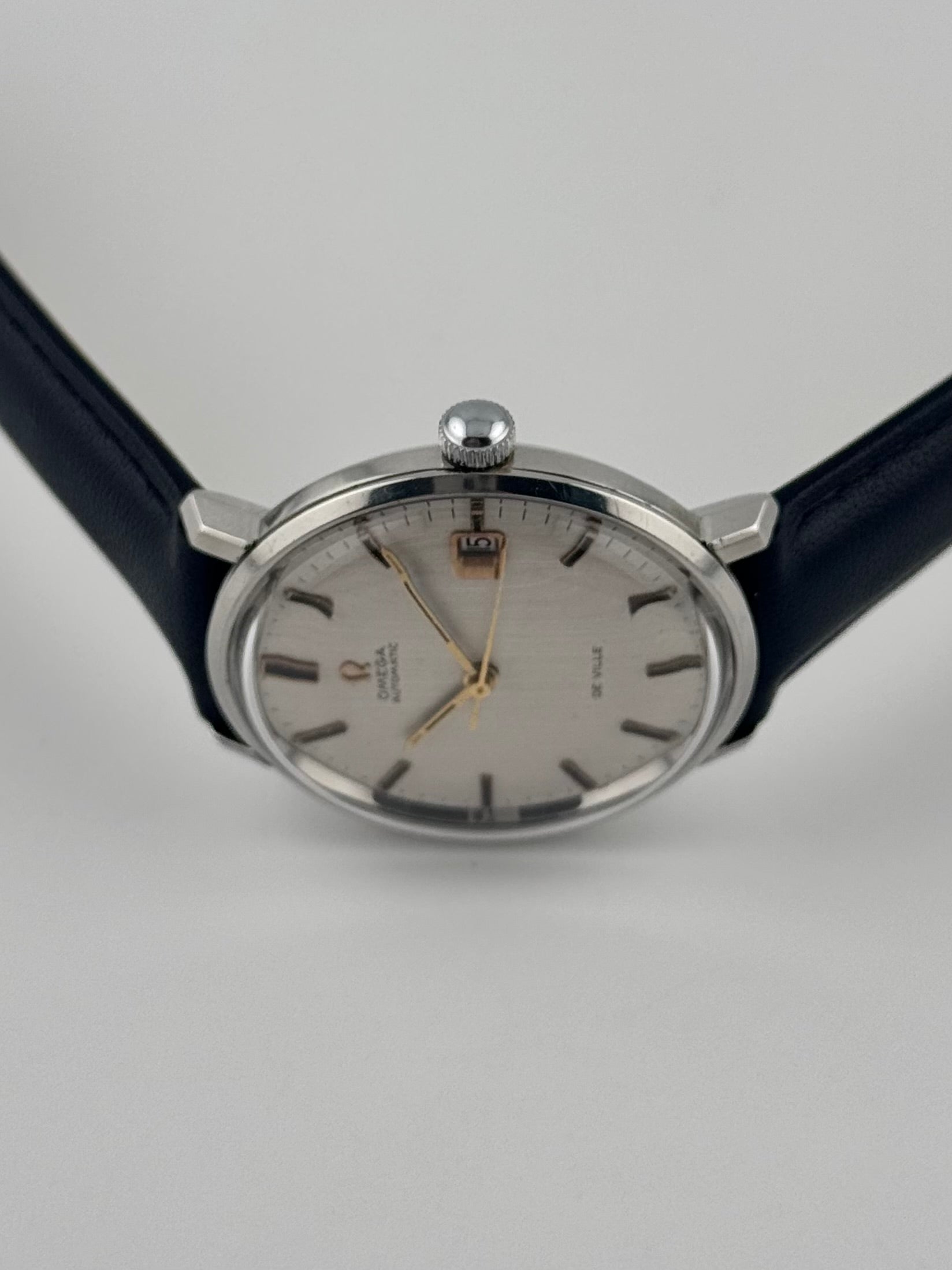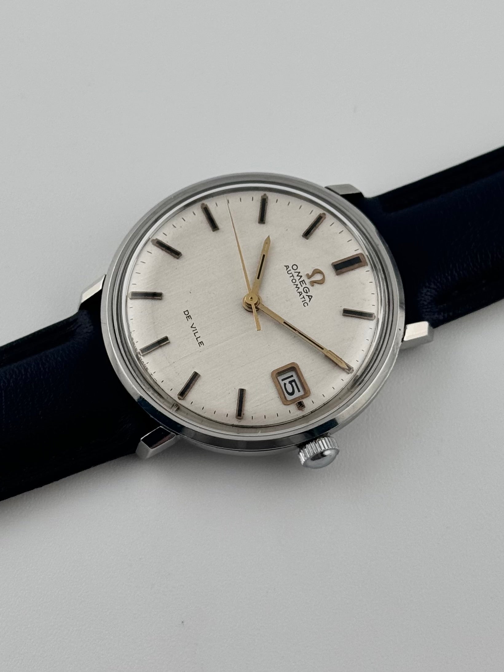 This is a beautiful vintage Omega De Ville automatic date. This model features a vertical striped white satin dial which provides a beautiful finish that catches the light perfectly and combined with the black and gold coloured hour markers, this is a dial that really pops! It also displays a fully functional date complication. This particular piece has just had a full service and is running perfectly within specification.