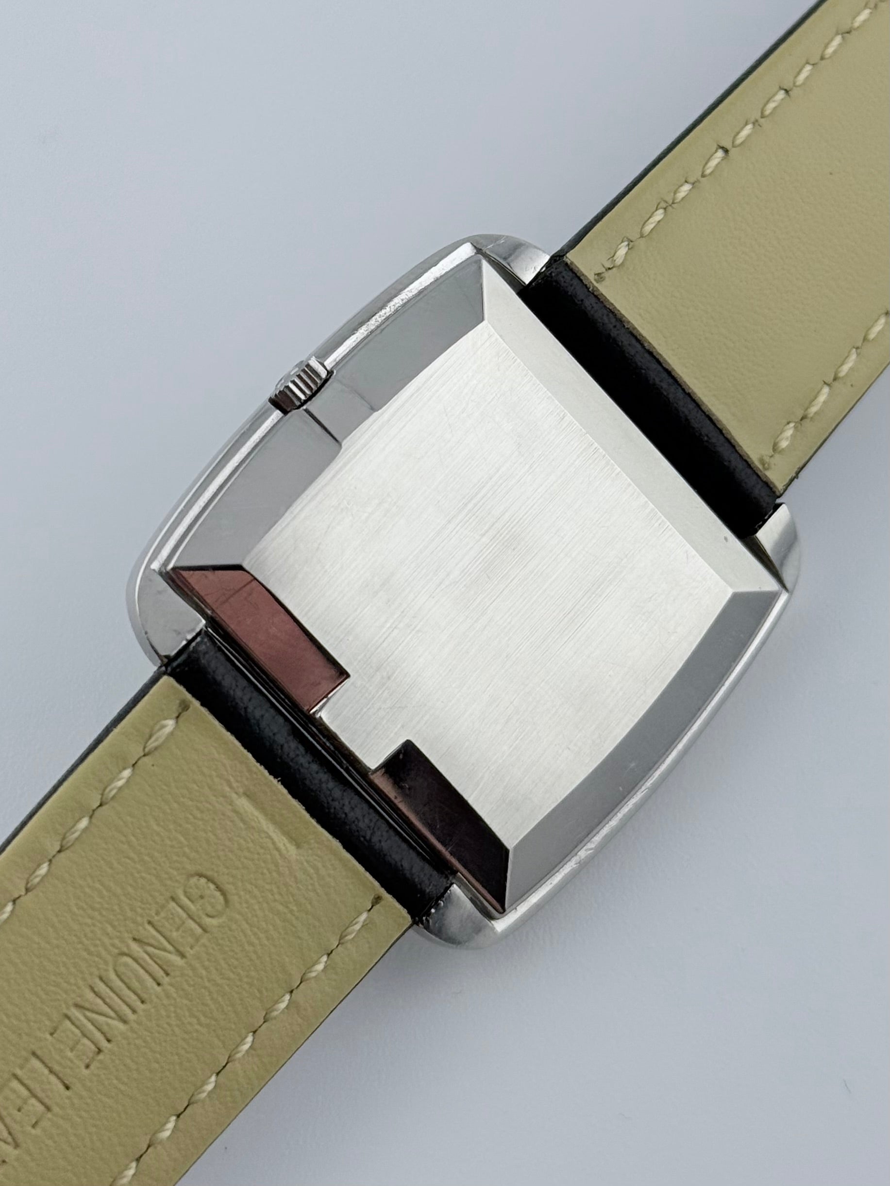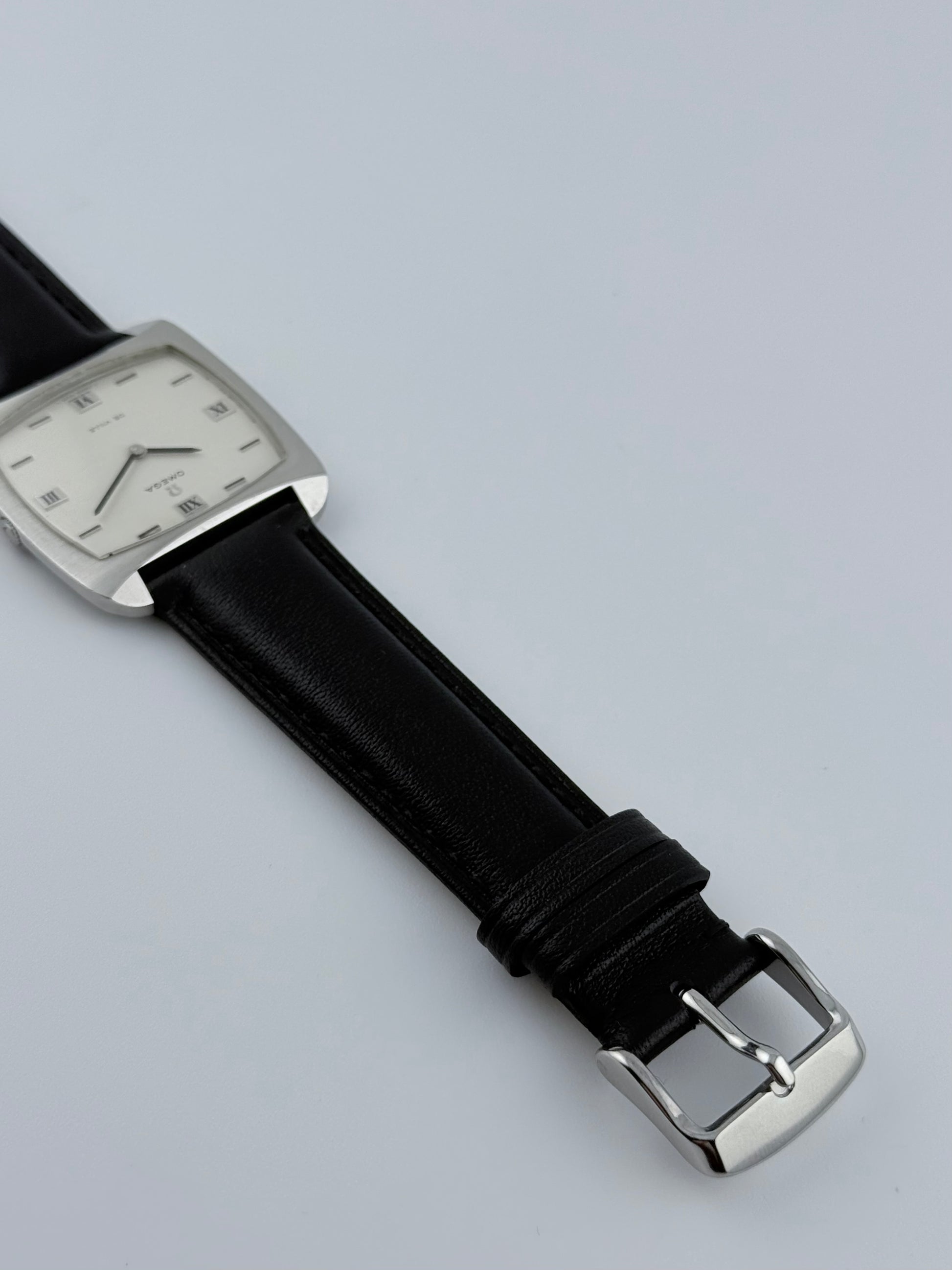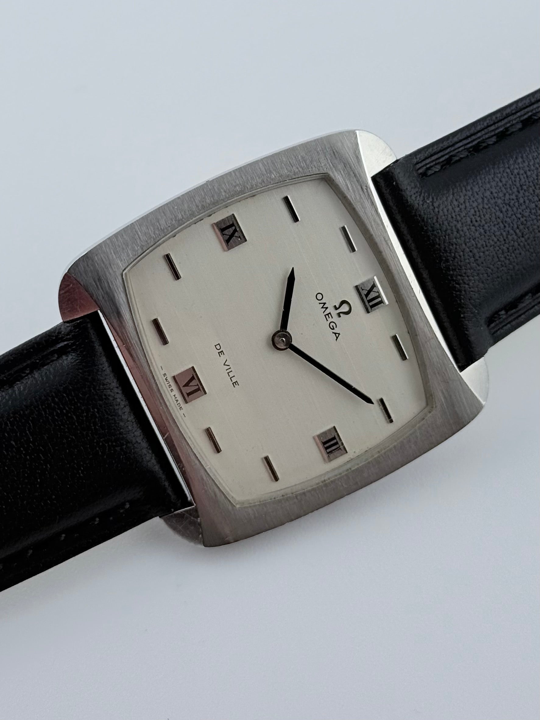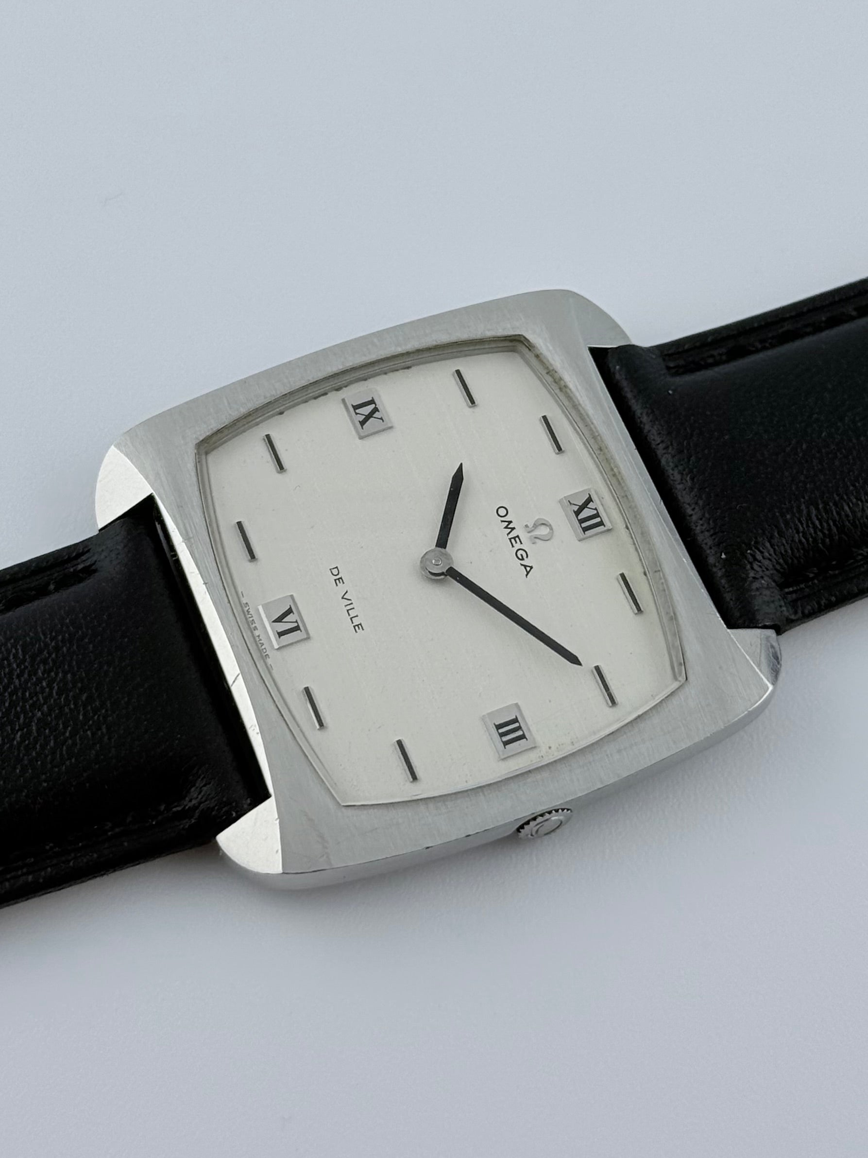 This is a timeless vintage Omega De Ville dress watch from 1970s which features a beautiful TV style case with horizontal brushwork on the front. The dial is a continuation of the case with horizontal brushwork on a white dial that includes applied baton markers containing roman numerals at the 12,3,6 and 9 positions. This all makes for a very unique and very 70s style. The watch has recently been fully serviced and is keeping excellent time, well within specification.