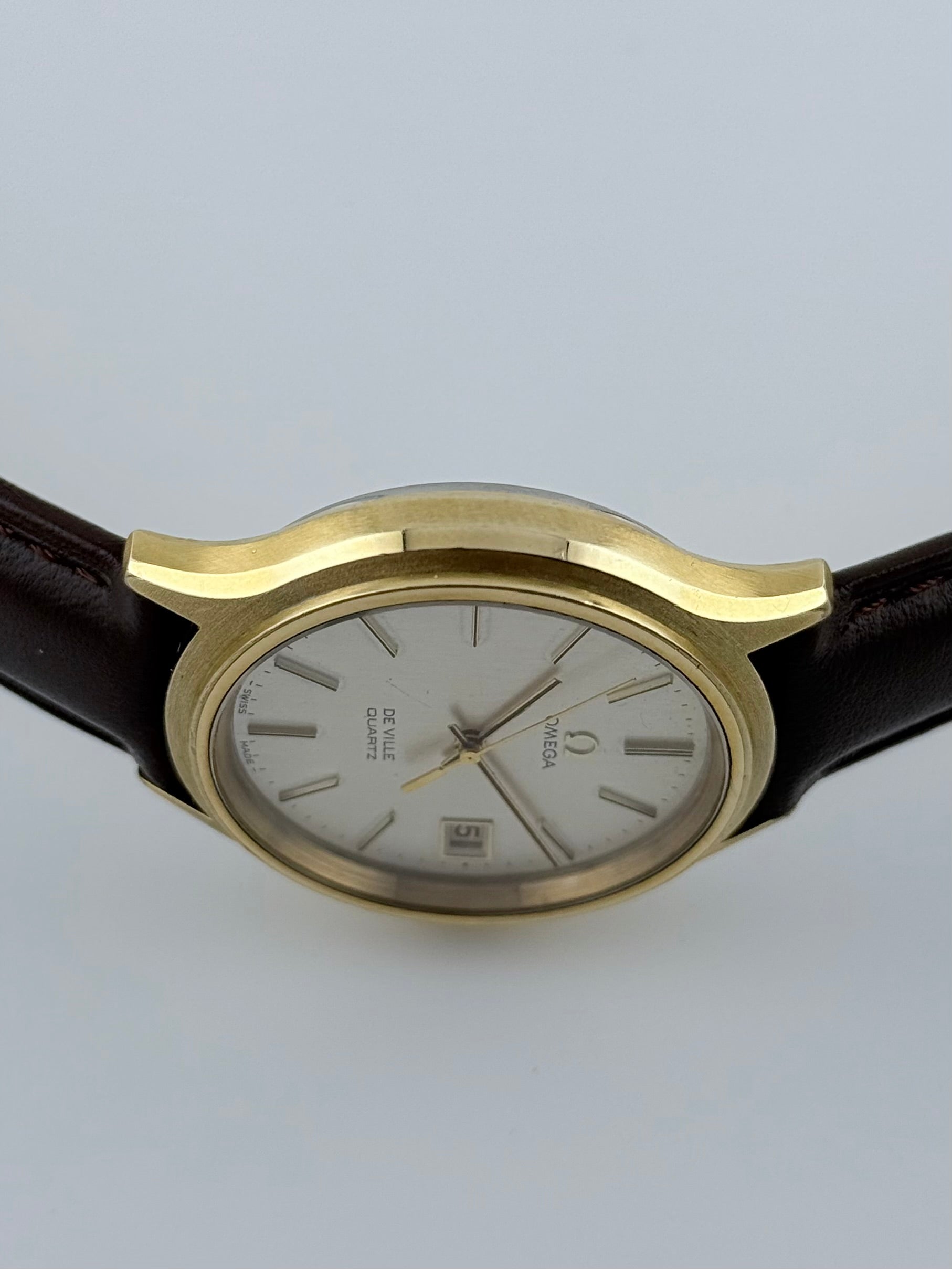 We have for sale a beautiful vintage gold plated Omega De Ville Quartz from the mid-1970s featuring a stunning combination of brushed silver tone dial with fine faceted gold baton indices, hands and a date complication encased in a good sized gold plated lovely case. The watch is in fantastic cosmetic condition as well as mechanical, working perfectly in all its functions, keeping excellent time.