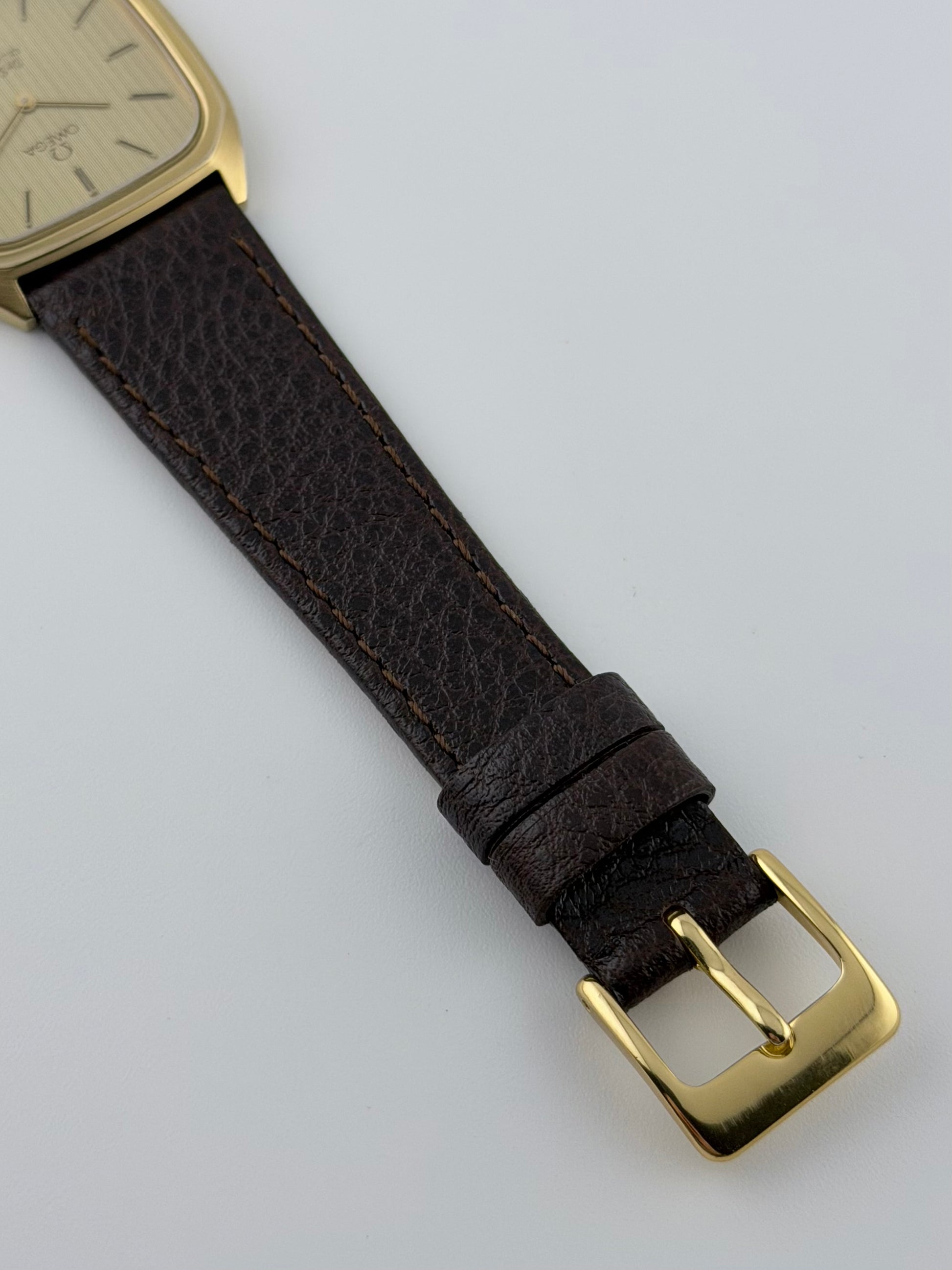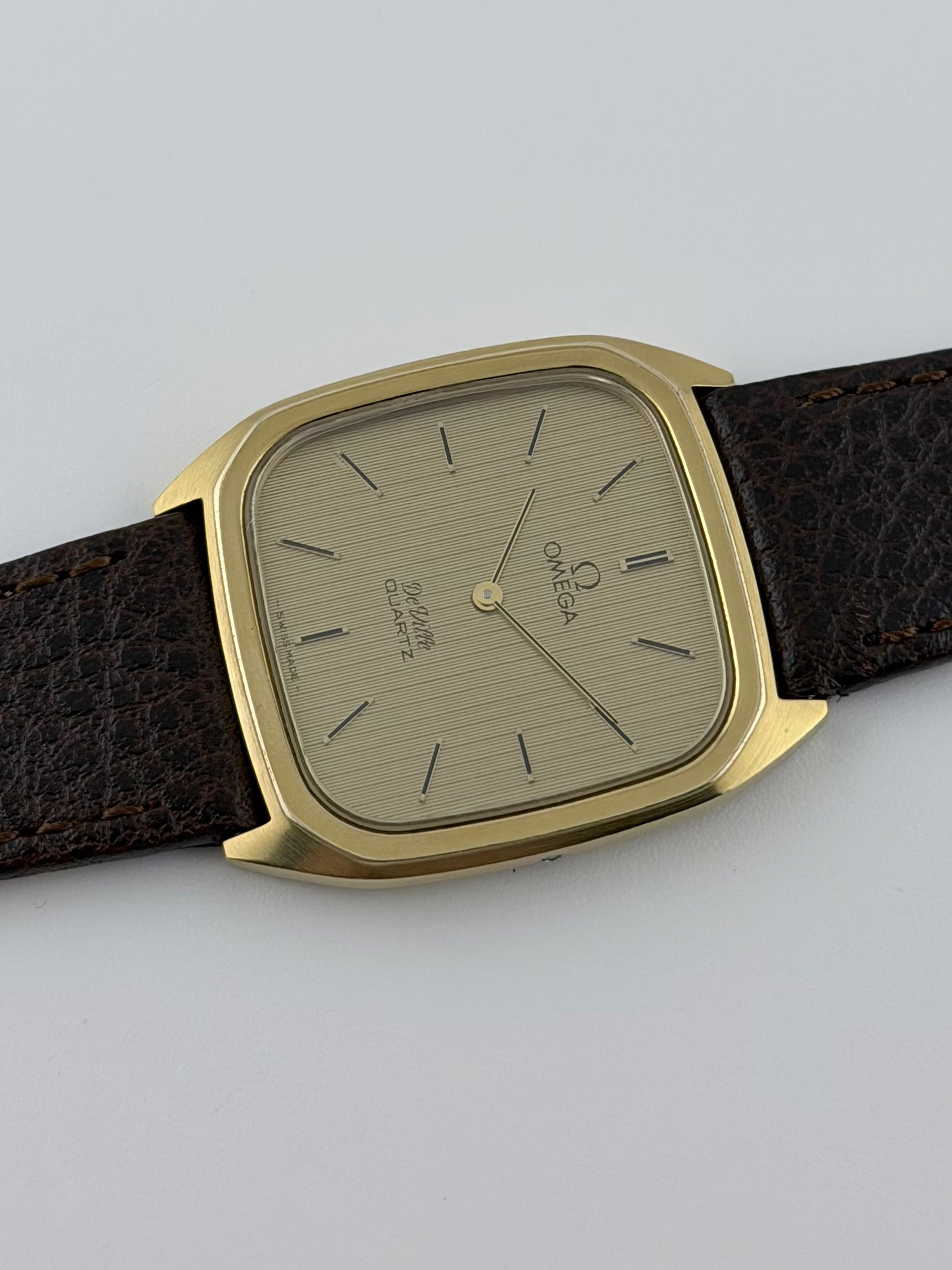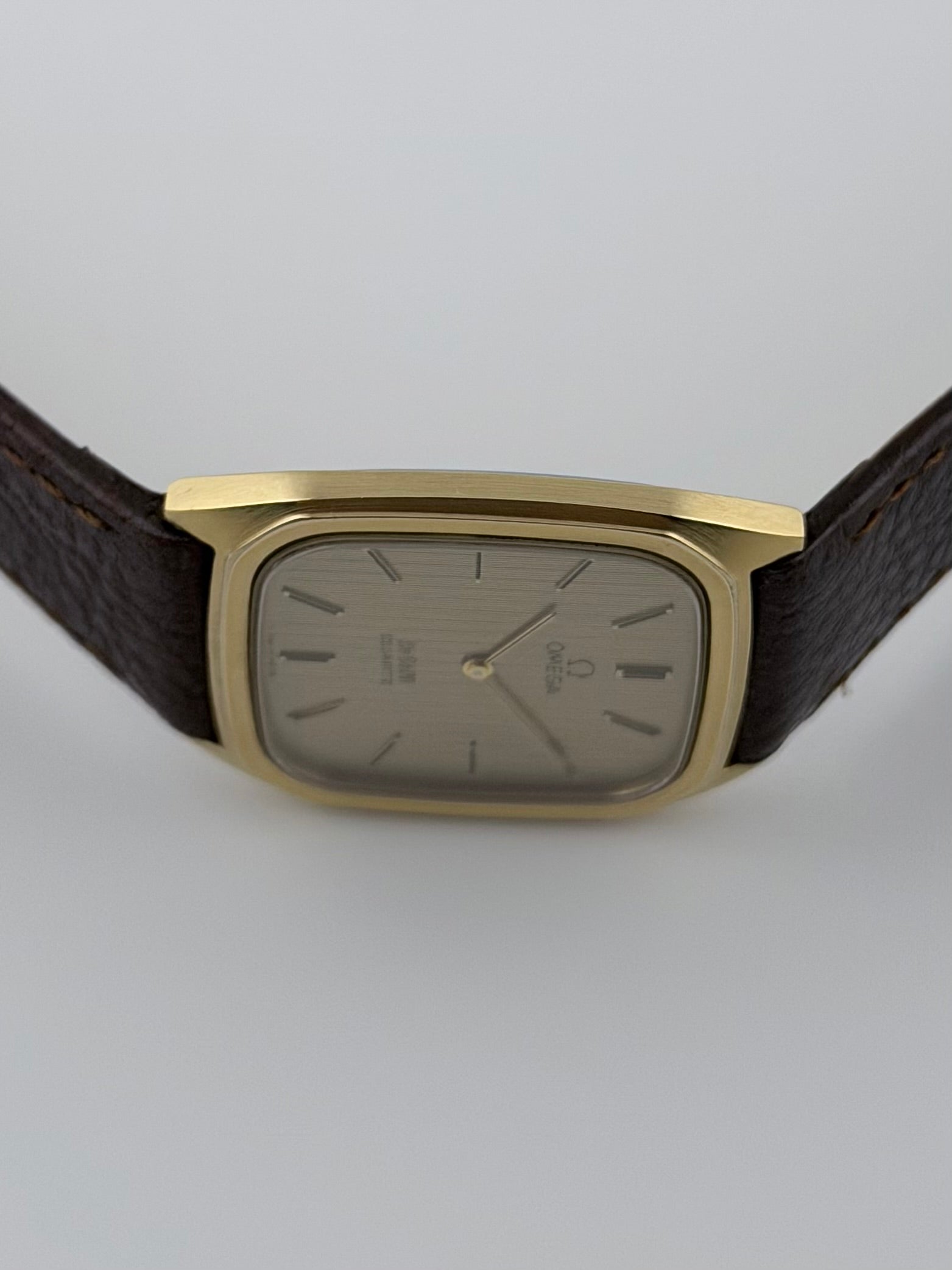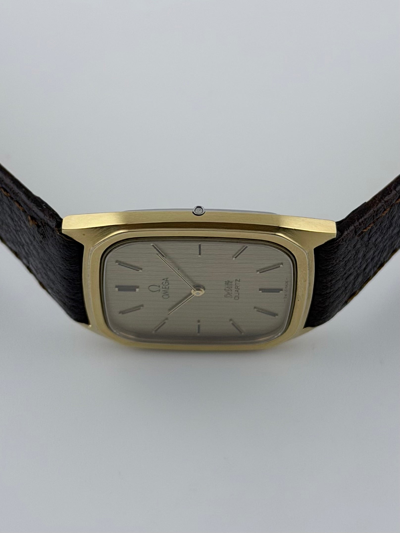 We have for sale a fantastic Omega De Ville Tank Quartz from the 1970s preserved in an outstanding condition. The gold plated TV shaped square case houses a beautiful, gold colour linen dial with stripe pattern, elegantly complemented by fine indices and hands. The watch is also in perfect mechanical condition, working perfectly and keeping excellent time.