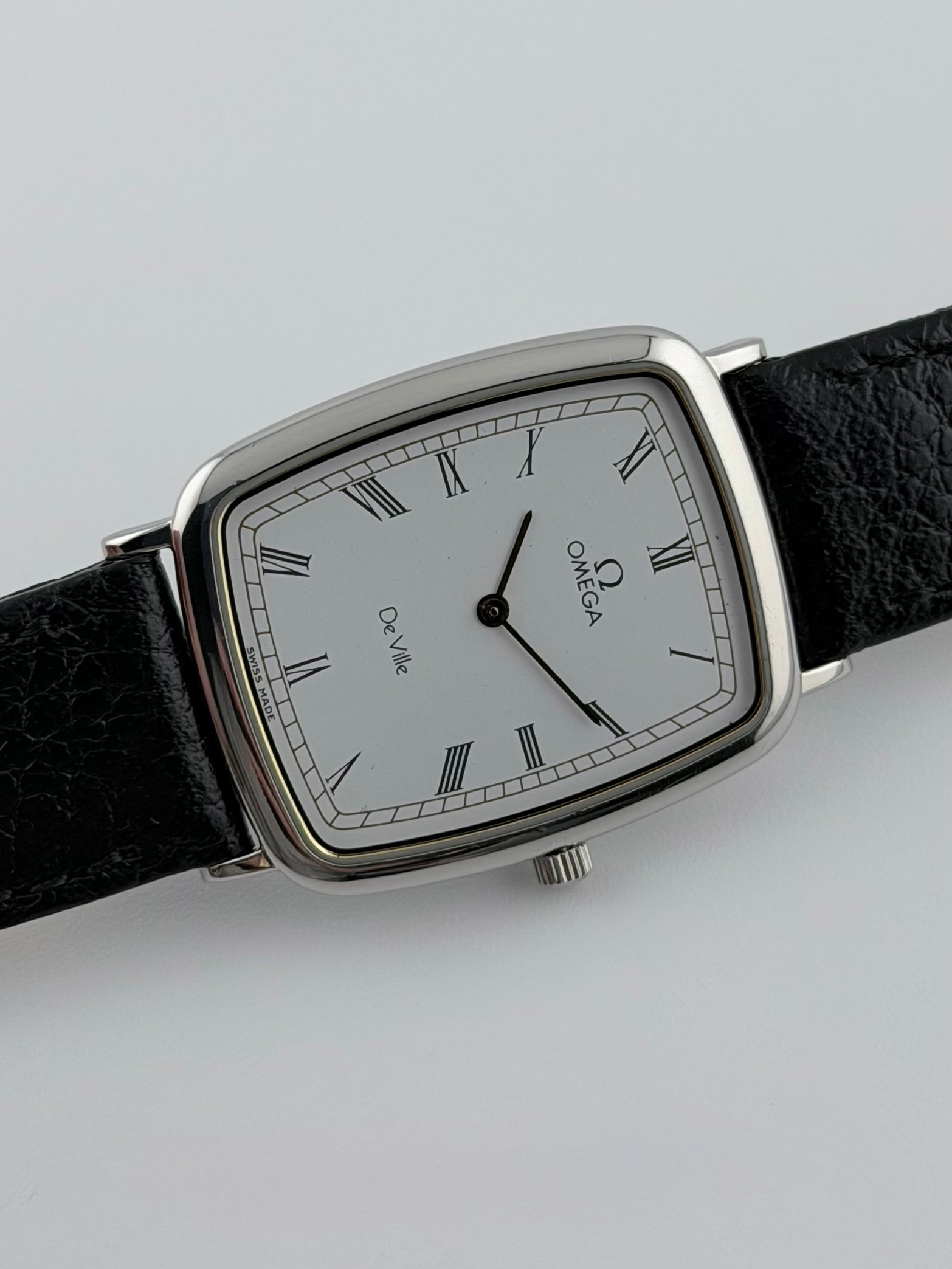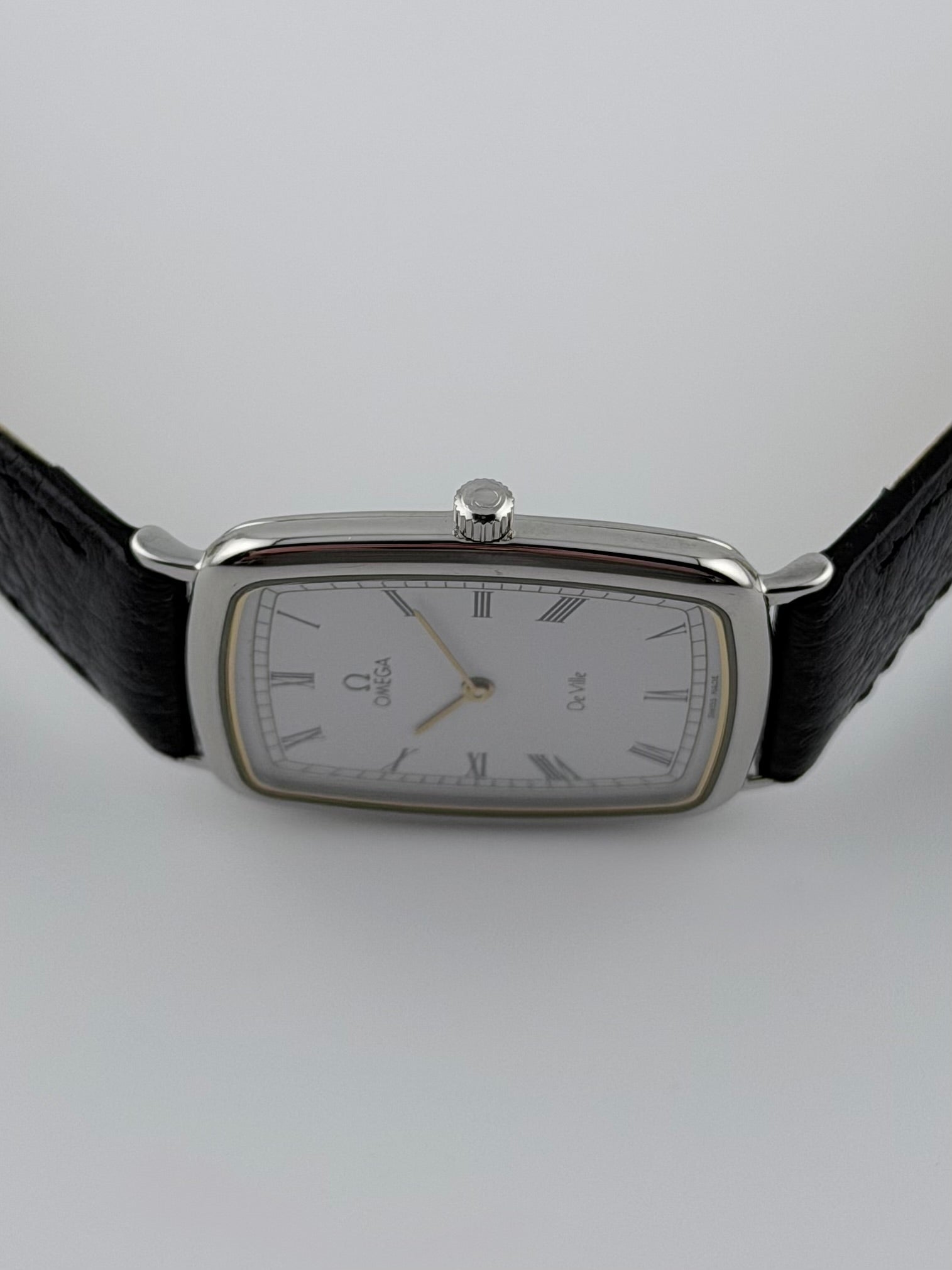 We have for sale a lovely Omega De Ville Quartz which features a beautiful crisp white dial displaying outer minute's trail track and hands in gold colour, contrasted with black, very fine Roman numerals encased in a stylish and elegant, polished stainless steel case. This piece is working perfectly in all functions and serves as a fantastic dress piece for men.
