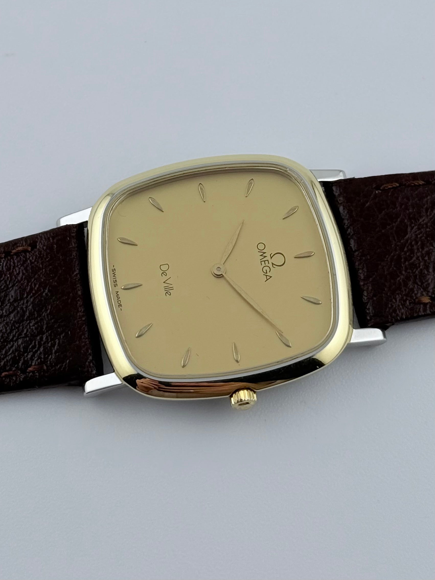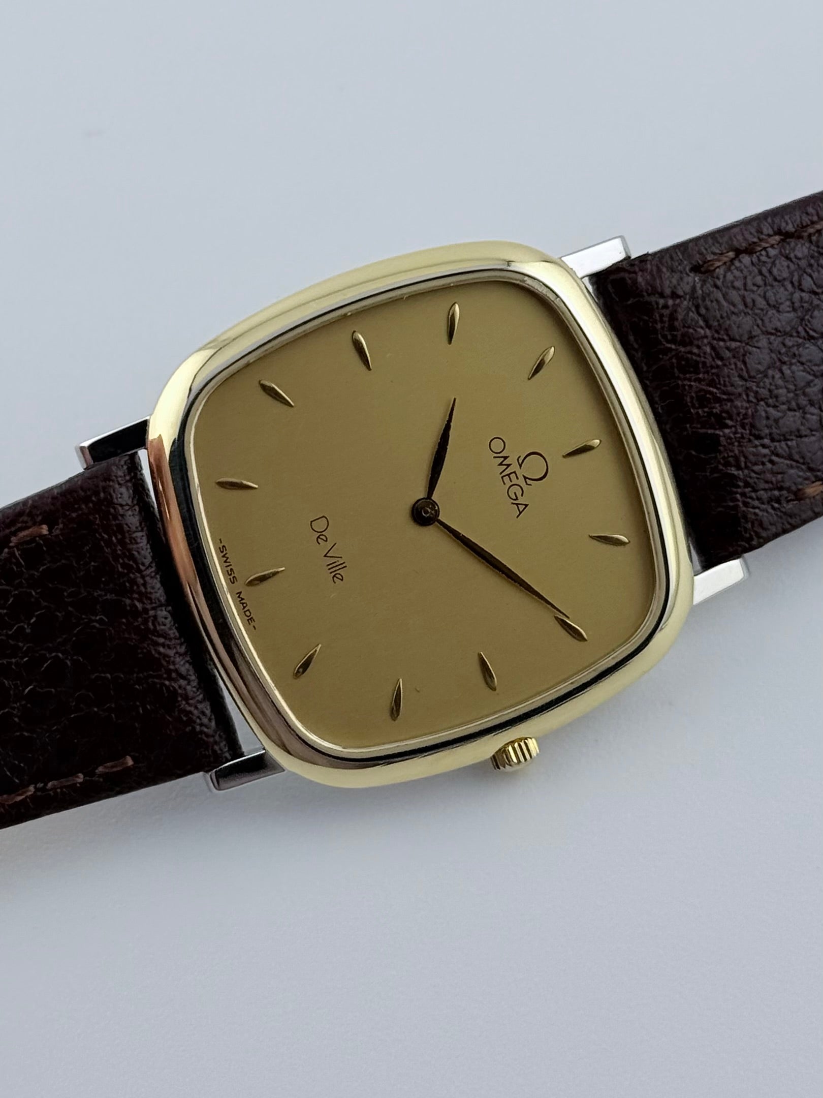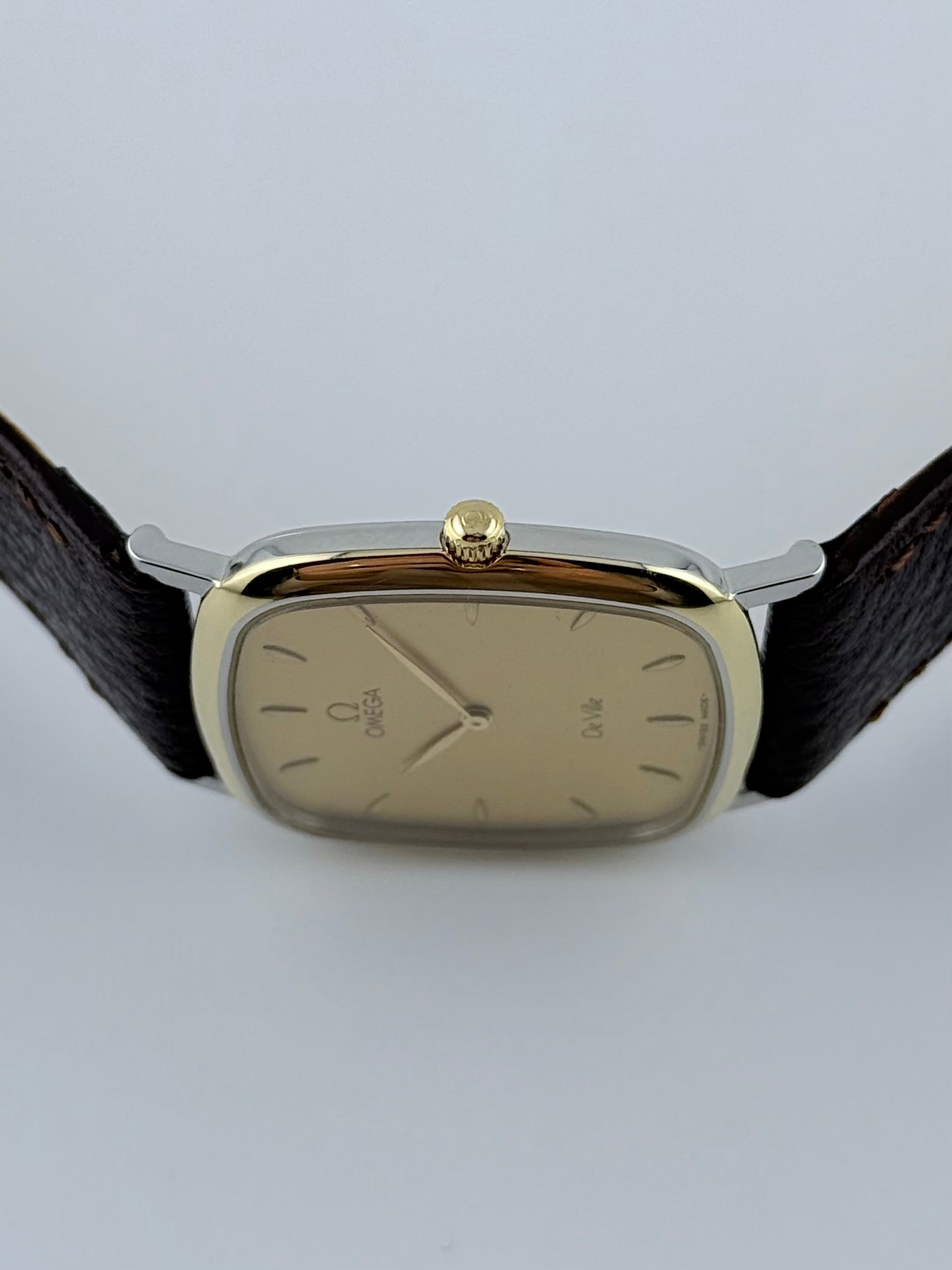 We have for sale a lovely Omega De Ville Quartz which features a beautiful gold coloured dial with gold hour markers and two hands. The watch is in great condition both cosmetically and mechanically. It is keeping perfect time.