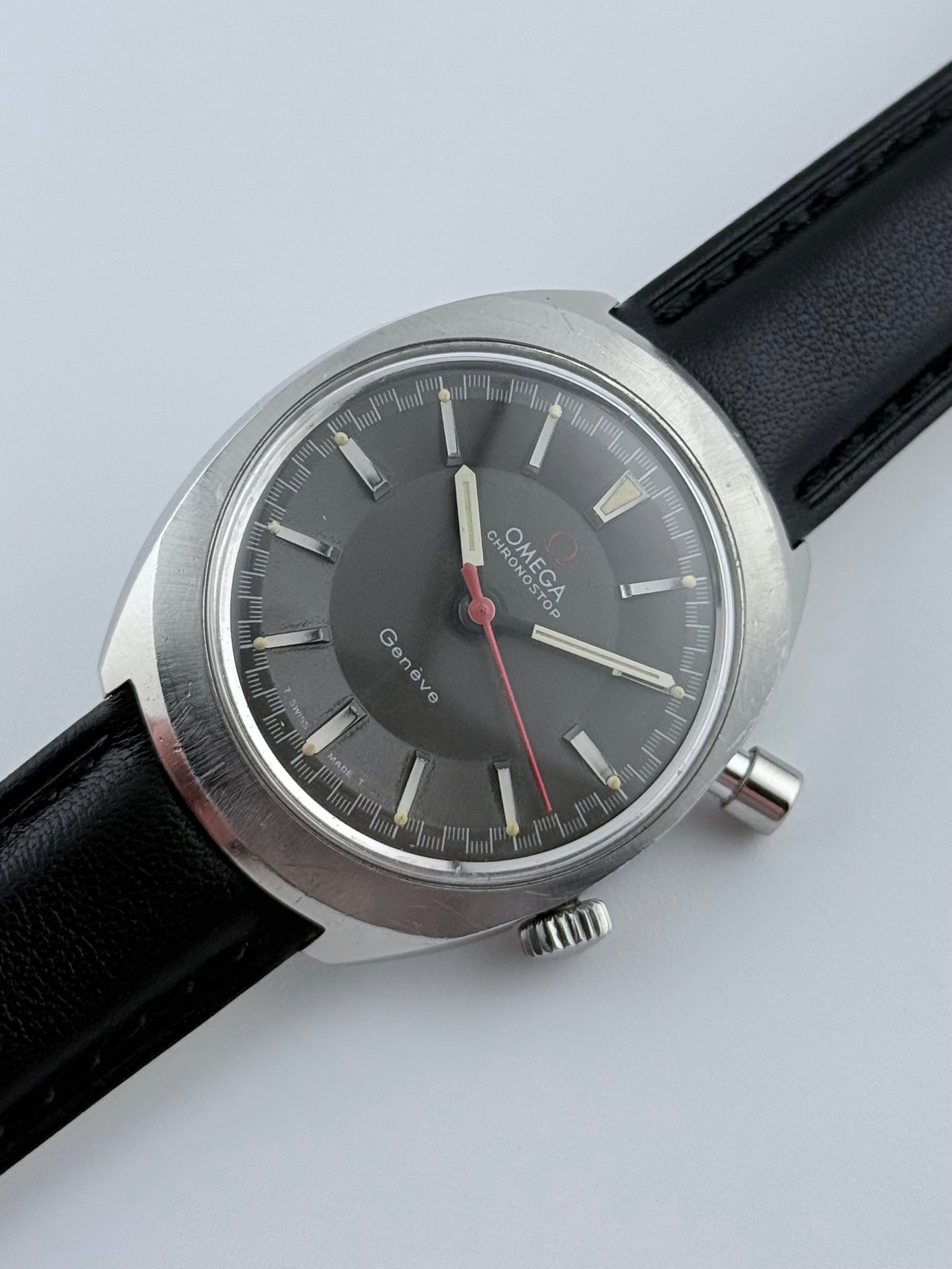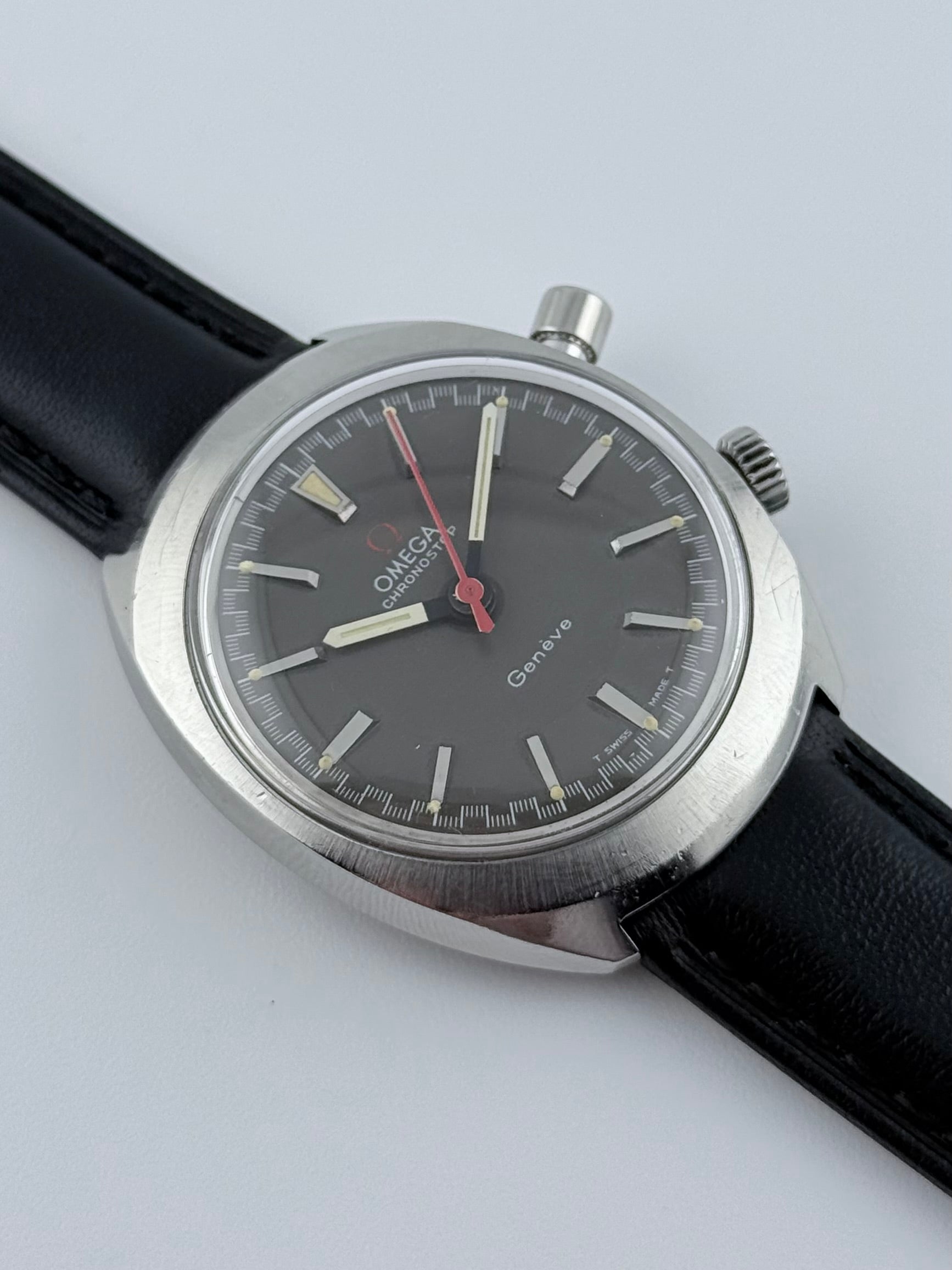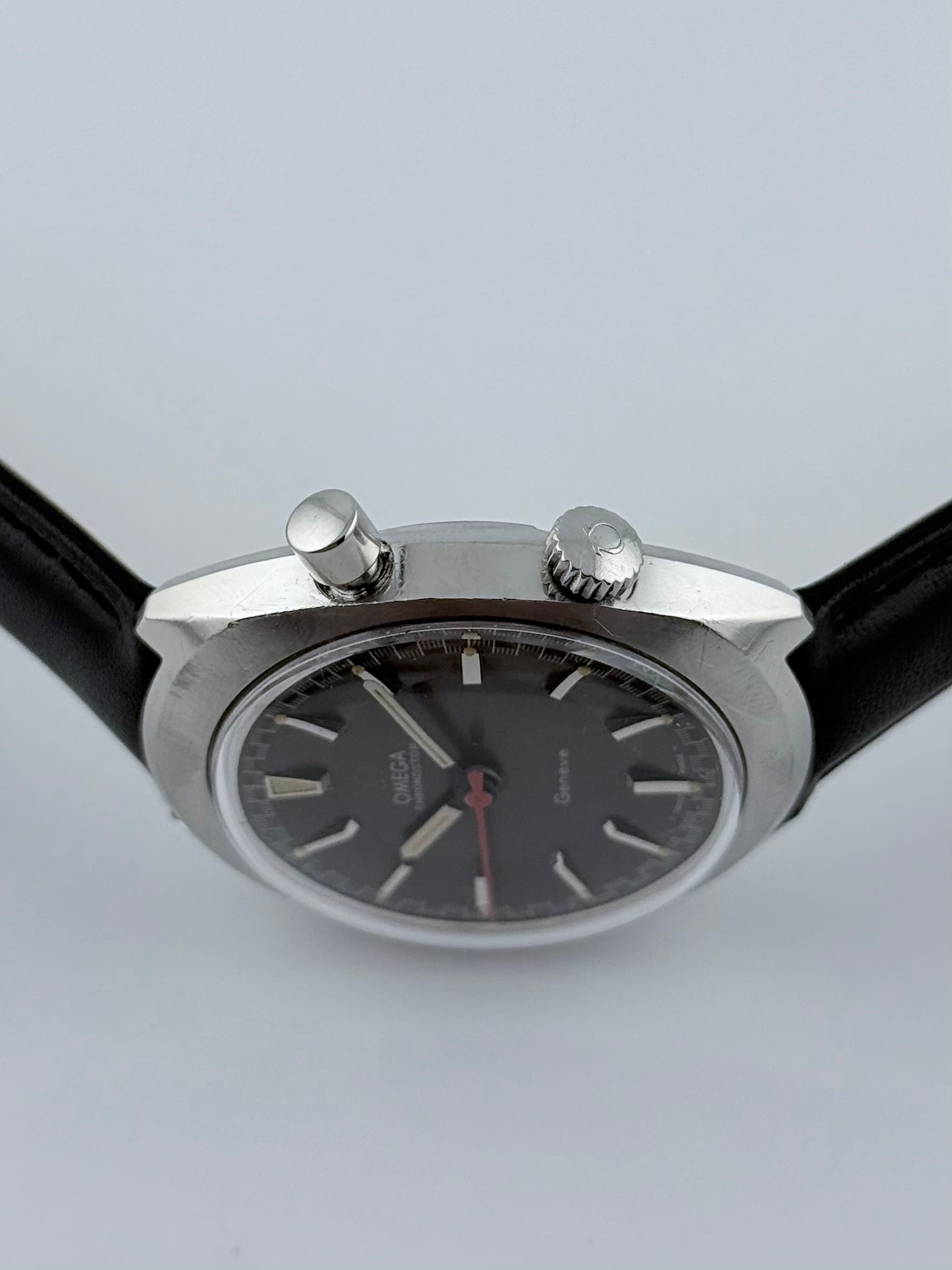 This is a fantastic looking watch - Omega Geneve Chronostop form 1968 in nice conditon. The watch features a matte black racing dial which displays a timing function which is activated by the pusher at the top right of the watch. Everything is working as it should and the watch is keeping excellent time, well within specification.