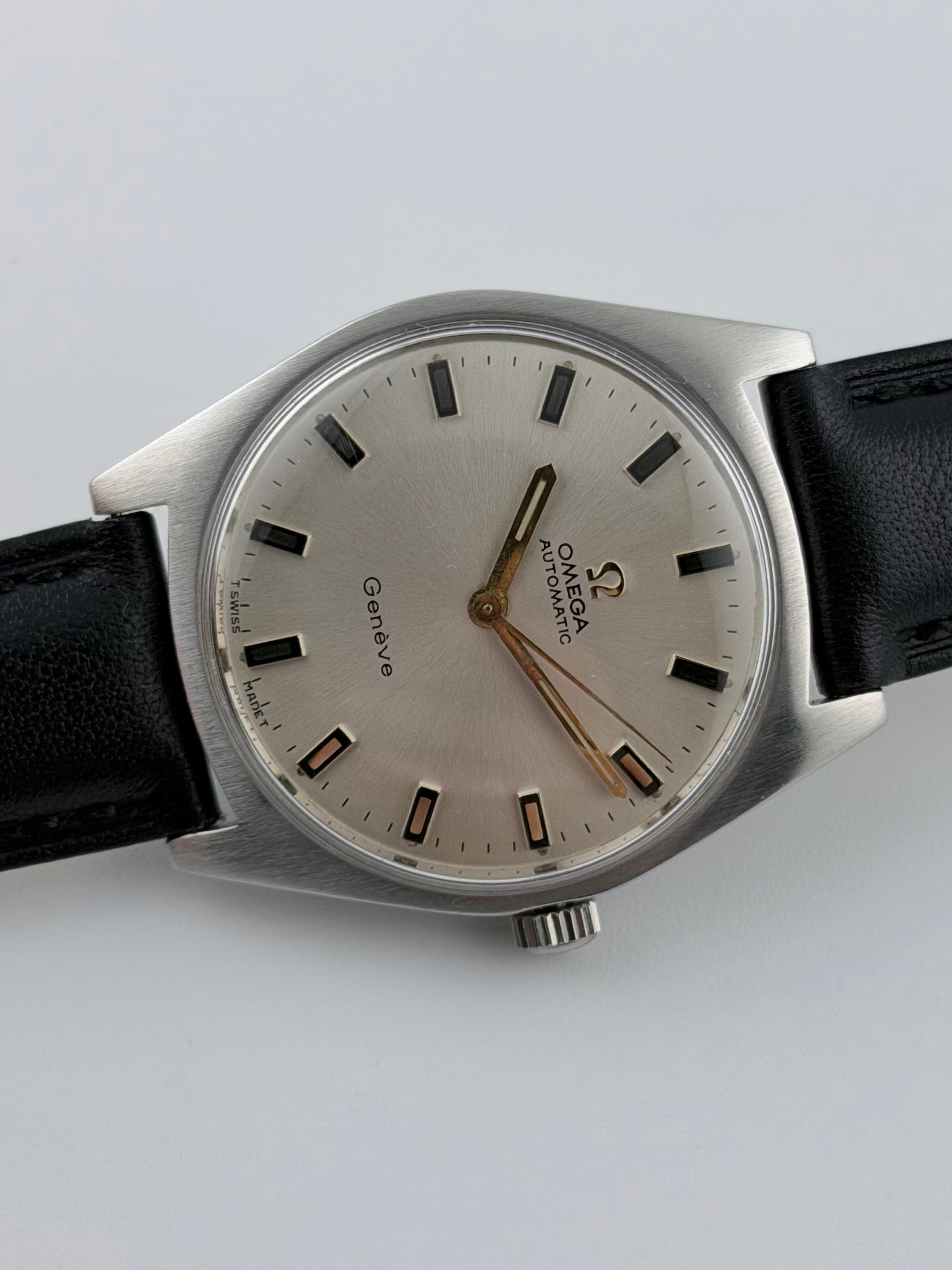 This stylish vintage automatic Omega Geneve from 1969 is in very nice vintage condition showing minor signs of wear and age. This piece features a spectacular brushed stainless steel case as well as the sunburst silver dial itself, which displays rare gold tone baton markers. The watch is keeping great time, well within specification.