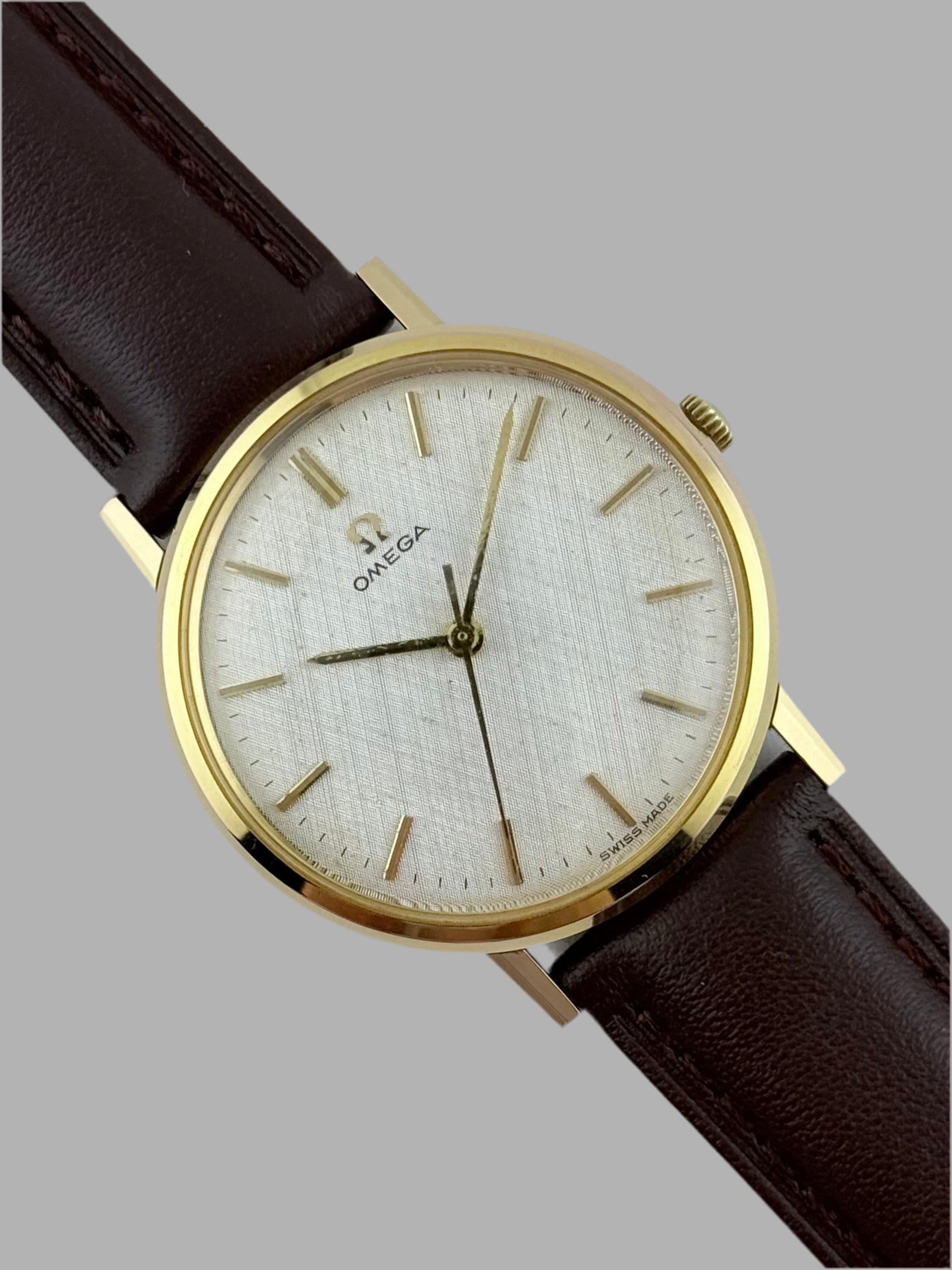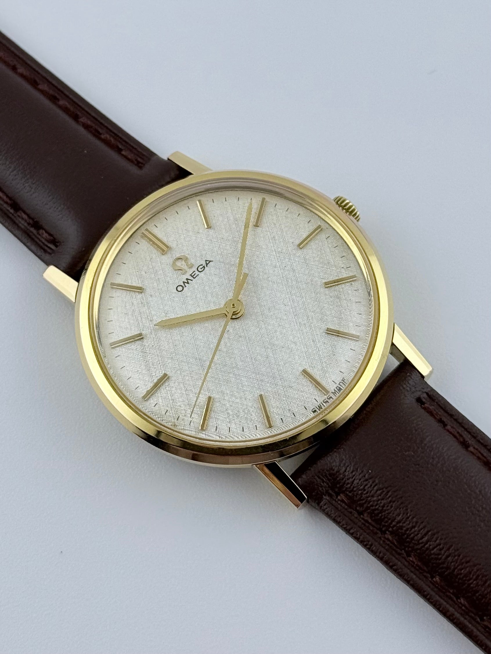 The Omega Linen dial is undoubtedly one of our favourite dial configurations, they just look stunning when catching the light! This particular example is no exception and is one of the rarely seen dials in the case reference 131.019.  The watch is showing just light signs of wear and is in perfect mechanical condition. The gold plated case front with the faceted hour baton markers and linen dial is hard to beat.