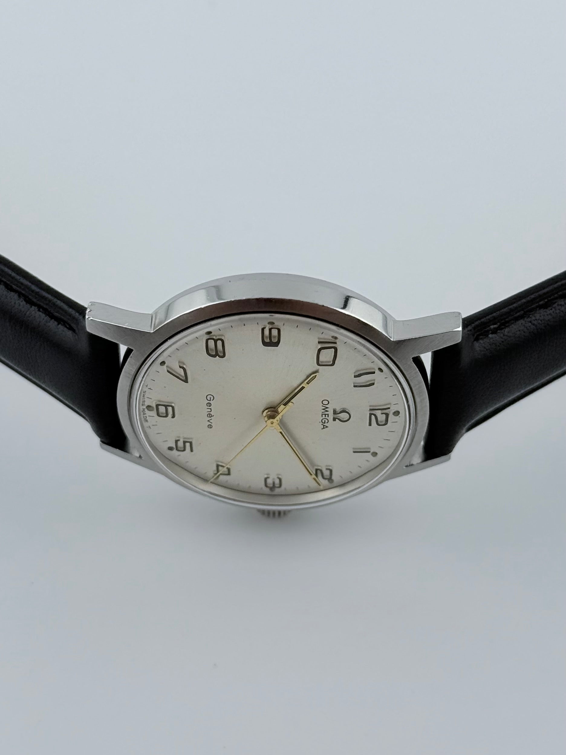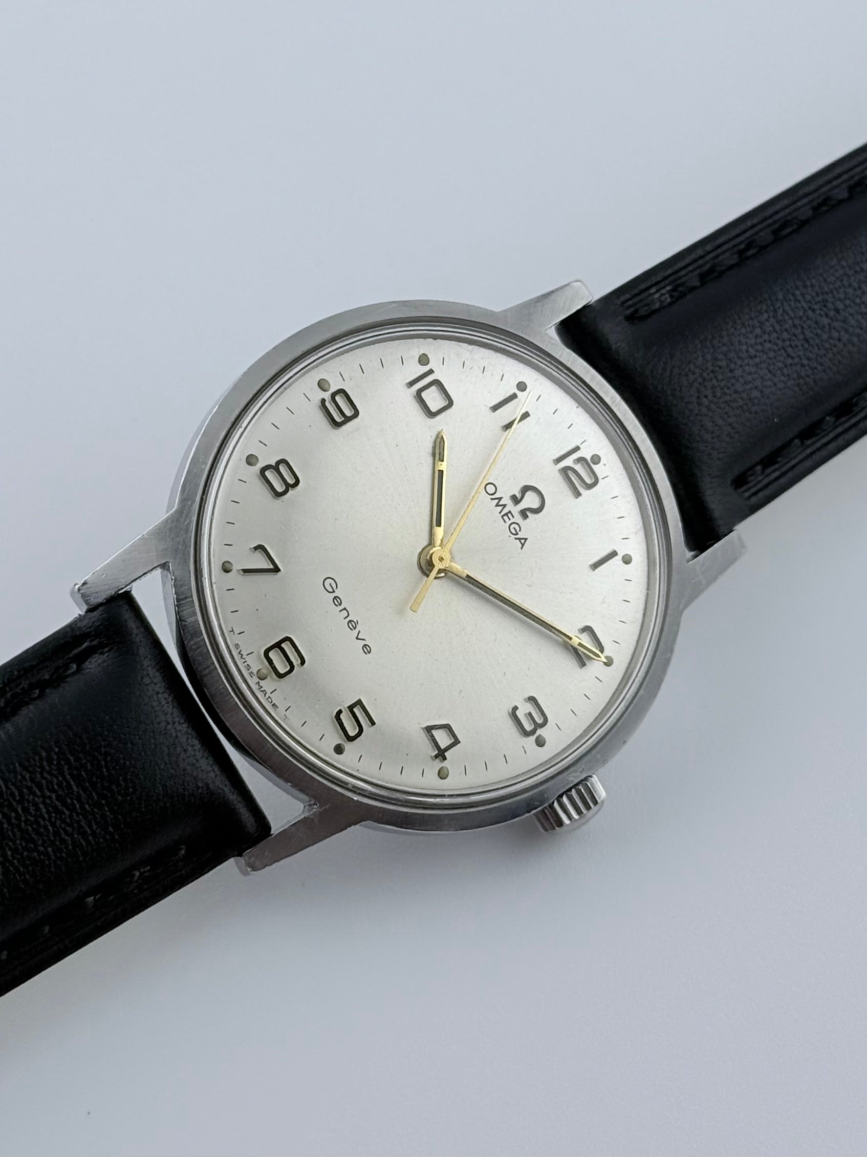 This is a beautiful manual wind Omega Geneve from the 1970s. This piece is working perfectly and is keeping good time, well within specification. This piece features a lovely and quite rare for this reference, Arabic configuration on a sunburst silver dial which displays black hour numerals. This example is in great condition for its age and we think it is a particularly attractive dial.