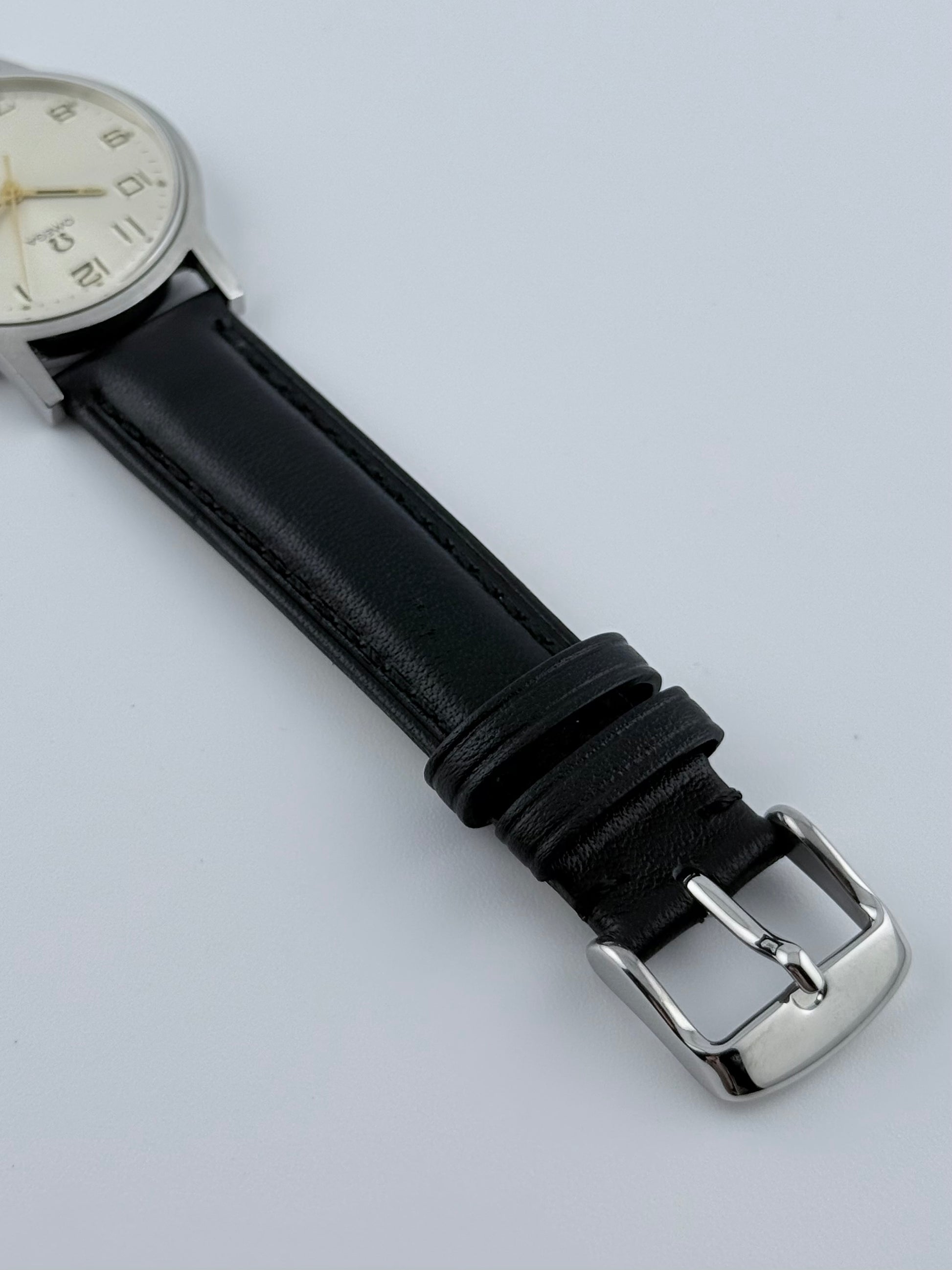 We have fitted the watch on a new black strap which suits it perfectly and has a luxurious look and feel on your wrist!