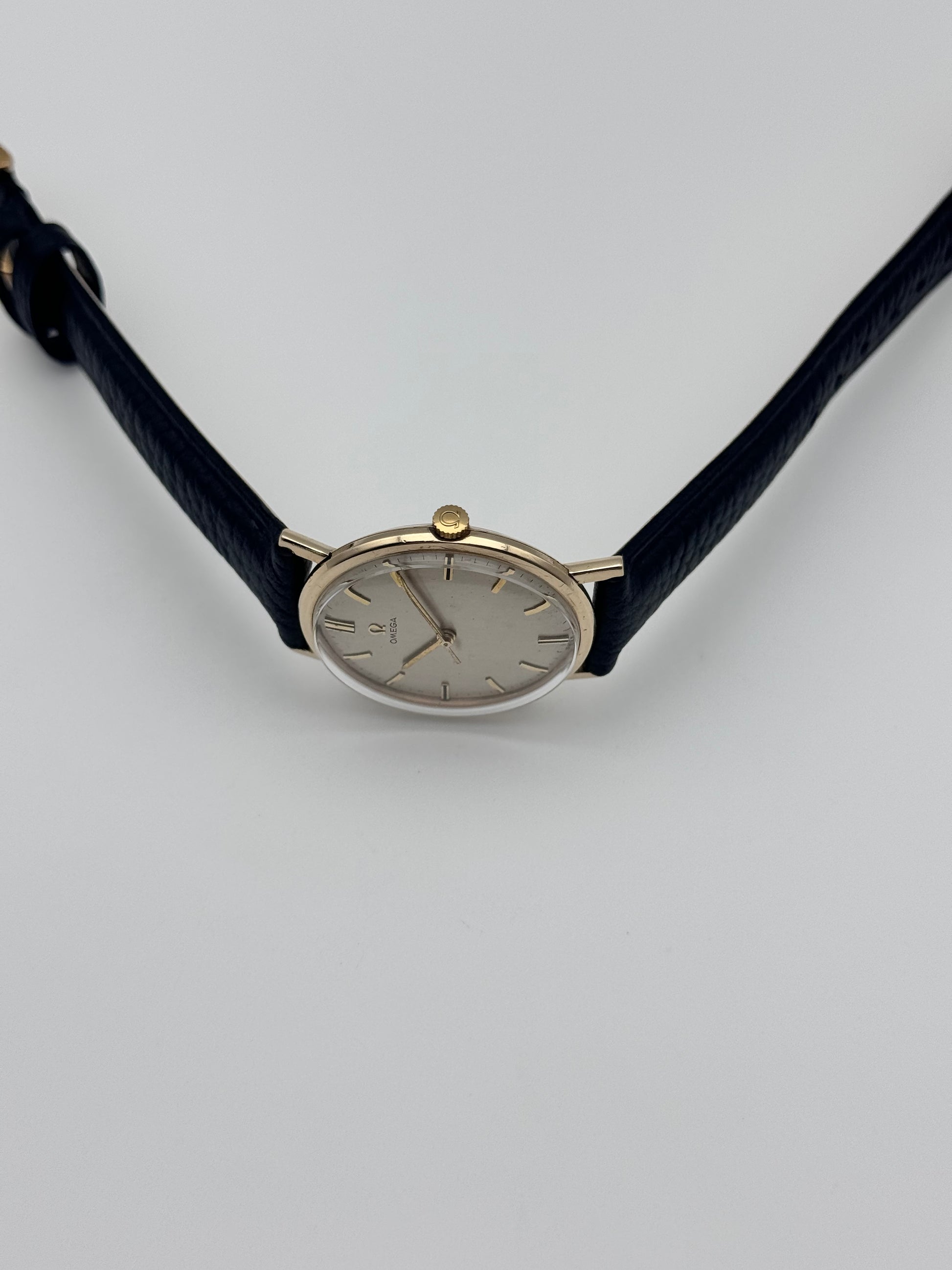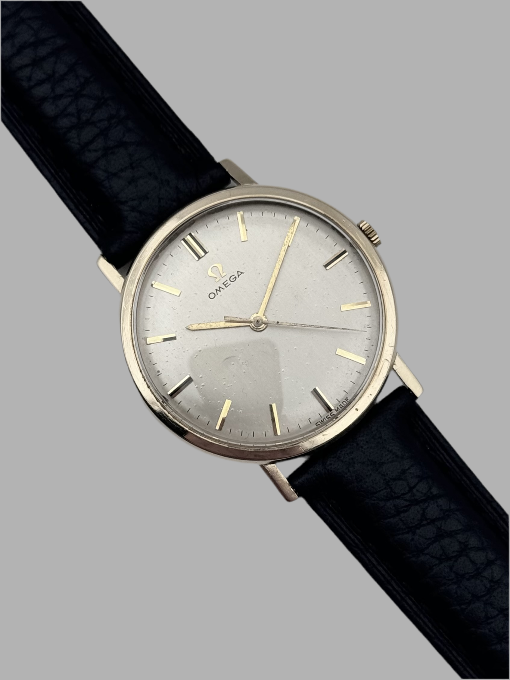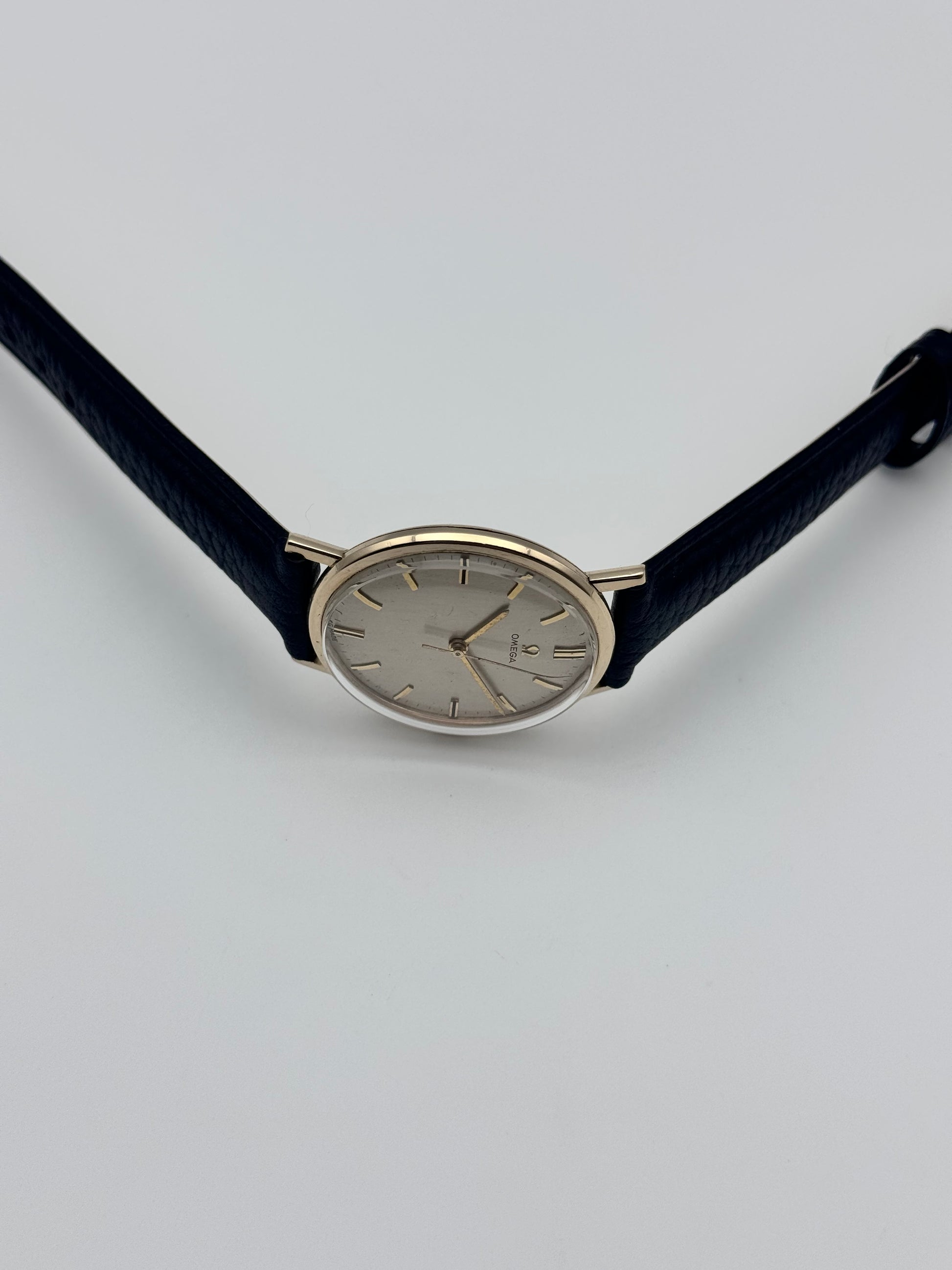 This is a stunning solid 9ct gold Omega Geneve from the 1960s. The watch is in overall spectacular condition for a watch of this age. This piece features a 9ct yellow gold case which holds a stunning silver brushed dial. Mechanically this watch is in excellent condition and keeping good time within specification.