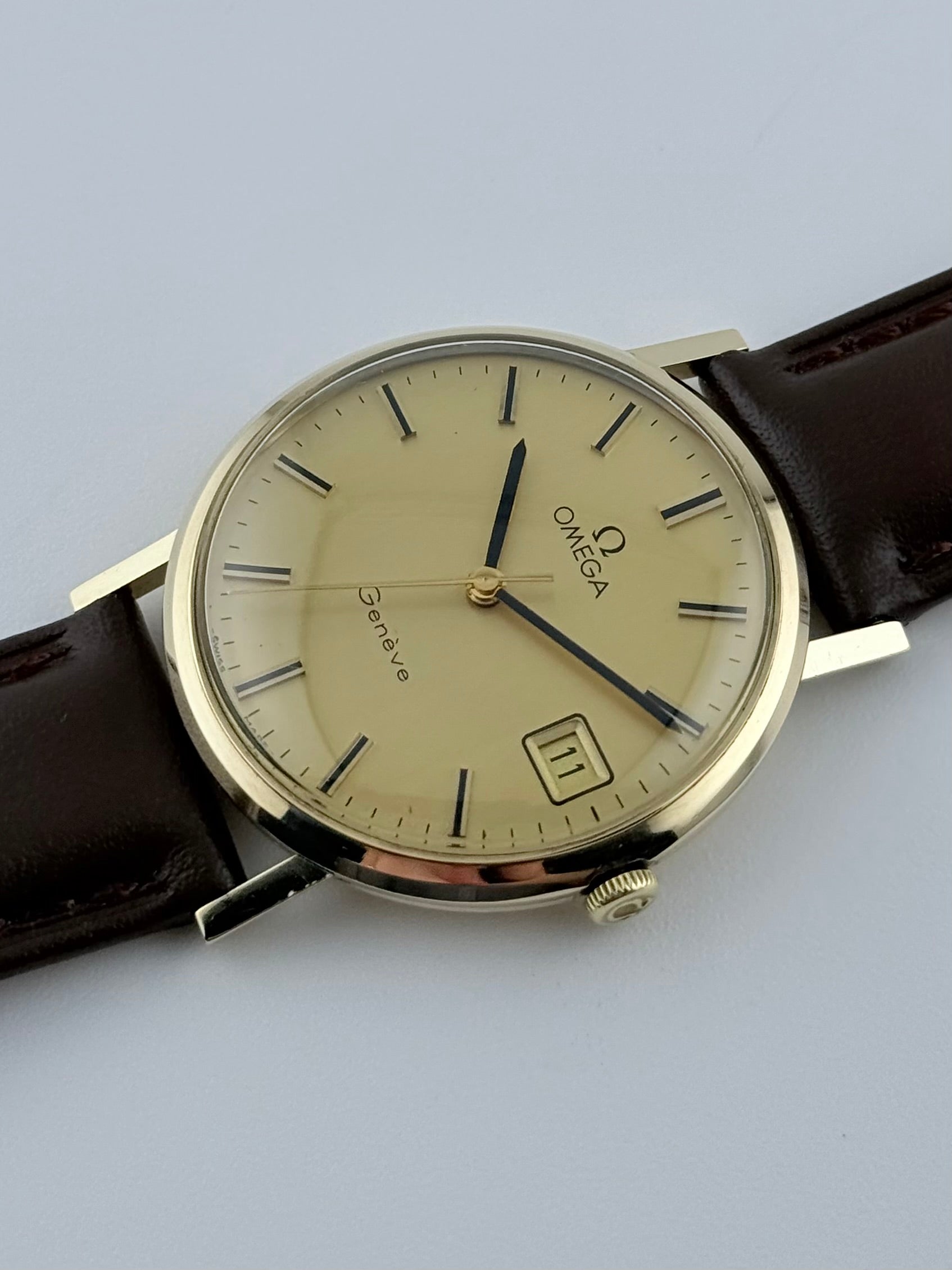 This is a gorgeous vintage solid 9ct yellow gold Omega Geneve Manual Wind with date function which features a stunning gold dial which is in fantastic condition. This piece is in amazing condition showing signs of light wear. Mechanically, this piece is working absolutely perfectly and is keeping great time within specification.