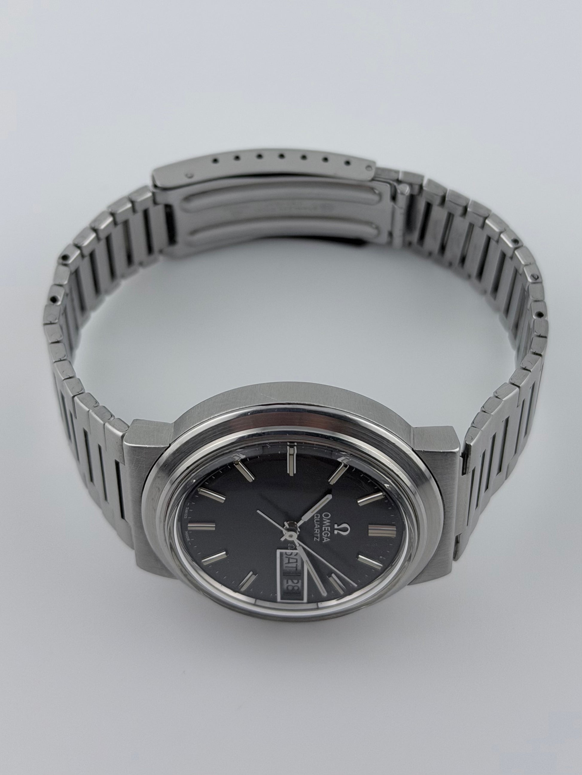 This is a stunning vintage Omega Quartz Day-Date, a classic 1973 vintage timepiece in excellent original condition. This stylish piece features a sleek black dial with sharp faceted indices and a silver colour day/date windows at 3 o’clock, powered by Omega’s reliable quartz movement. Housed in its original stainless steel case and fitted with the matching original bracelet, it offers timeless 1970s design with everyday wearability. The watch is also in excellent mechanical condition, working very well, keeping excellent time.