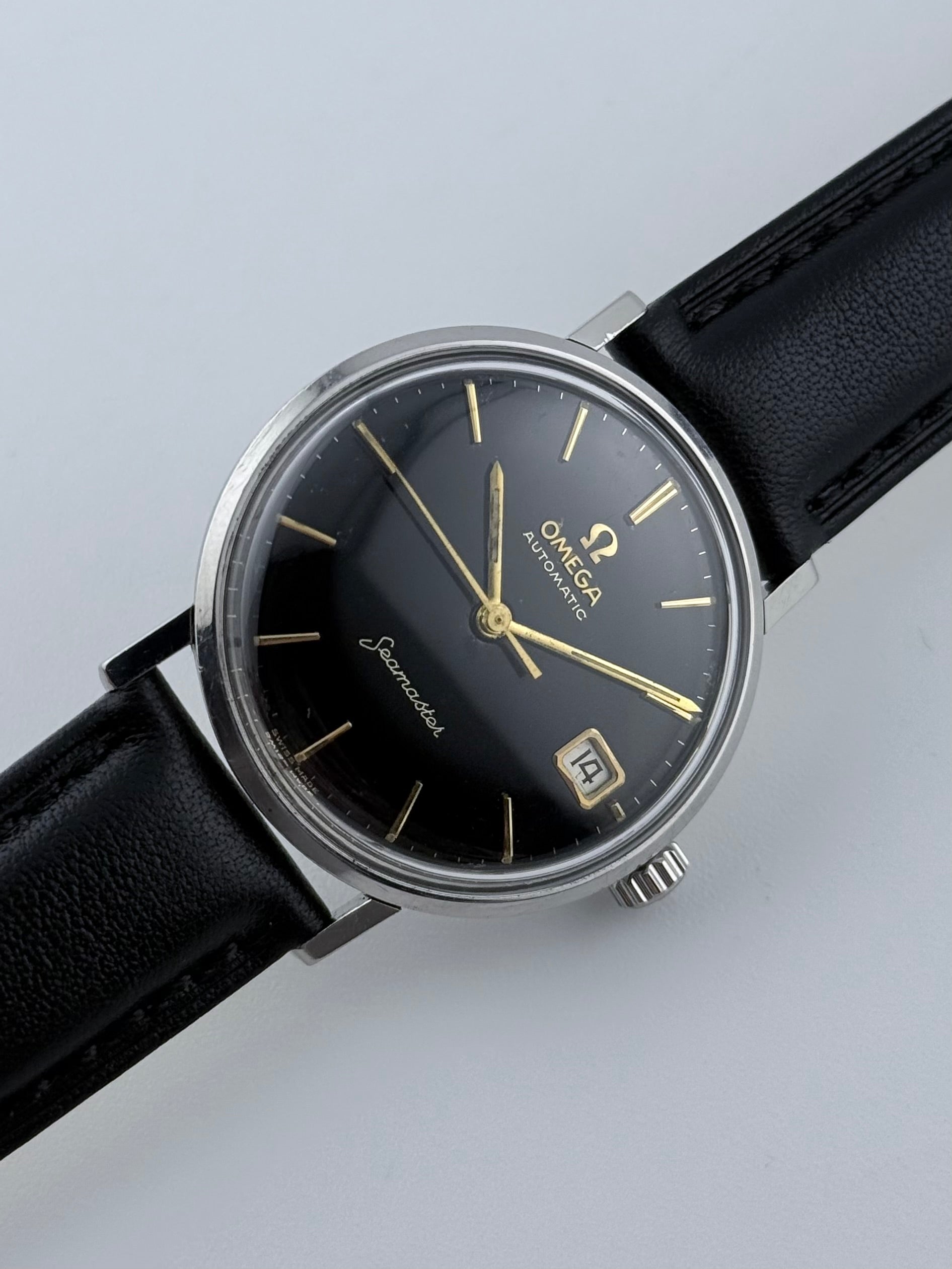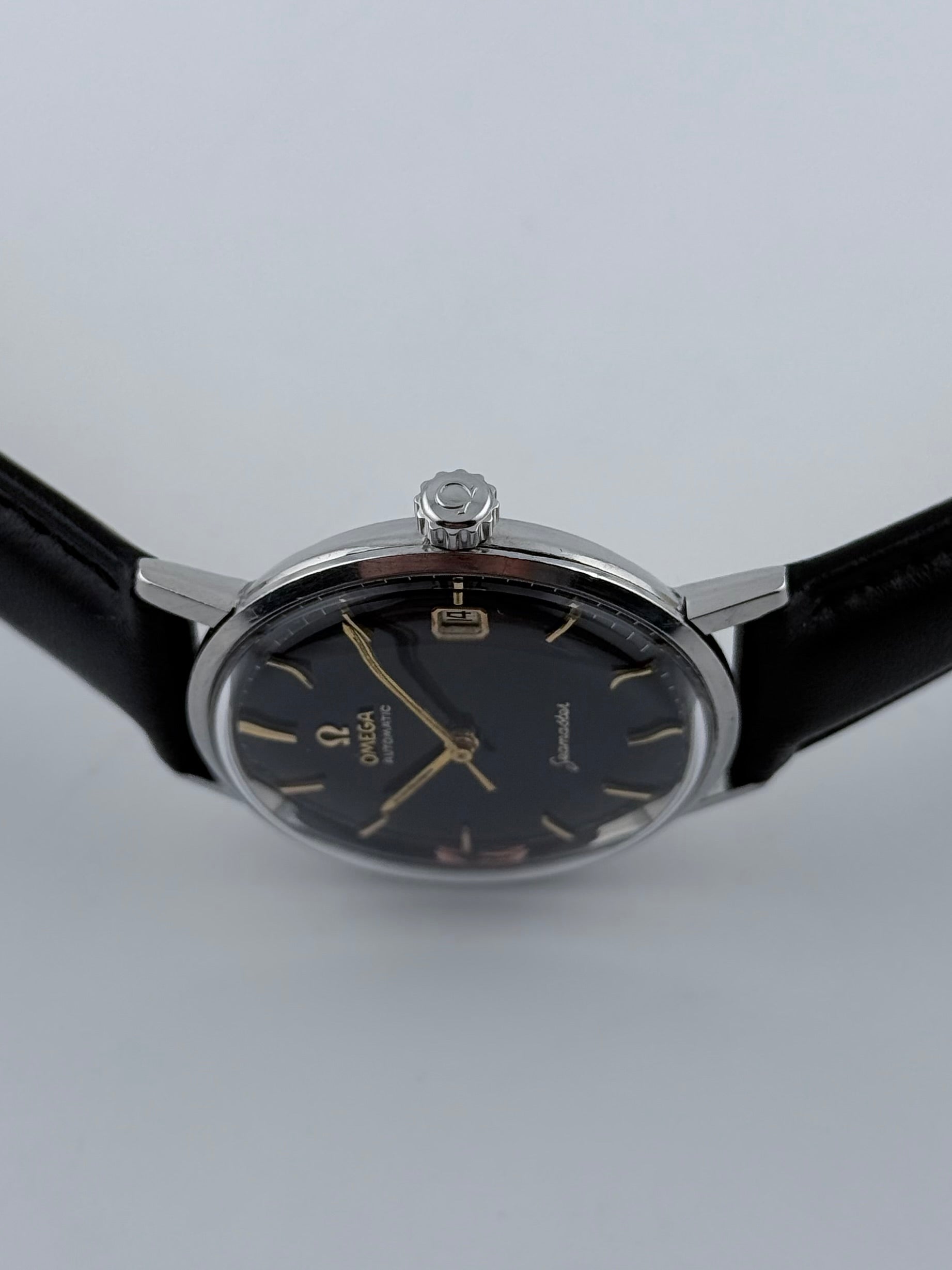 This is a lovely Omega Seamaster from the early 1960s which is in brilliant condition for its age. This example features a wonderful black dial with gold baton markers which has some light patination. The watch has a date complication and has just been fully serviced and mechanically is working perfectly.