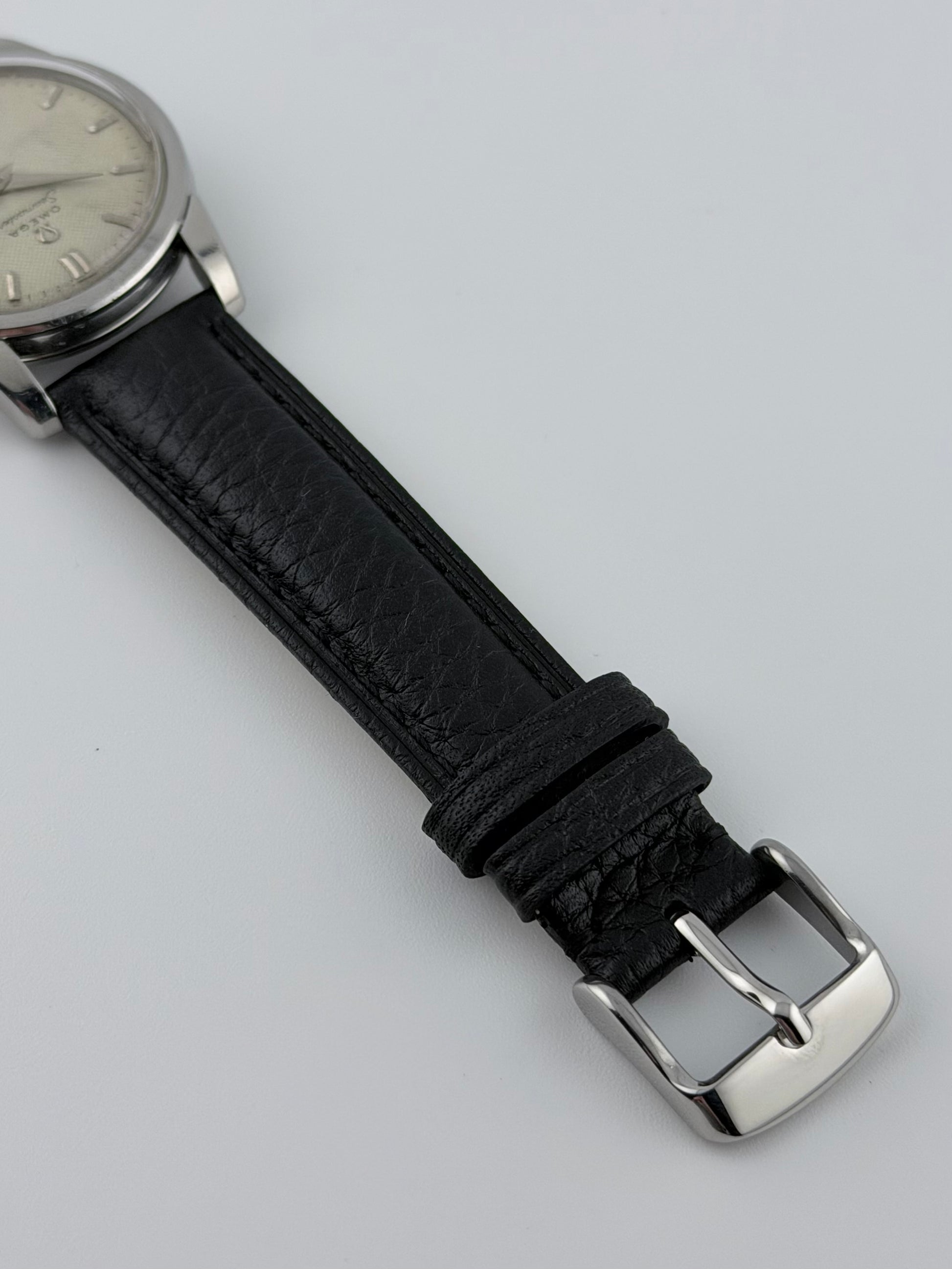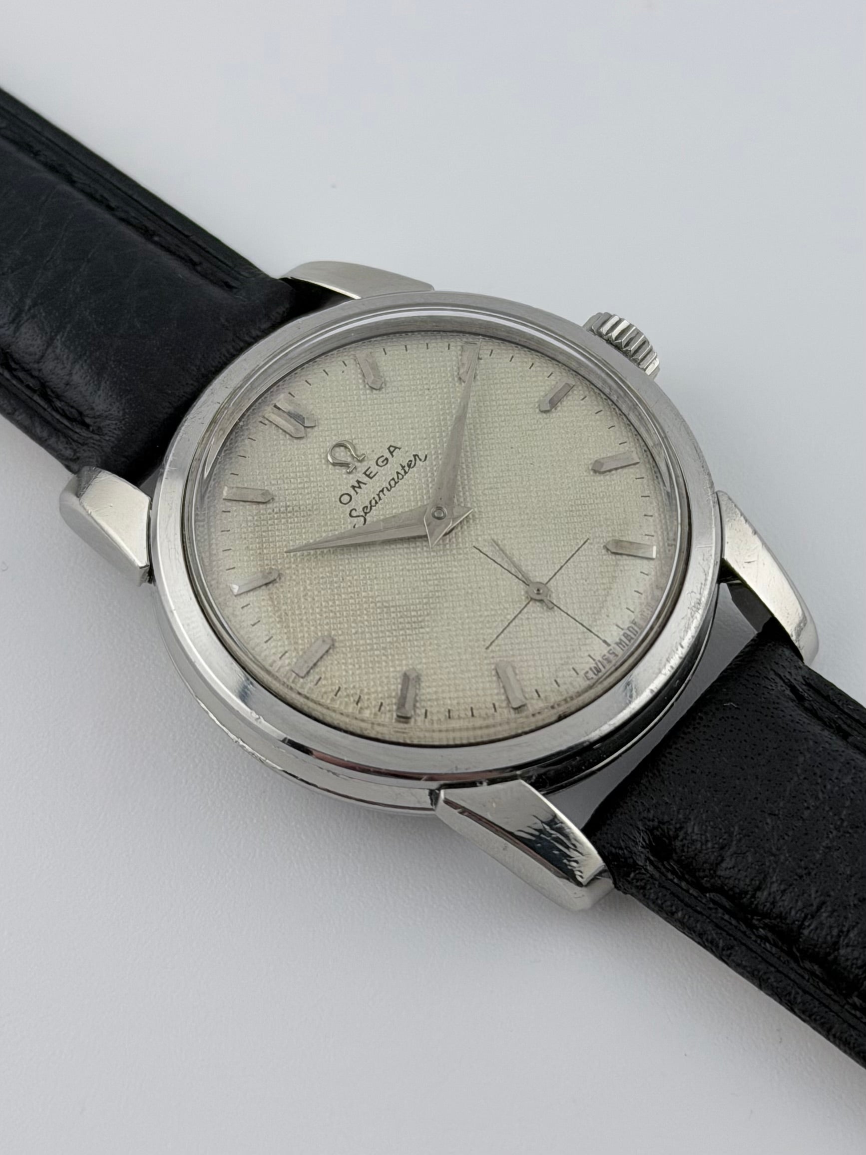 This is an exquisite and rare vintage Omega Seamaster from the mid-to-late1950s featuring a stunning honeycomb dial, a textured surface created by a finely stamped geometric pattern diagonally that gives the dial remarkable depth and vintage character. This distinctive texture was produced in limited numbers during the 1950s and has become highly sought-after among collectors. The dial is further enhanced by multi-side faceted indices, large Dauphine hands and Crosshair sub-seconds. The watch is in fantastic working order and is keeping excellent time within specification.